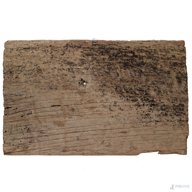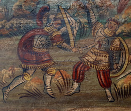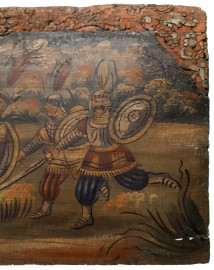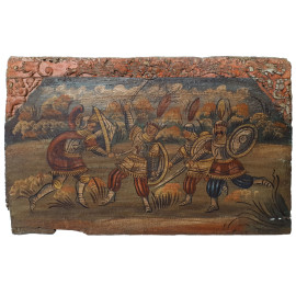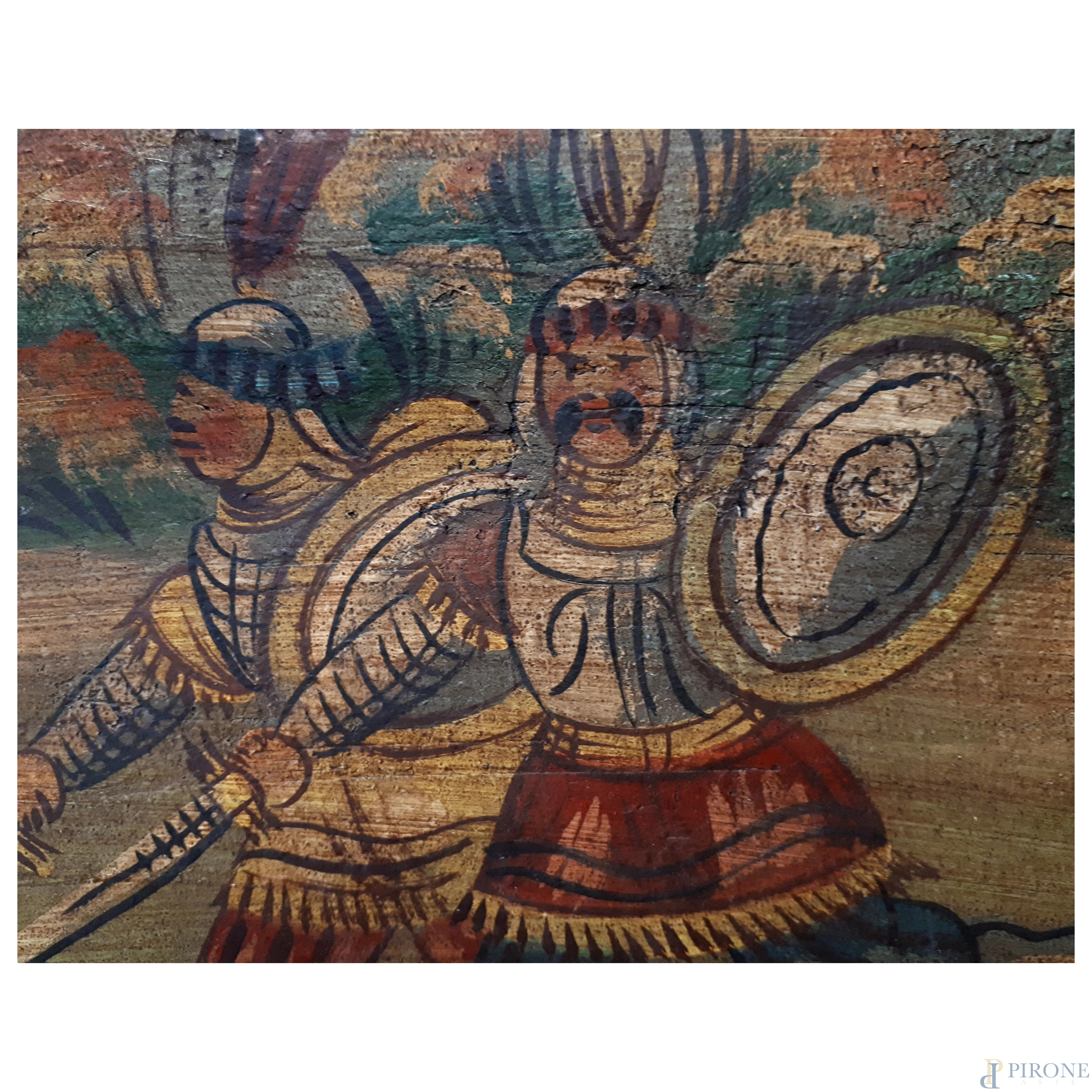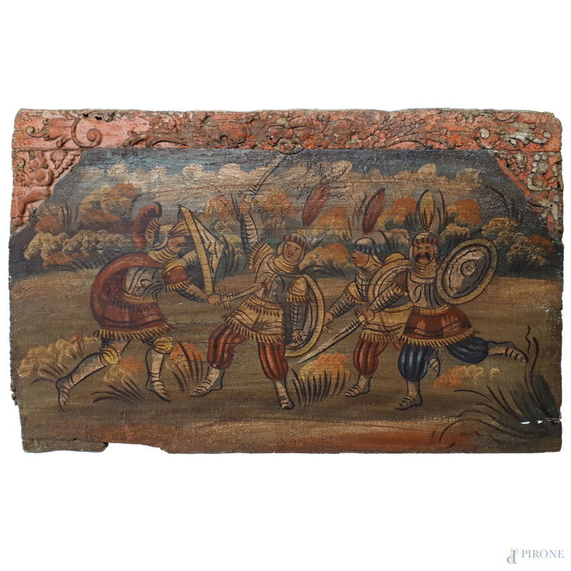 Combattimento di Pupi siciliani, sponda di carretto siciliano dei primi dell’800 dipinta ad olio su tavola, cm 32x52