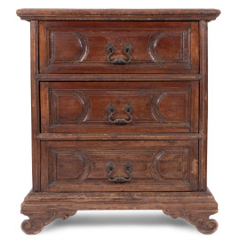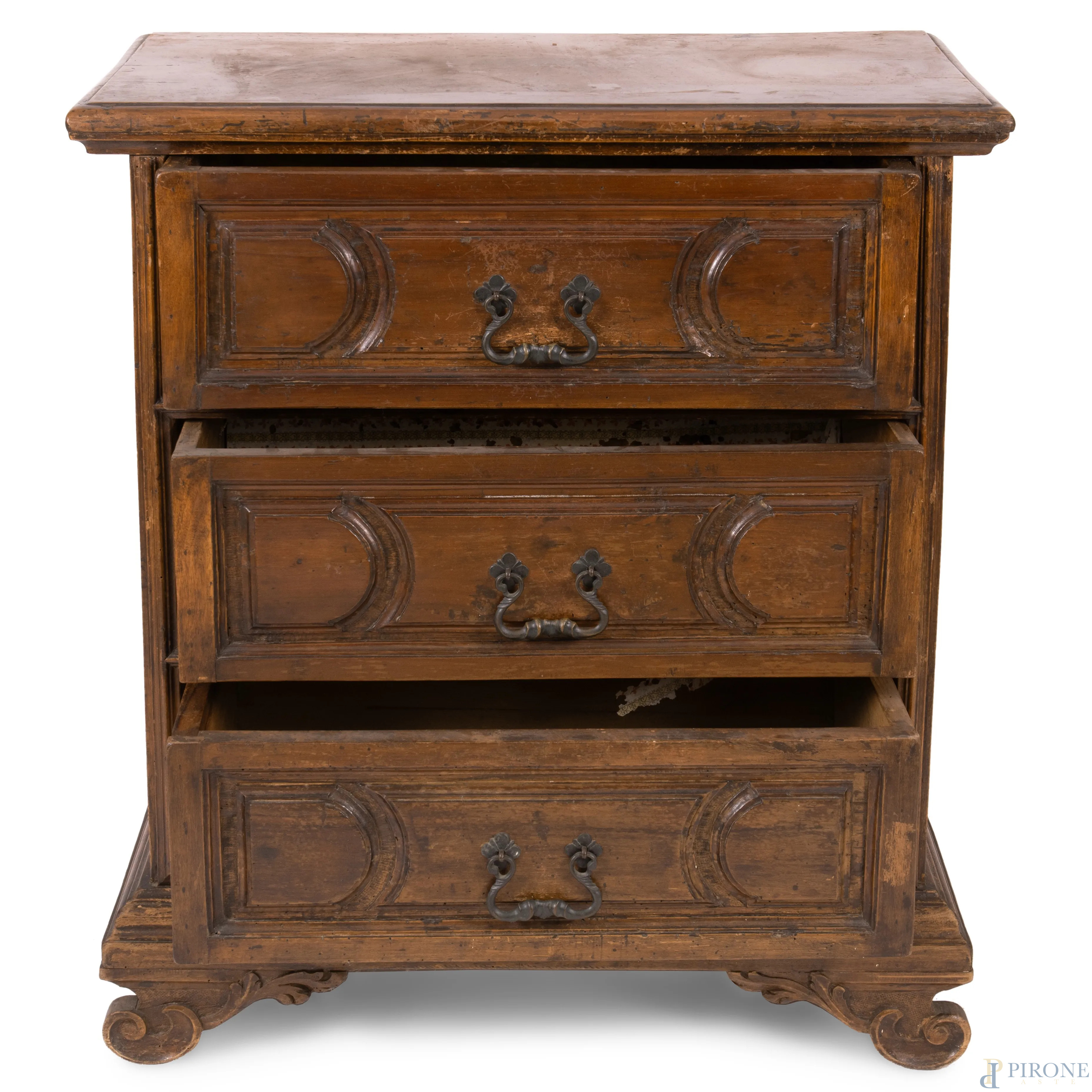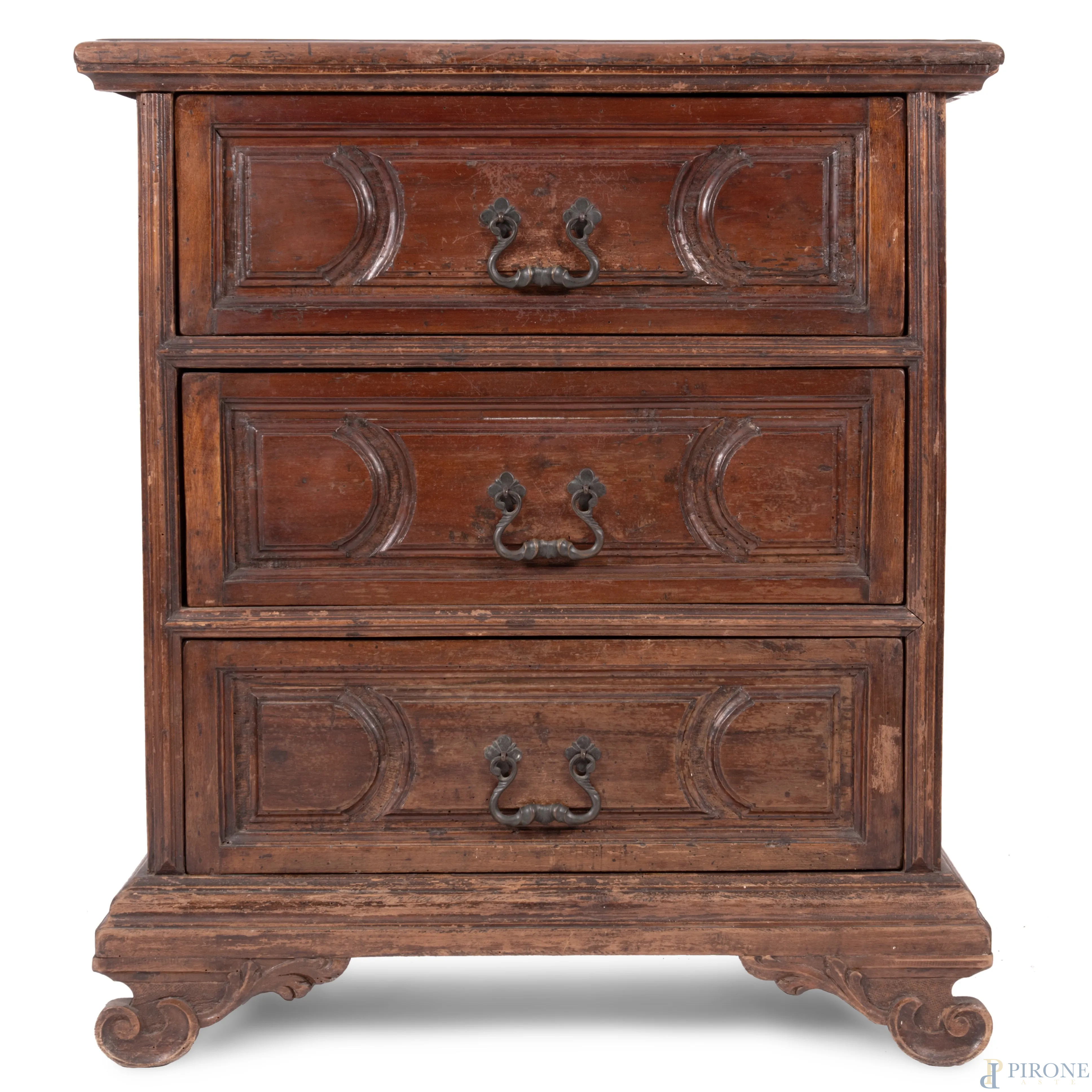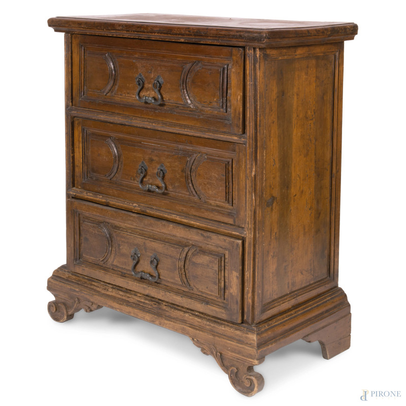 Comodino in noce a tre cassetti modanati al fronte e piedi a ricciolo, XIX secolo, cm 89x80x41, (graffi, segni di usura, difetti, scalfiture)