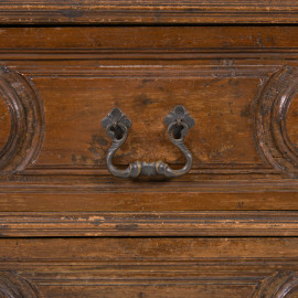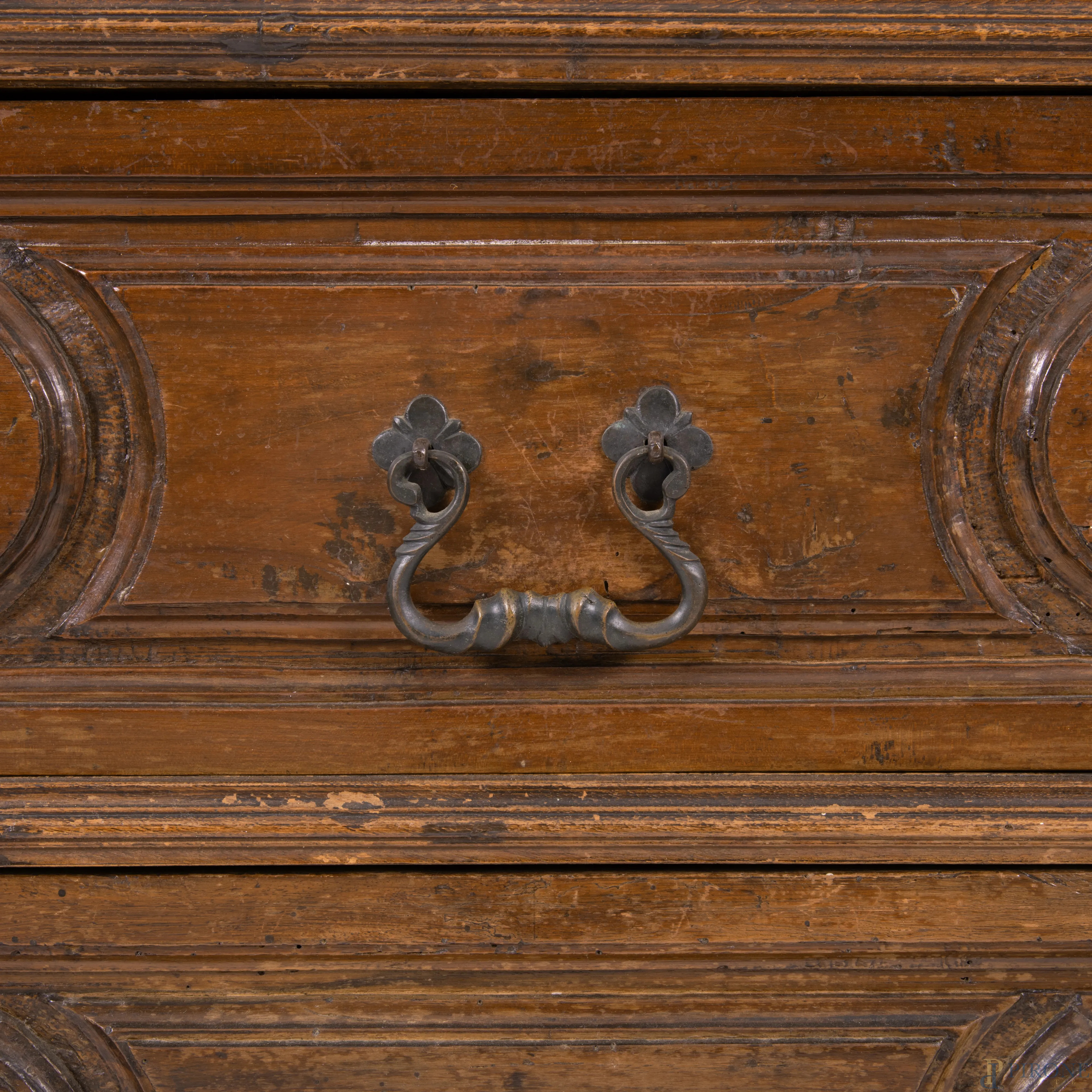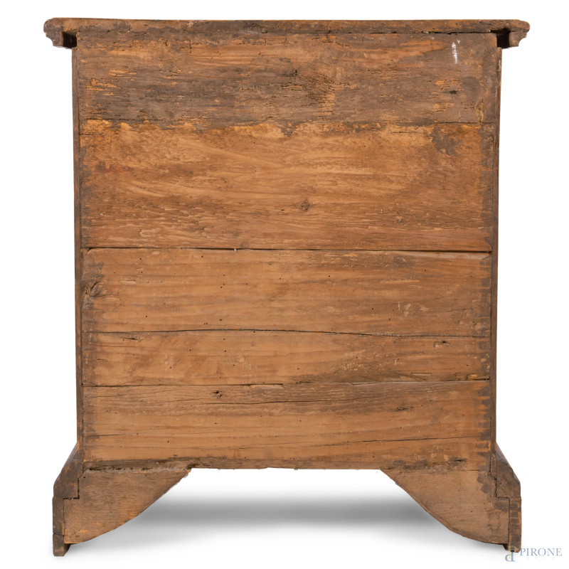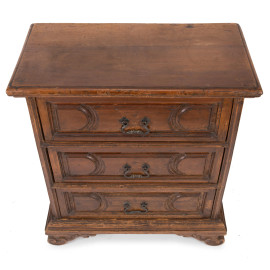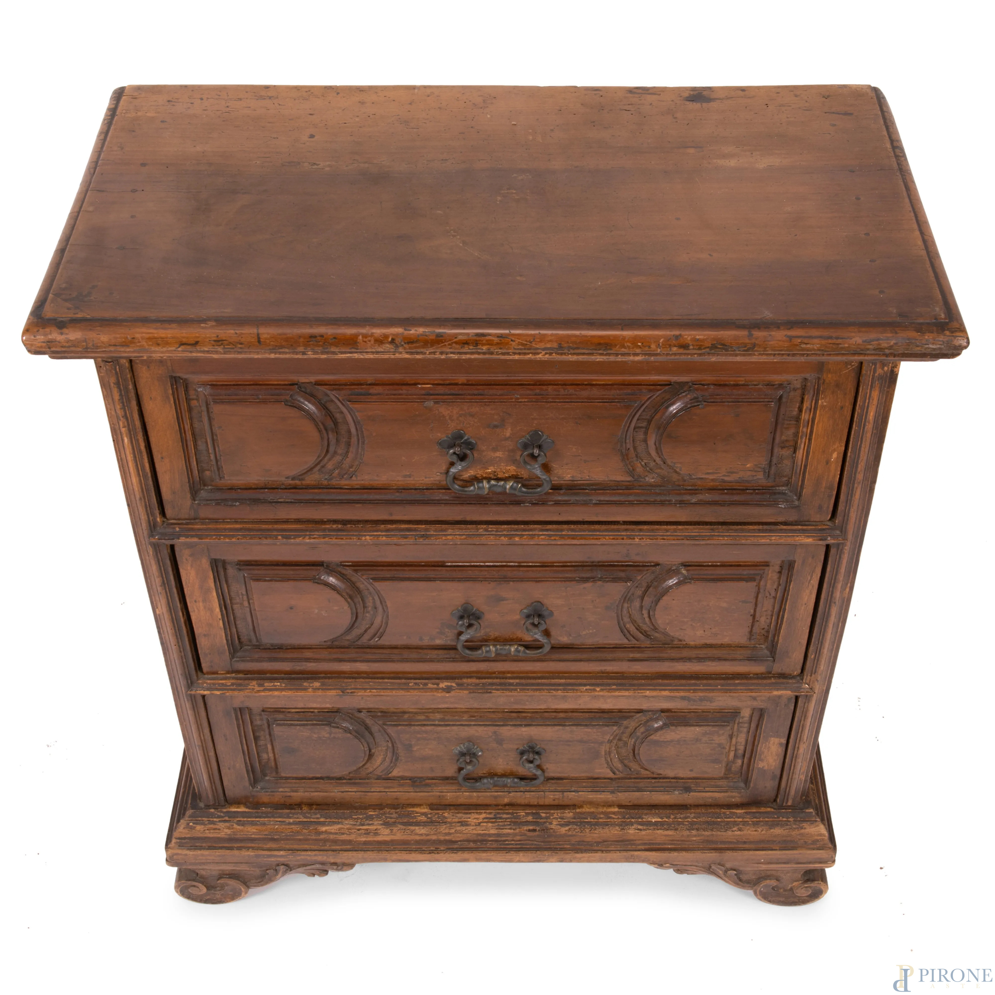 Comodino in noce a tre cassetti modanati al fronte e piedi a ricciolo, XIX secolo, cm 89x80x41, (graffi, segni di usura, difetti, scalfiture)