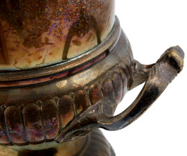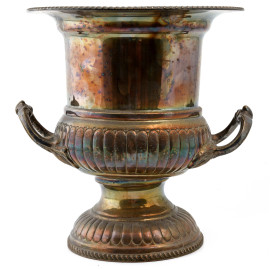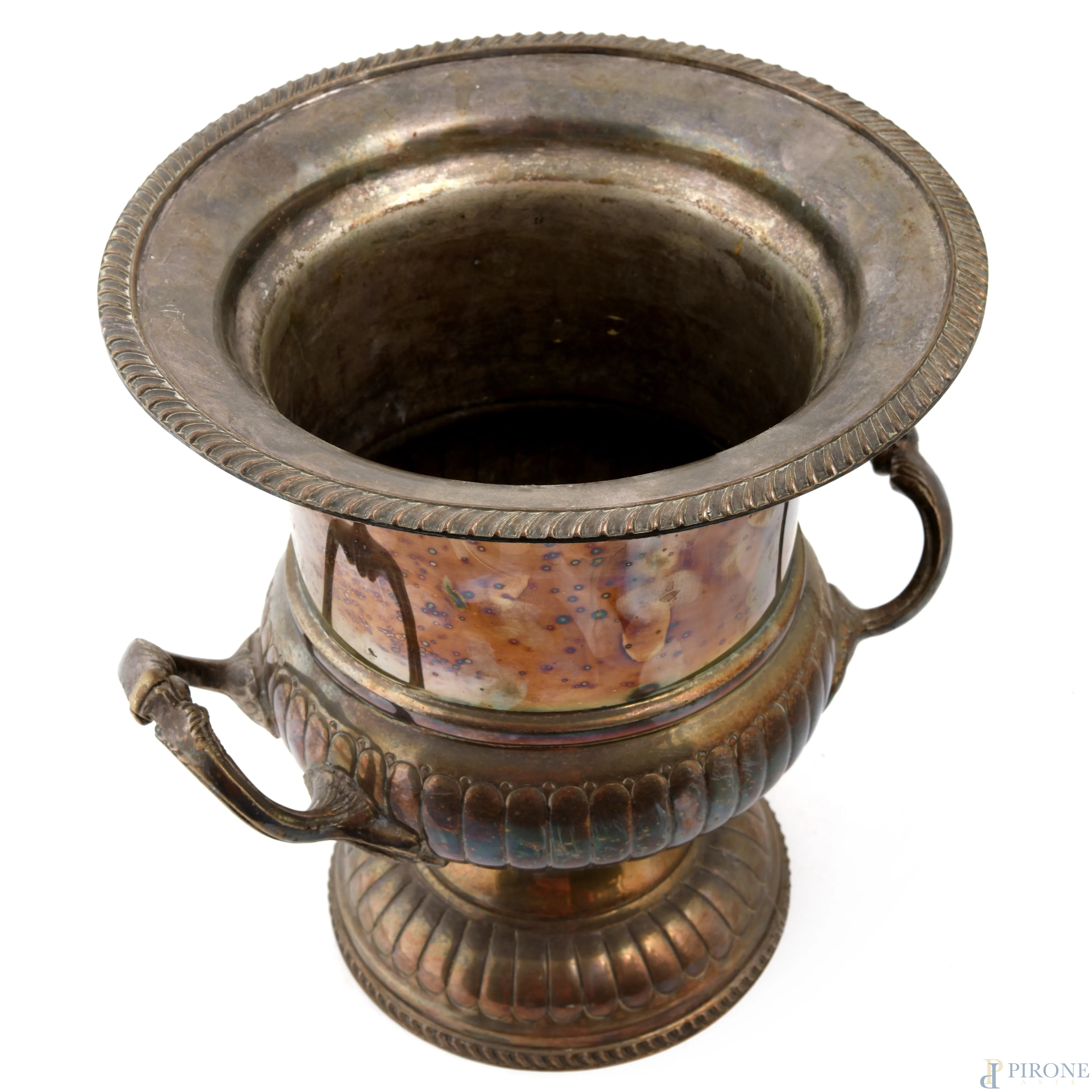Coppa in metallo argentato biansato, XX secolo, cm 25x23,5, (segni di usura)