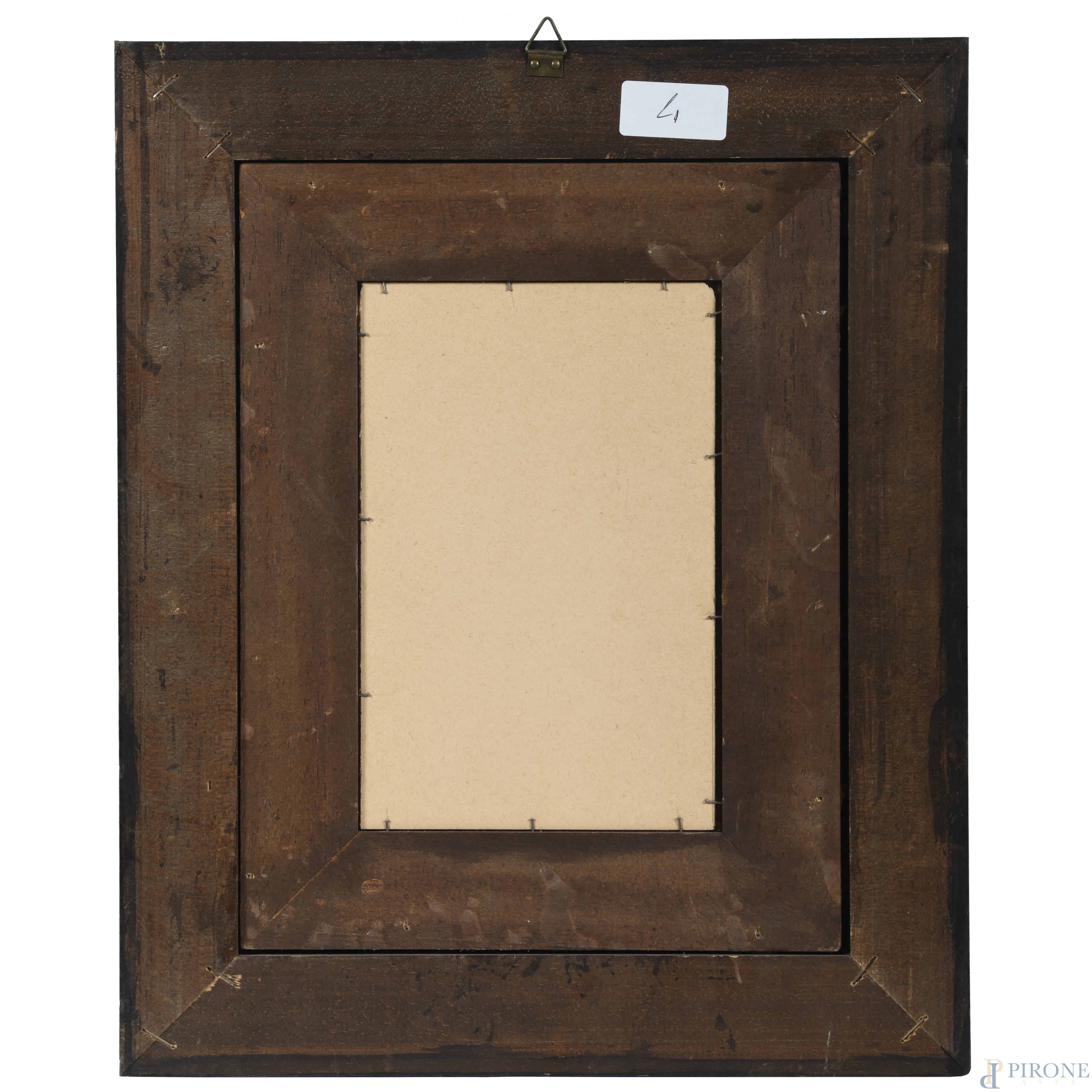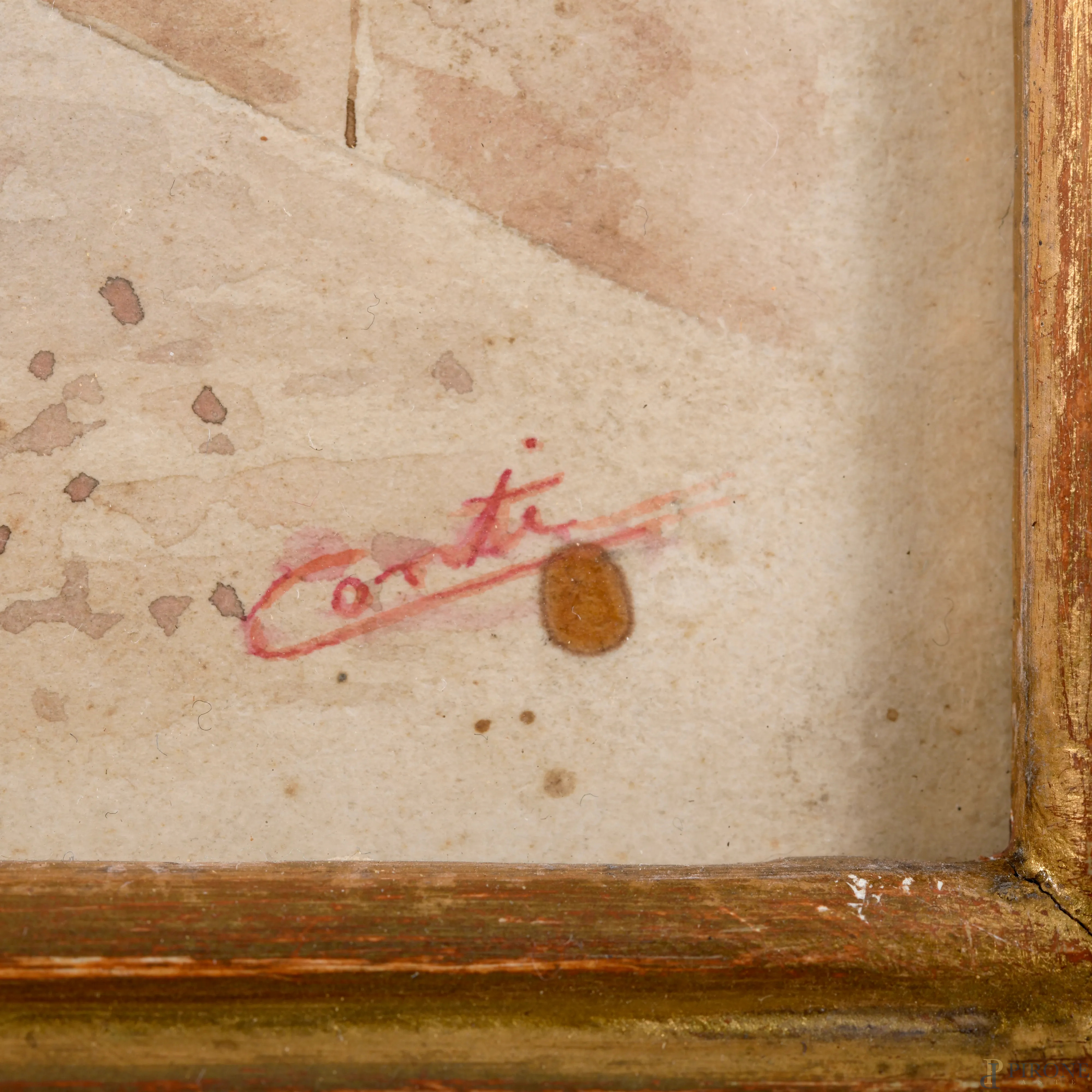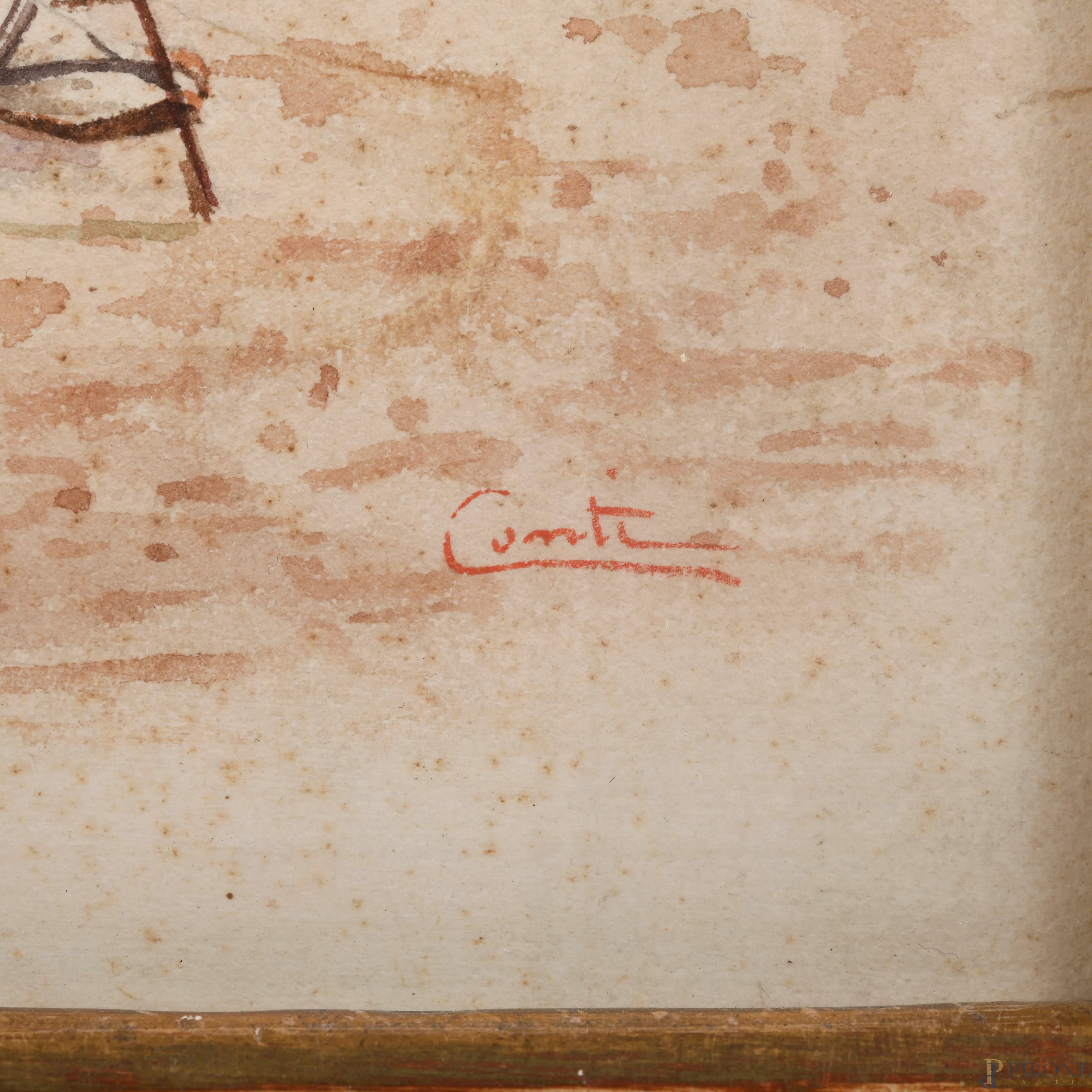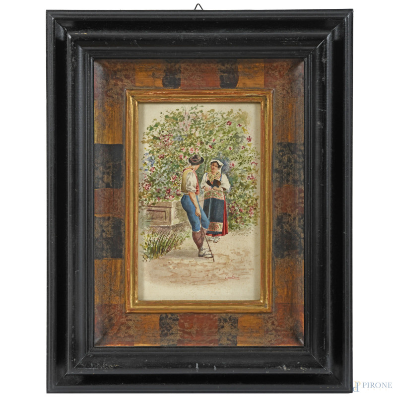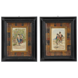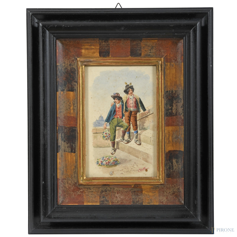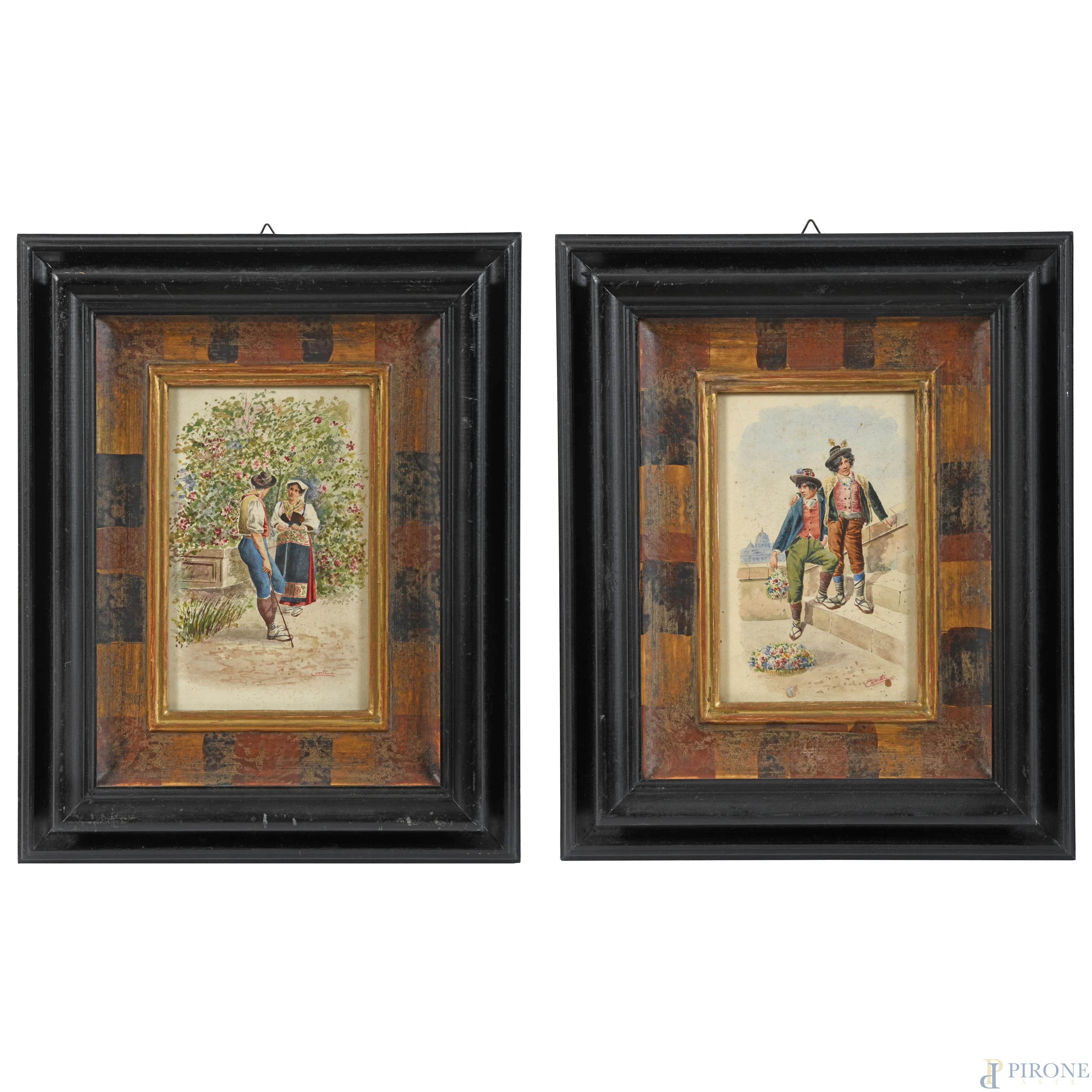 Coppia di acquerelli con figure popolari, XX secolo, cm 19,5x12, firmato in basso a destra, entro cornice (tracce di umidità, foxing)