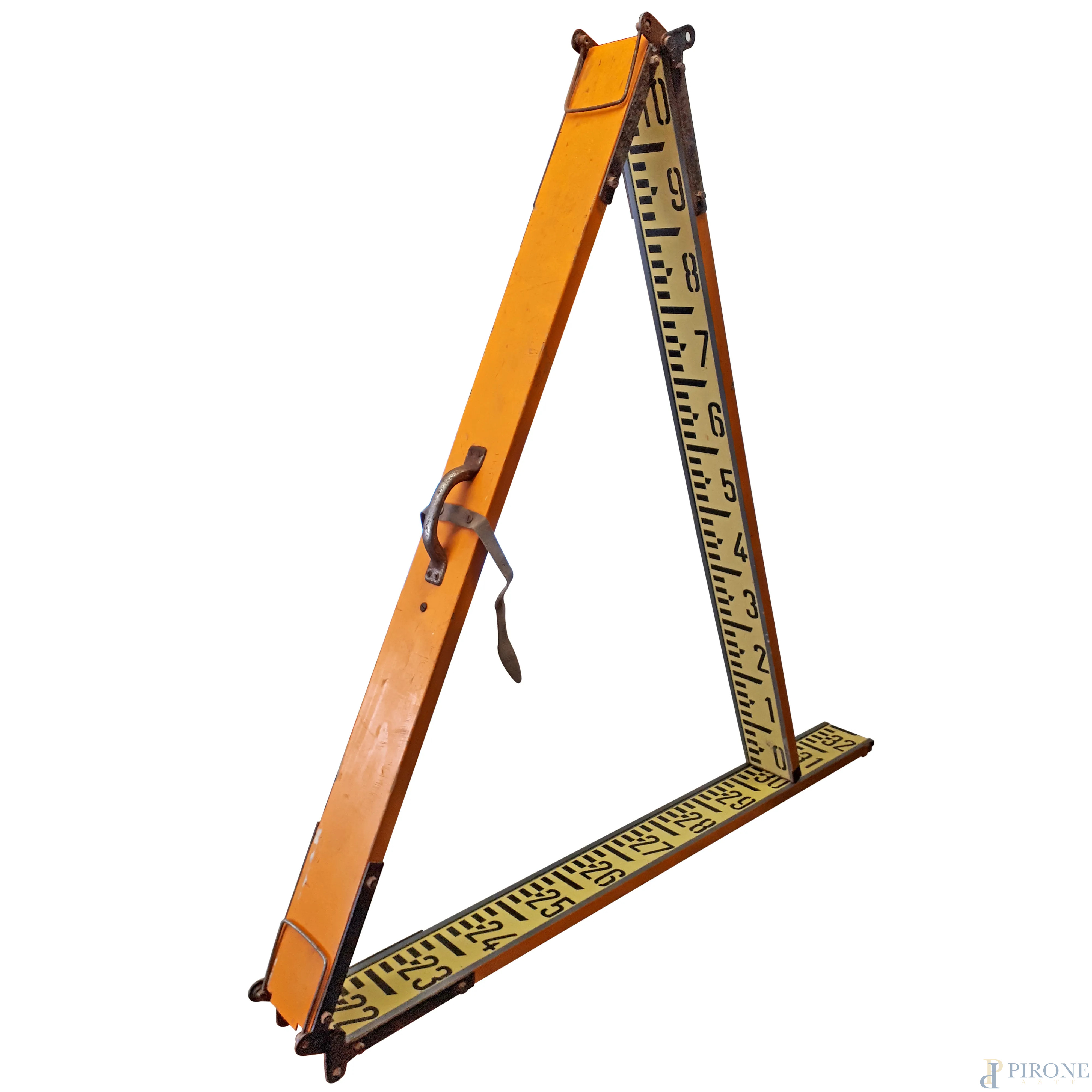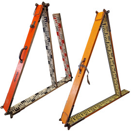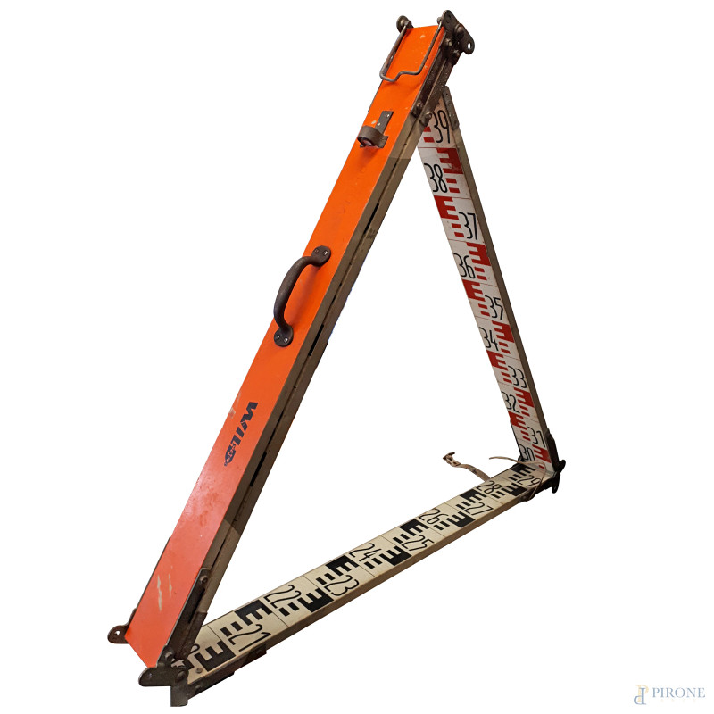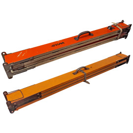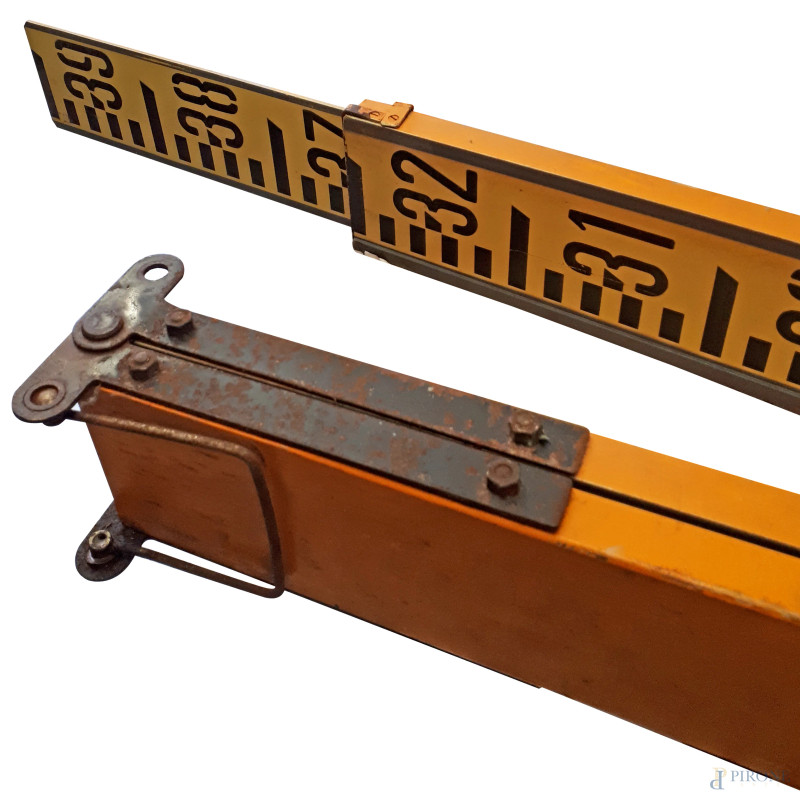 Coppia di antiche stadie metriche graduate telescopiche vintage pieghevoli in legno e mire per teodolite, ciascuna misura circa 4 metri