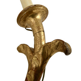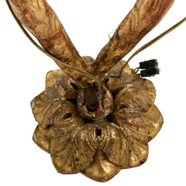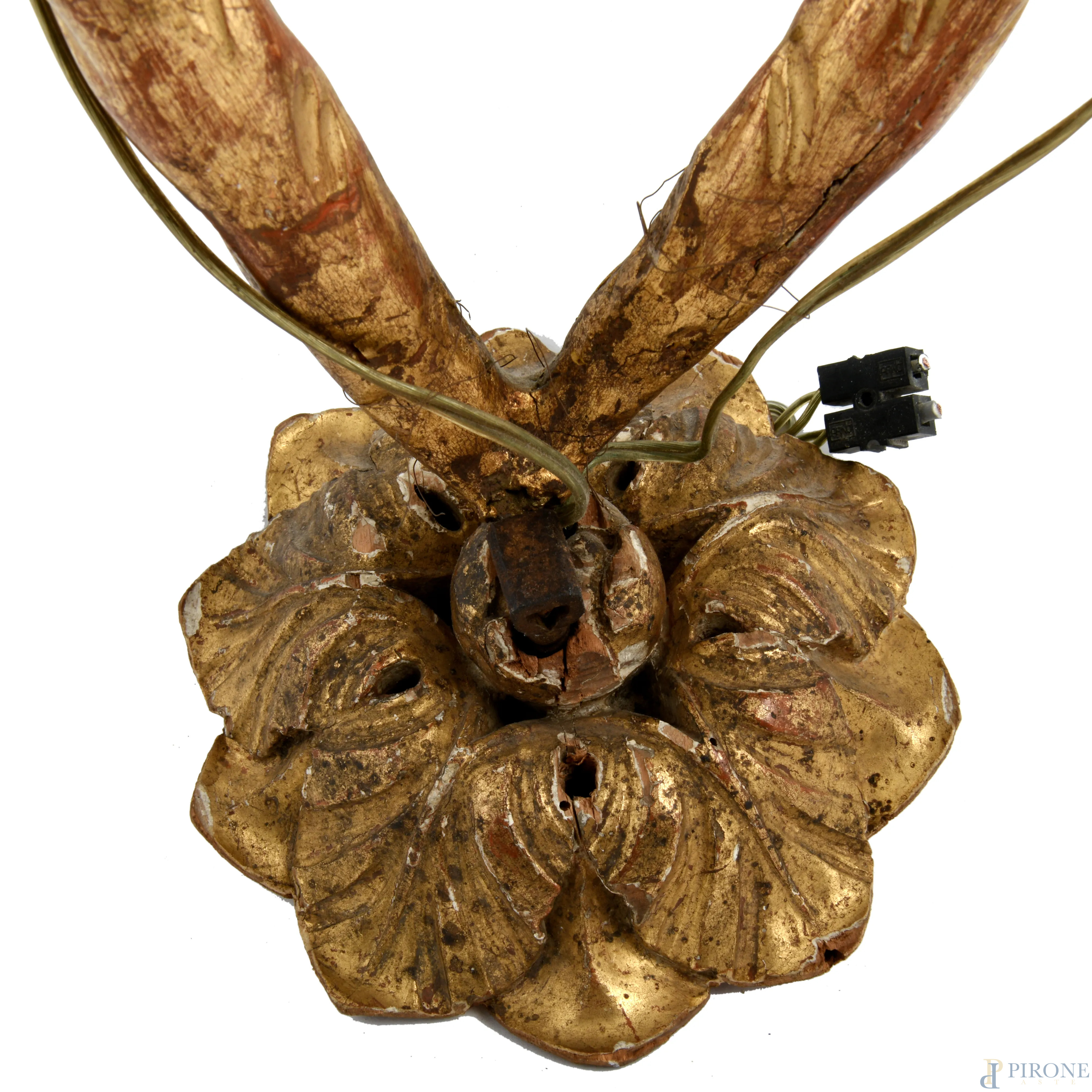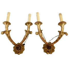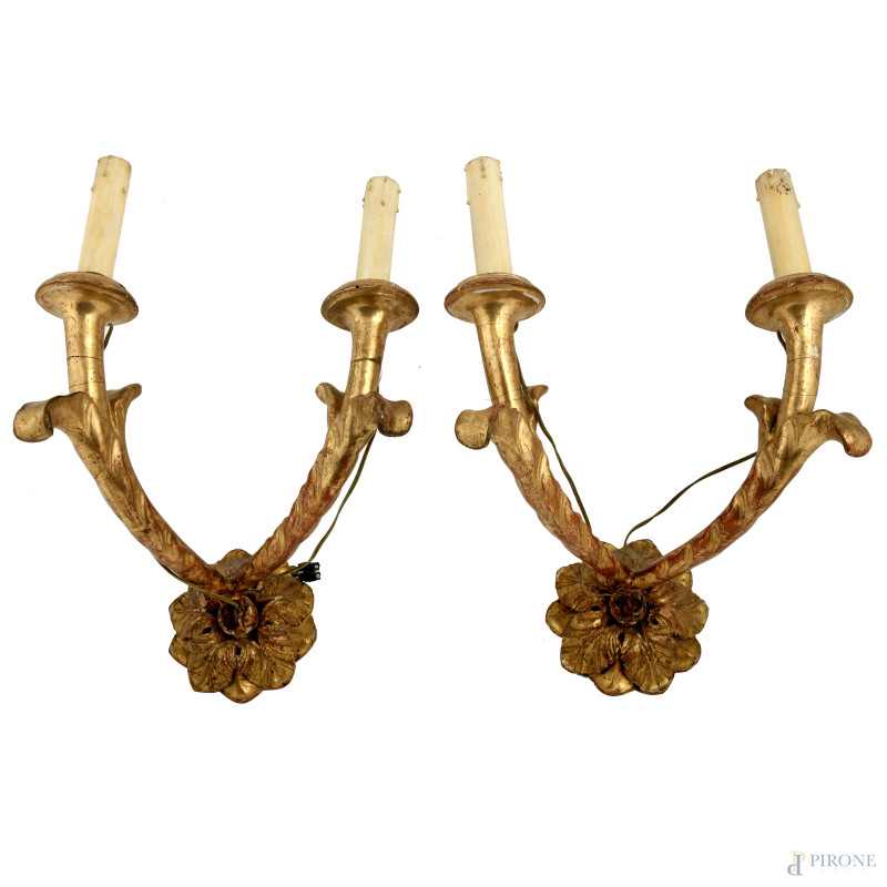 Coppia di appliques in legno dorato e intagliato a due luci, XX secolo, cm 32x30, (difetti, segni di usura, restauri, rotture)