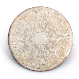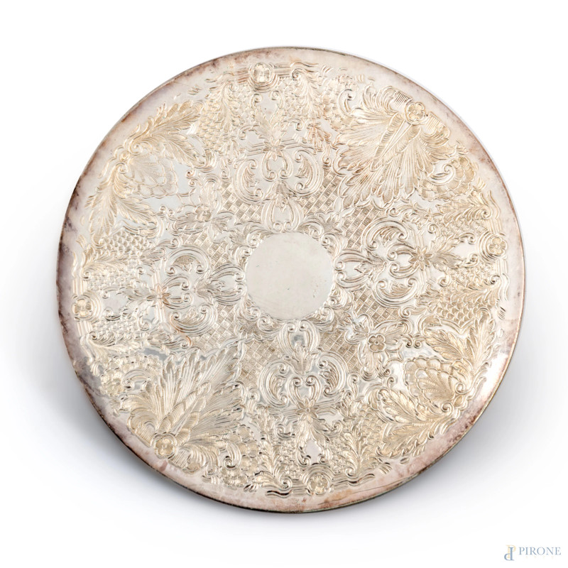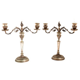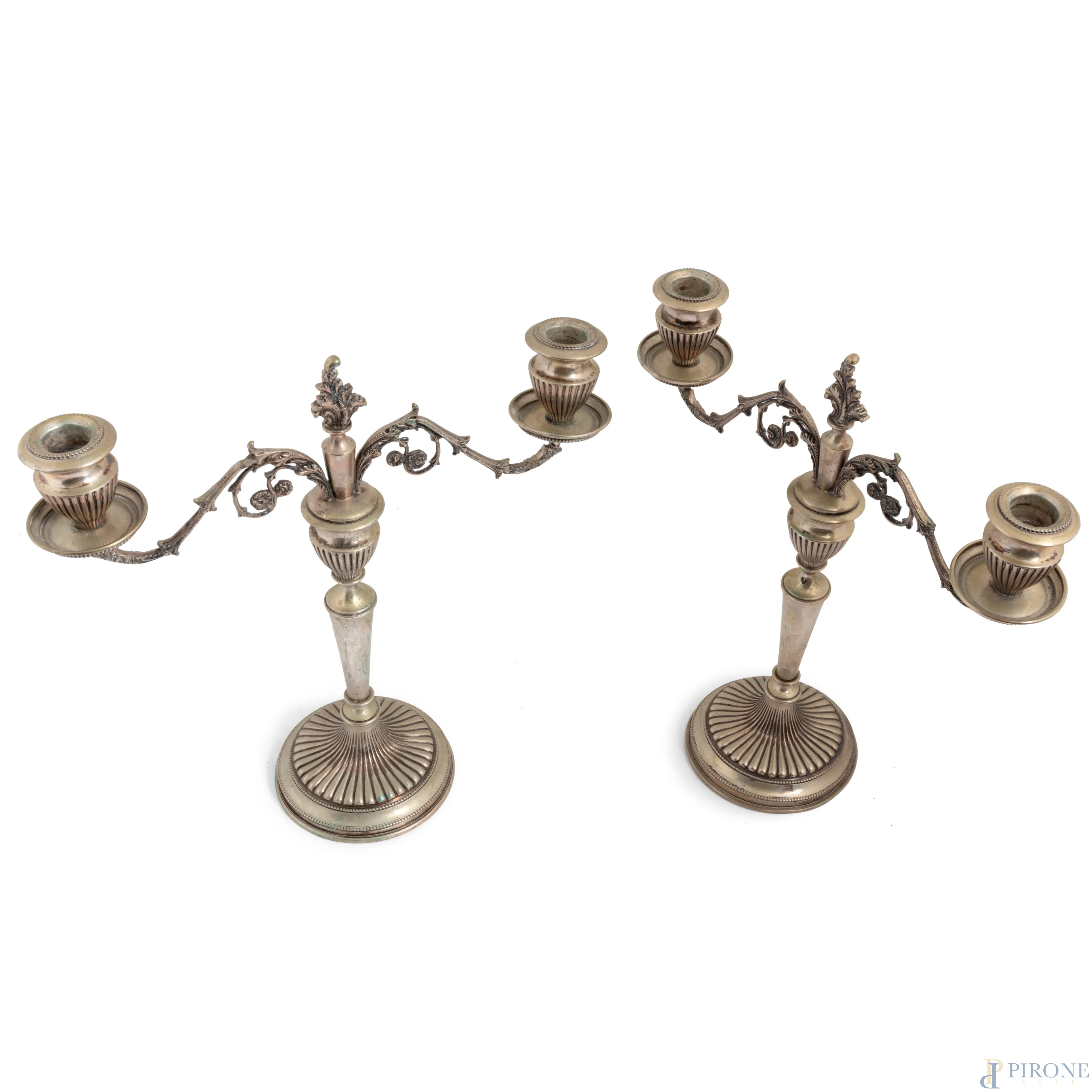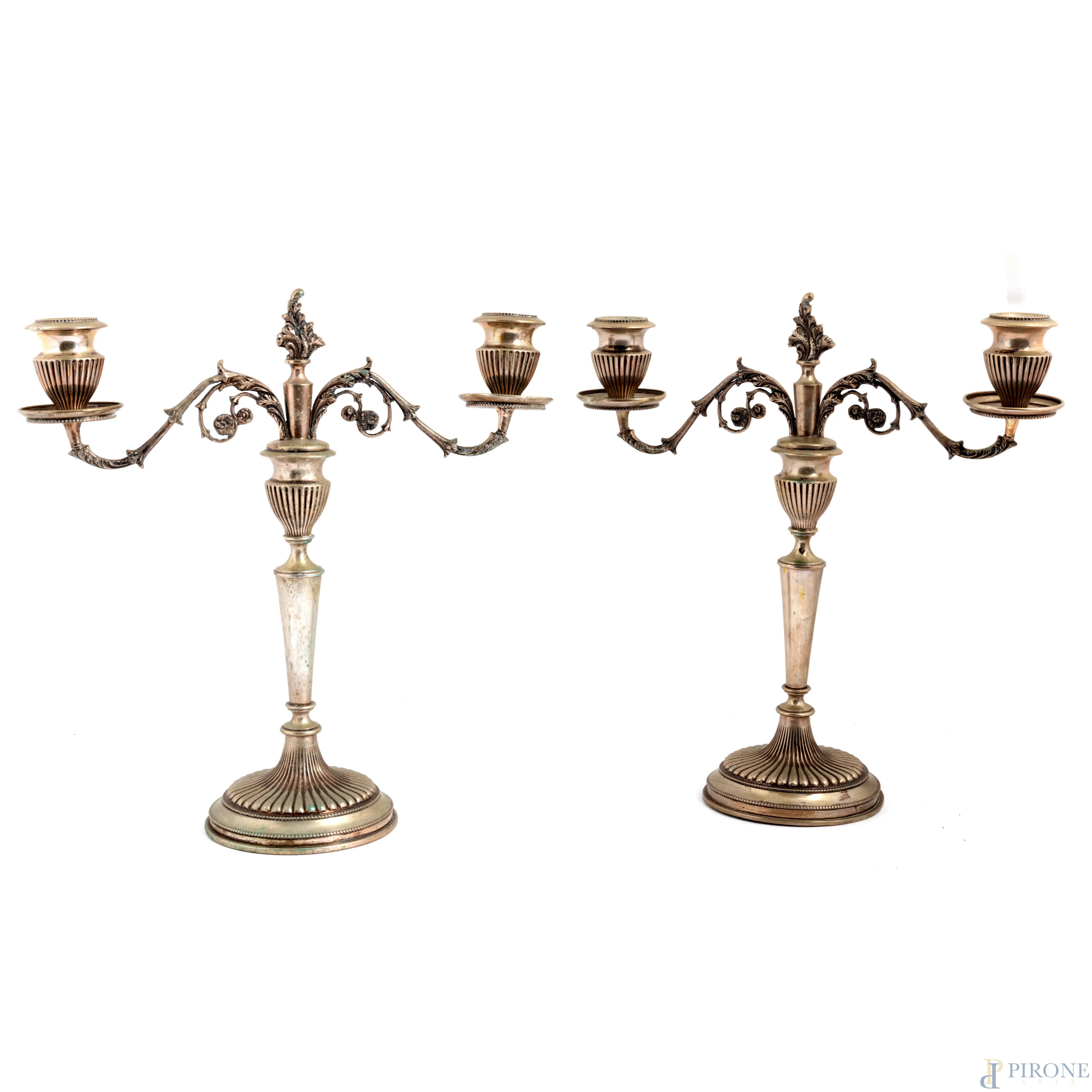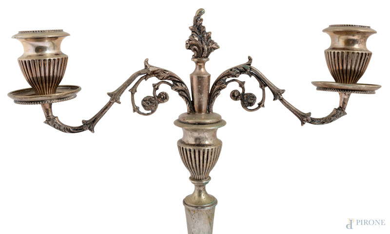 Coppia di candelabri a due luci in metallo argentato e cesellato, XX secolo, altezza cm 29,5
