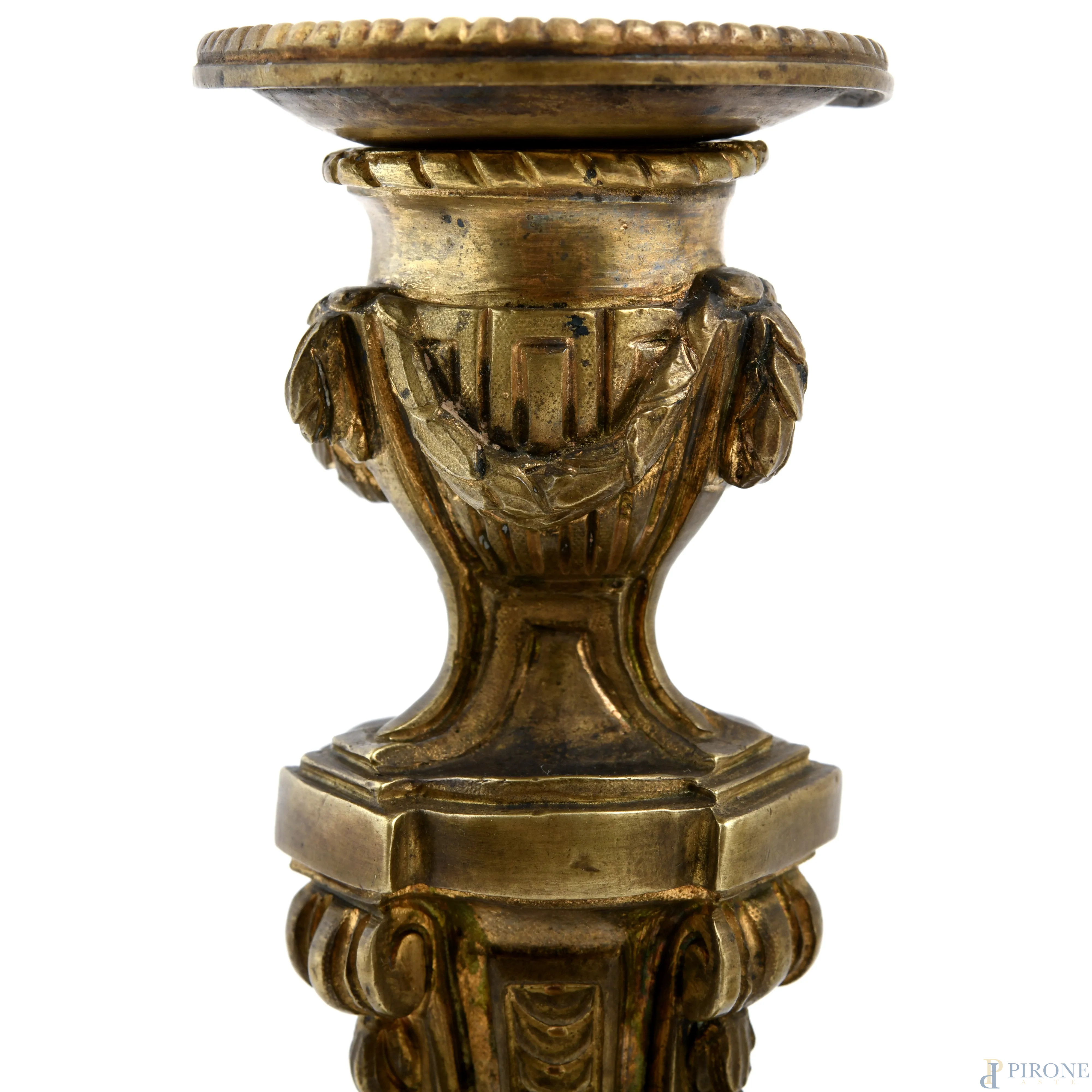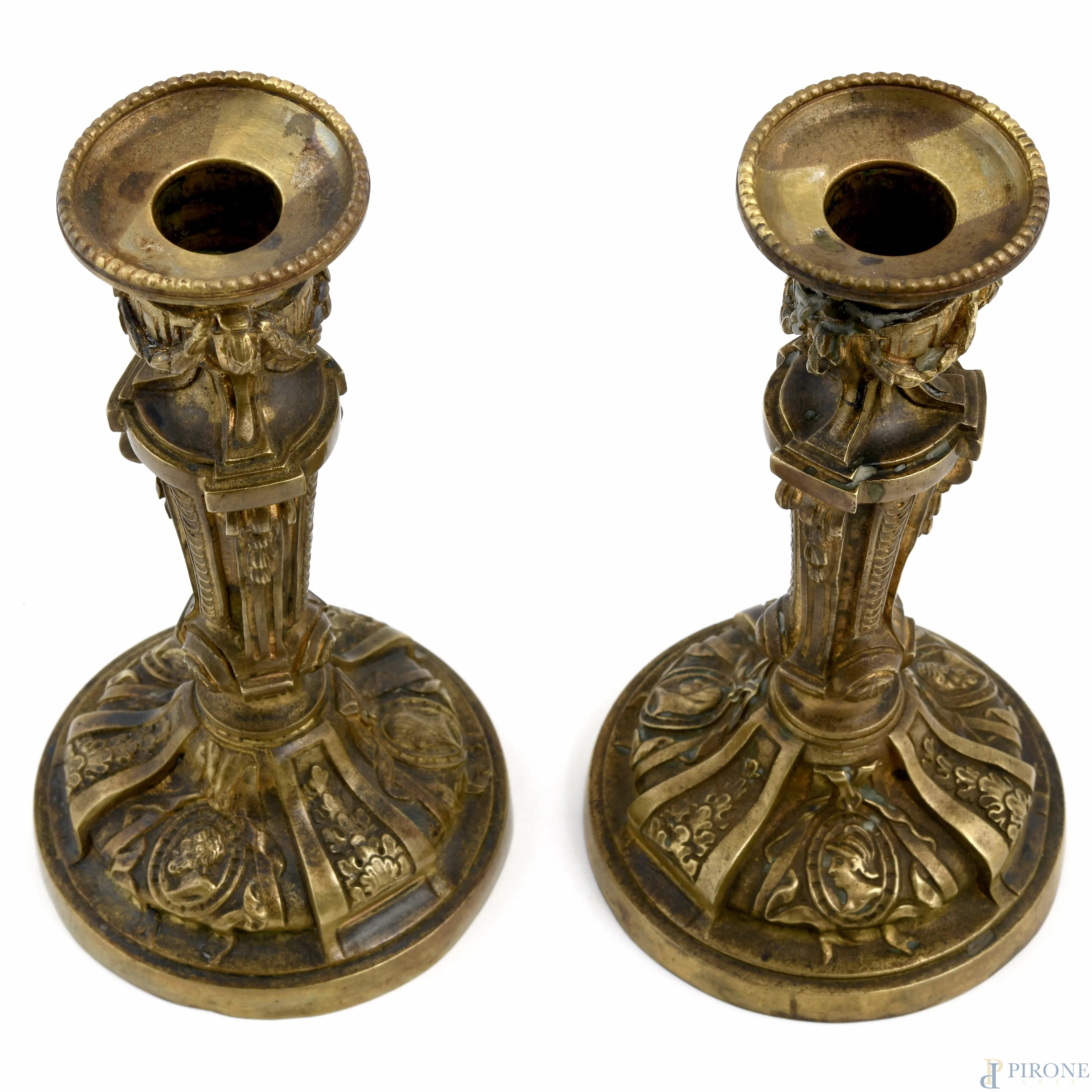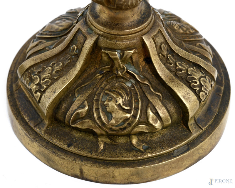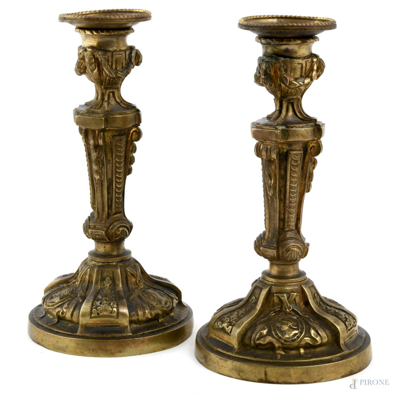 Coppia di candelieri in stile Luigi XVI in bronzo cesellato, XX secolo, altezza cm 20, (segni di usura del tempo)
