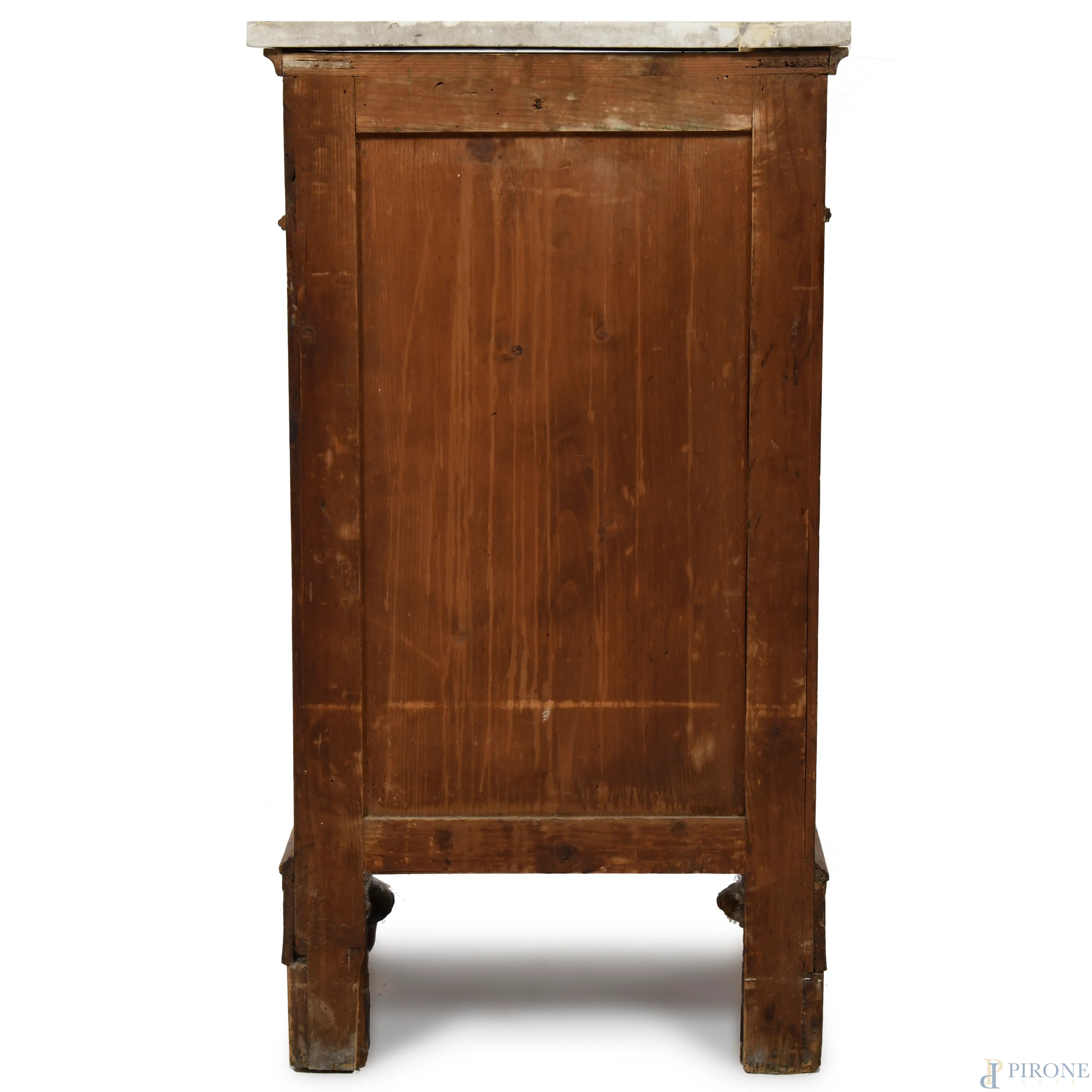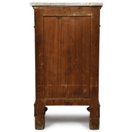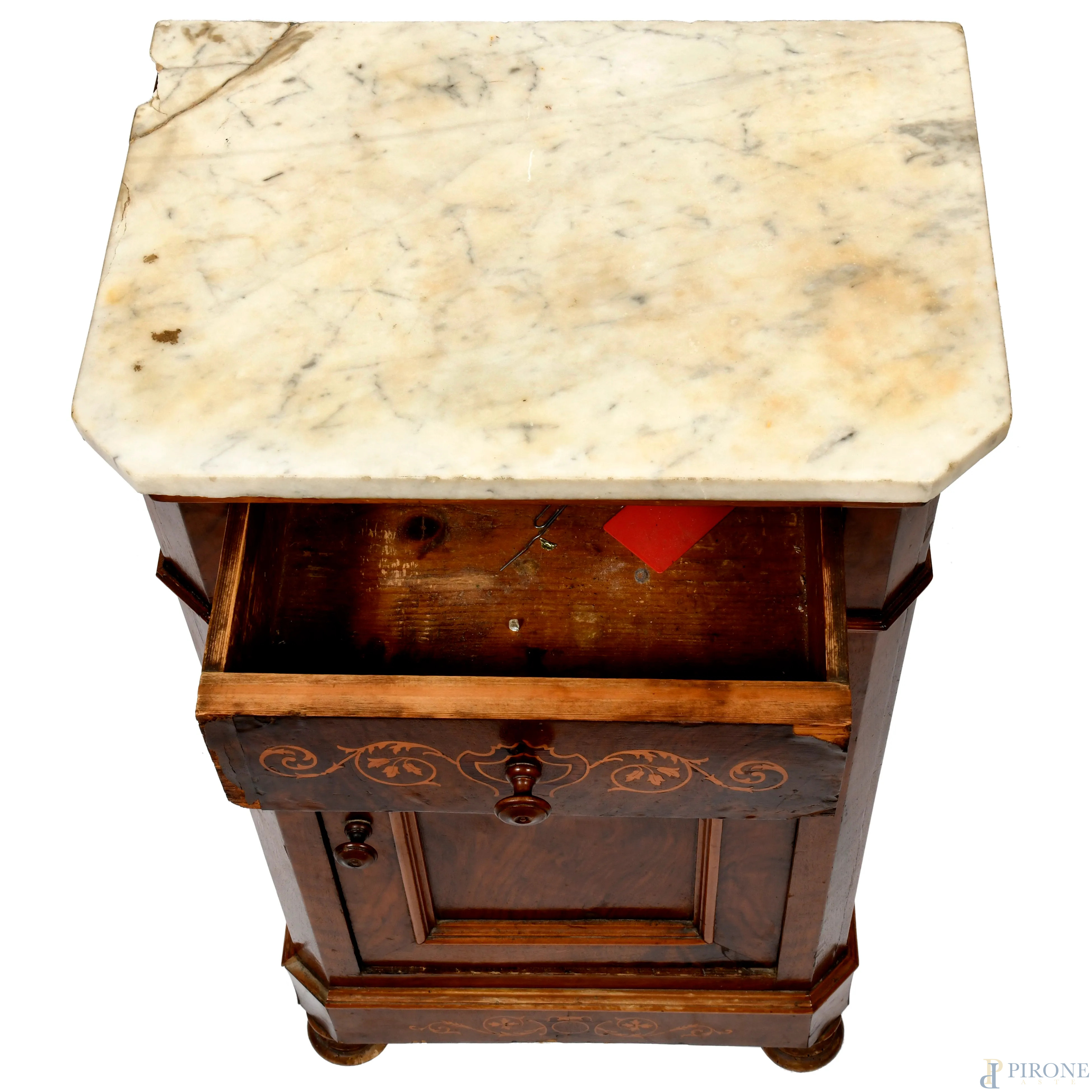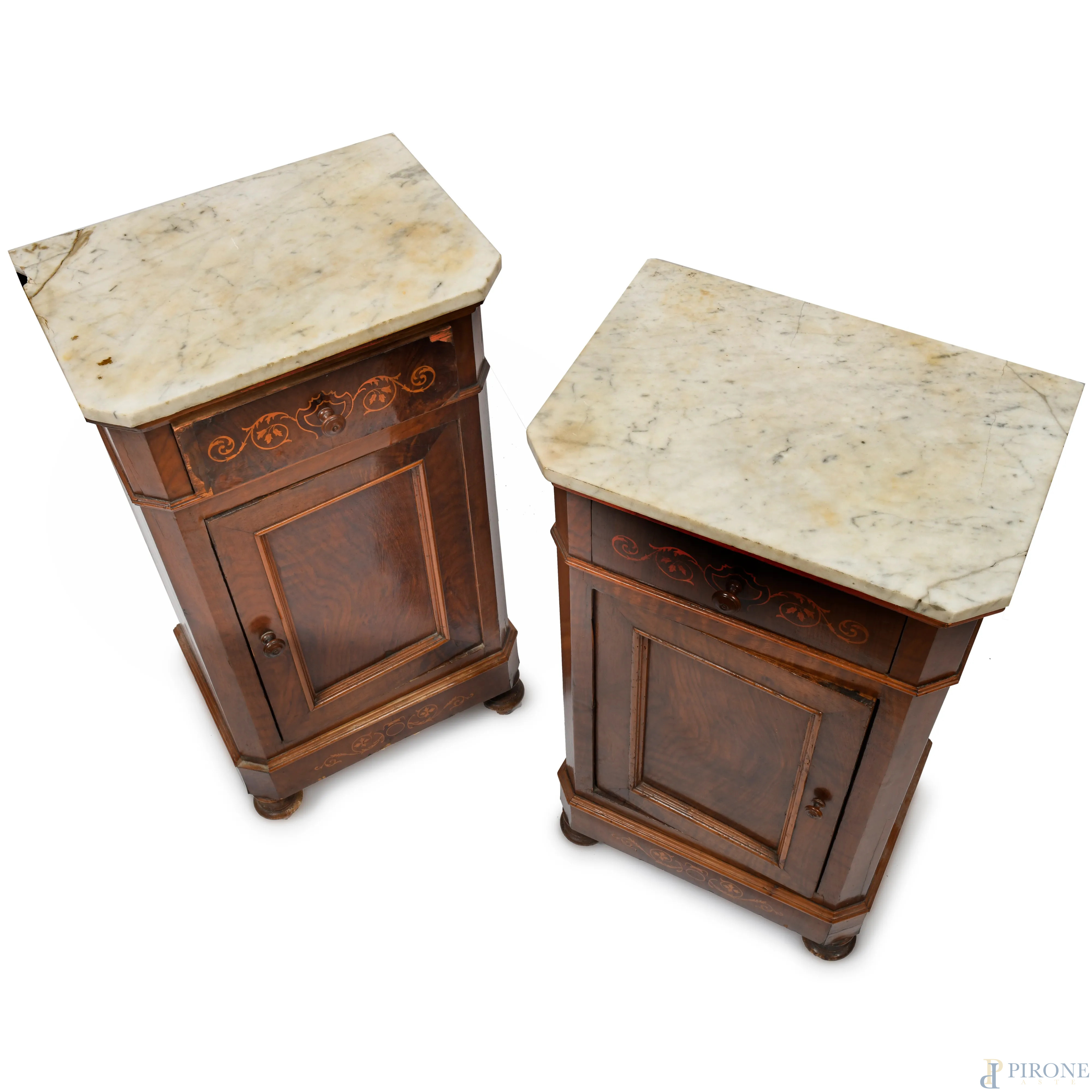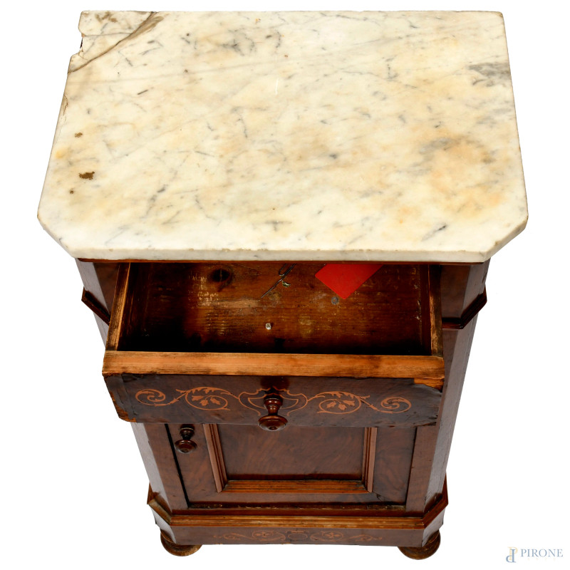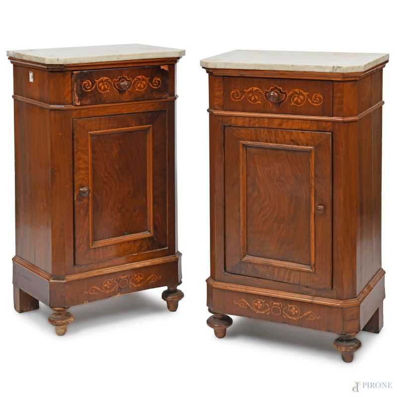 Coppia di comodini in noce intarsiati in bosso con piano in marmo. Cassetto e sportello al fronte. XX secolo, cm 90x49x34, (difetti, scalfiture, rotture, mancanze, graffi)