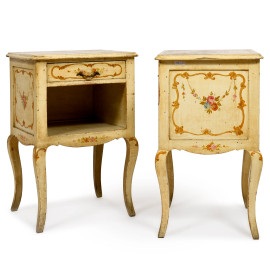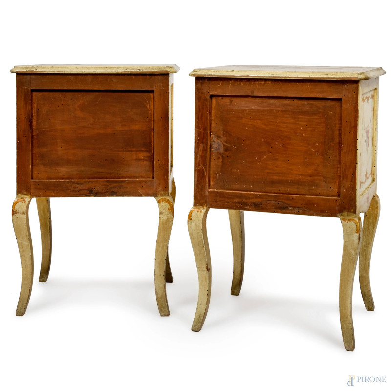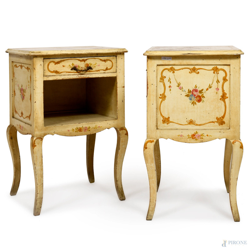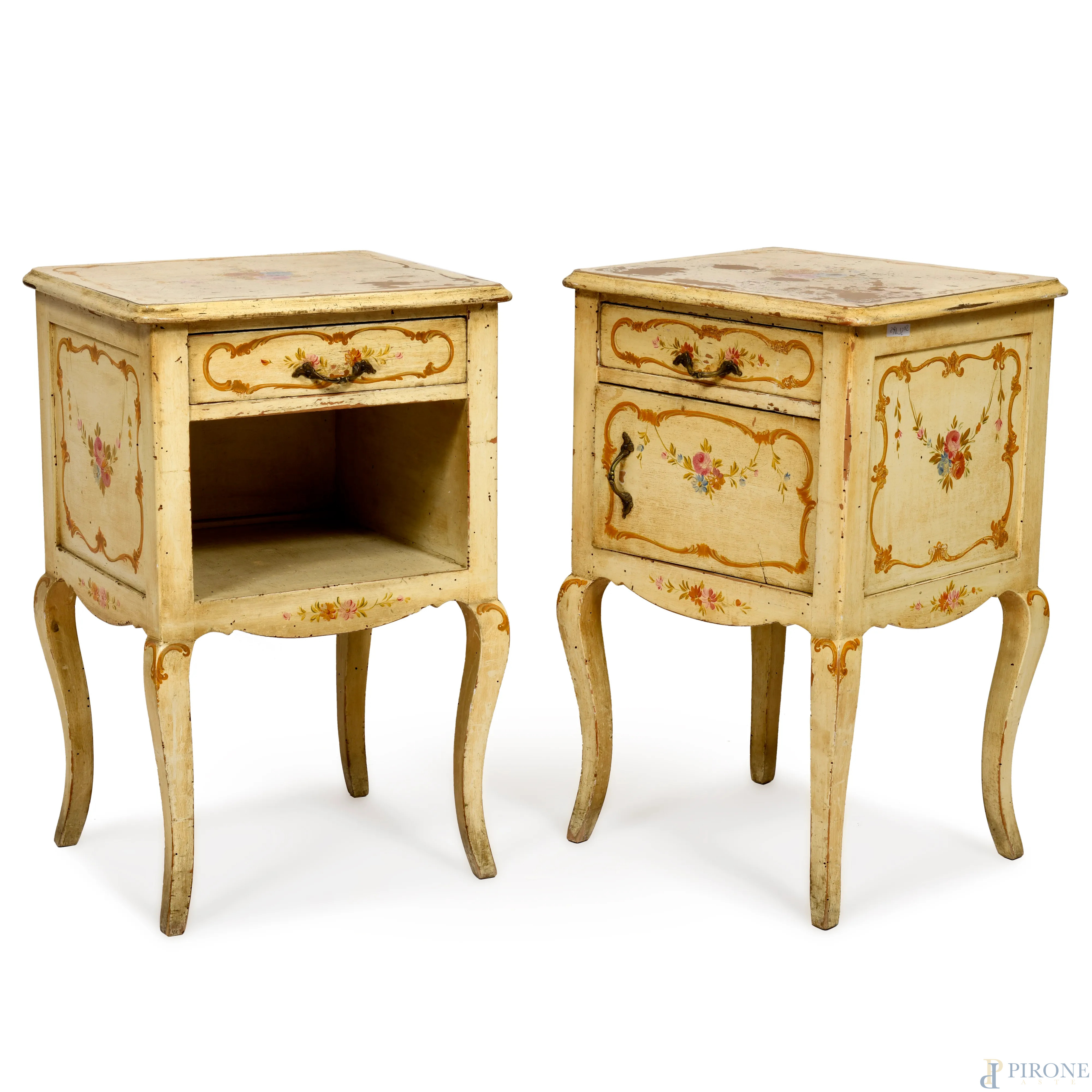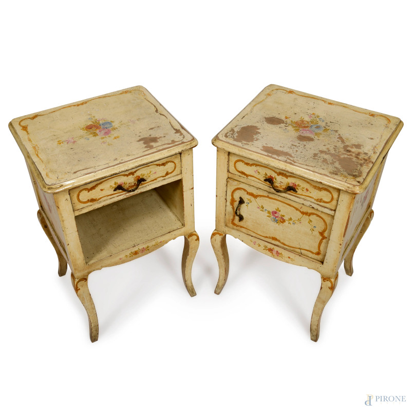 Coppia di comodini laccati e decorati a motivi floreali, XX secolo, cm 64,5x41x35, (cadute di vernice, scalfiture, fori di tarlo, segni di usura)