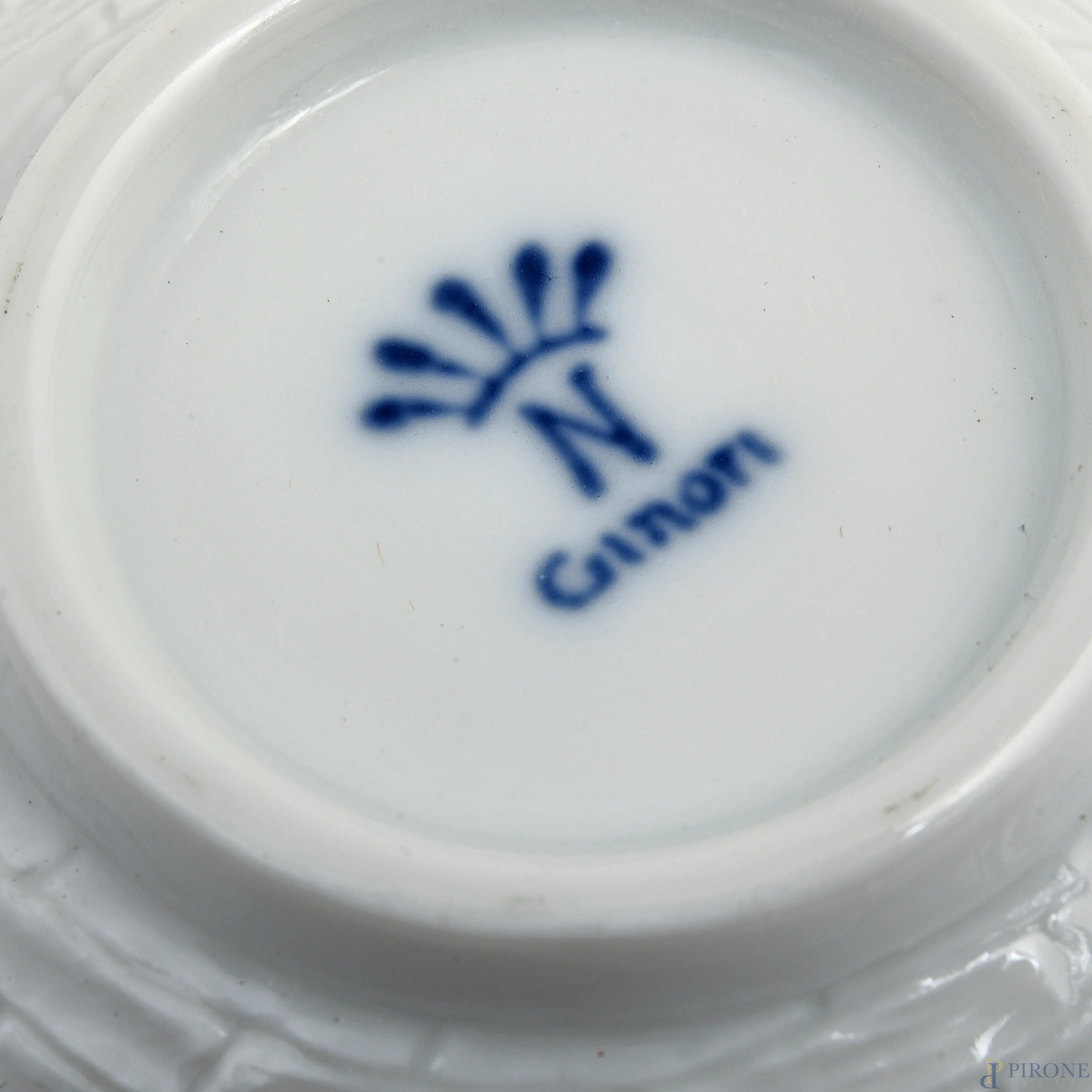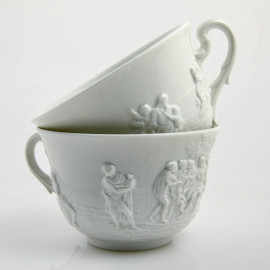 Coppia di due tazze in porcellana Richard Ginori decorate a rilievo con scene mitologiche, altezza cm 6,5