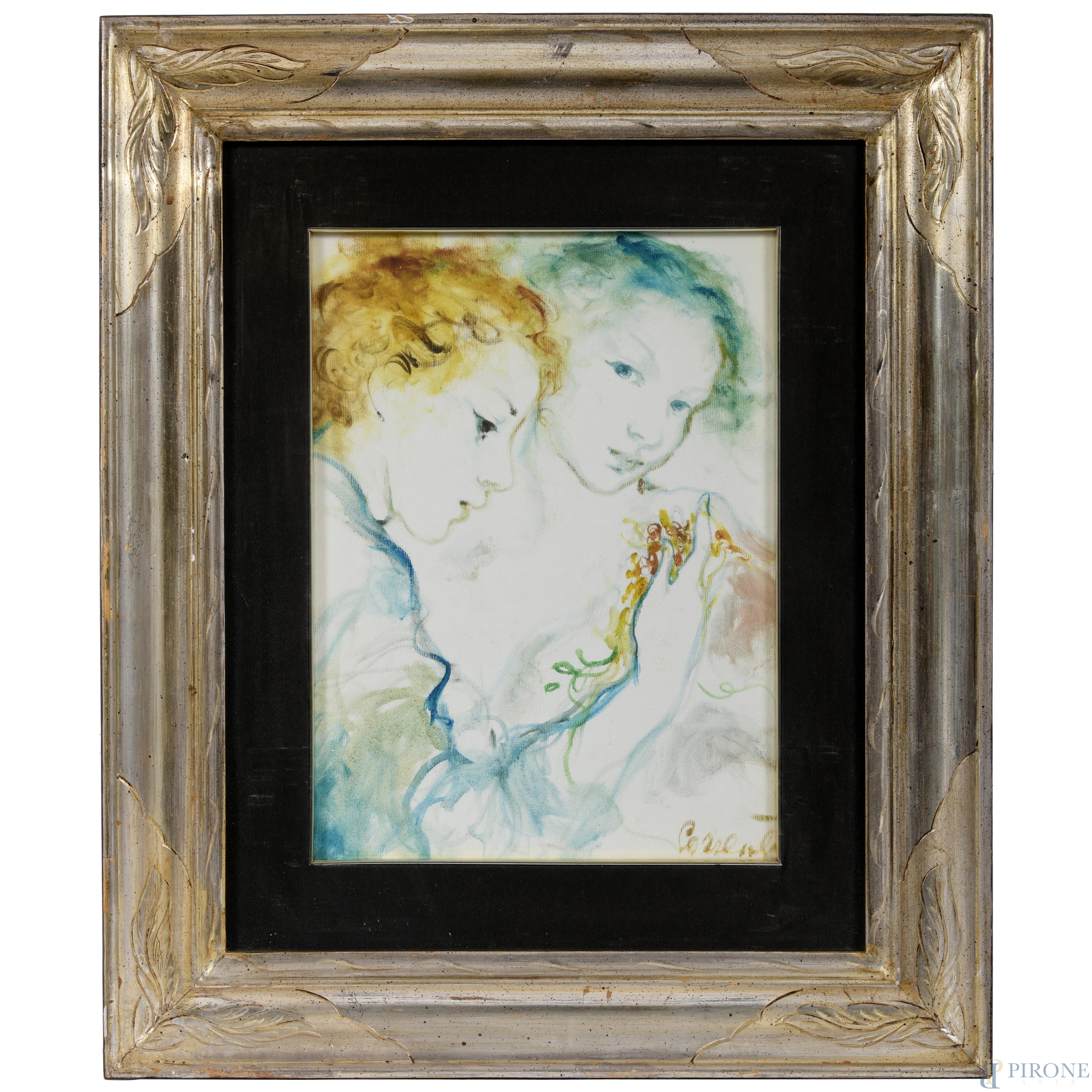 Coppia di fanciulle, XX secolo, tecnica mista su tela, cm 40x30, firmato in basso a destra, entro cornice