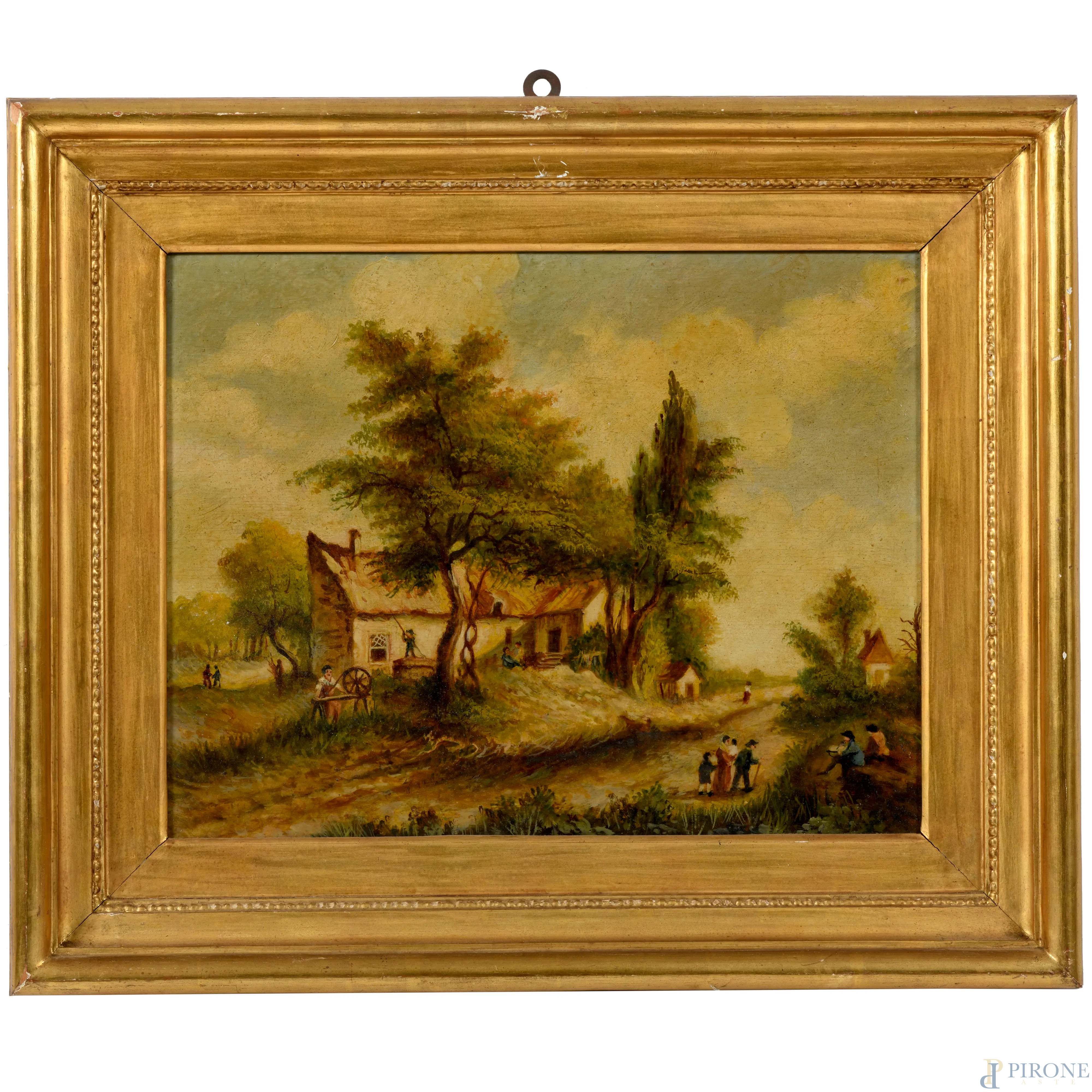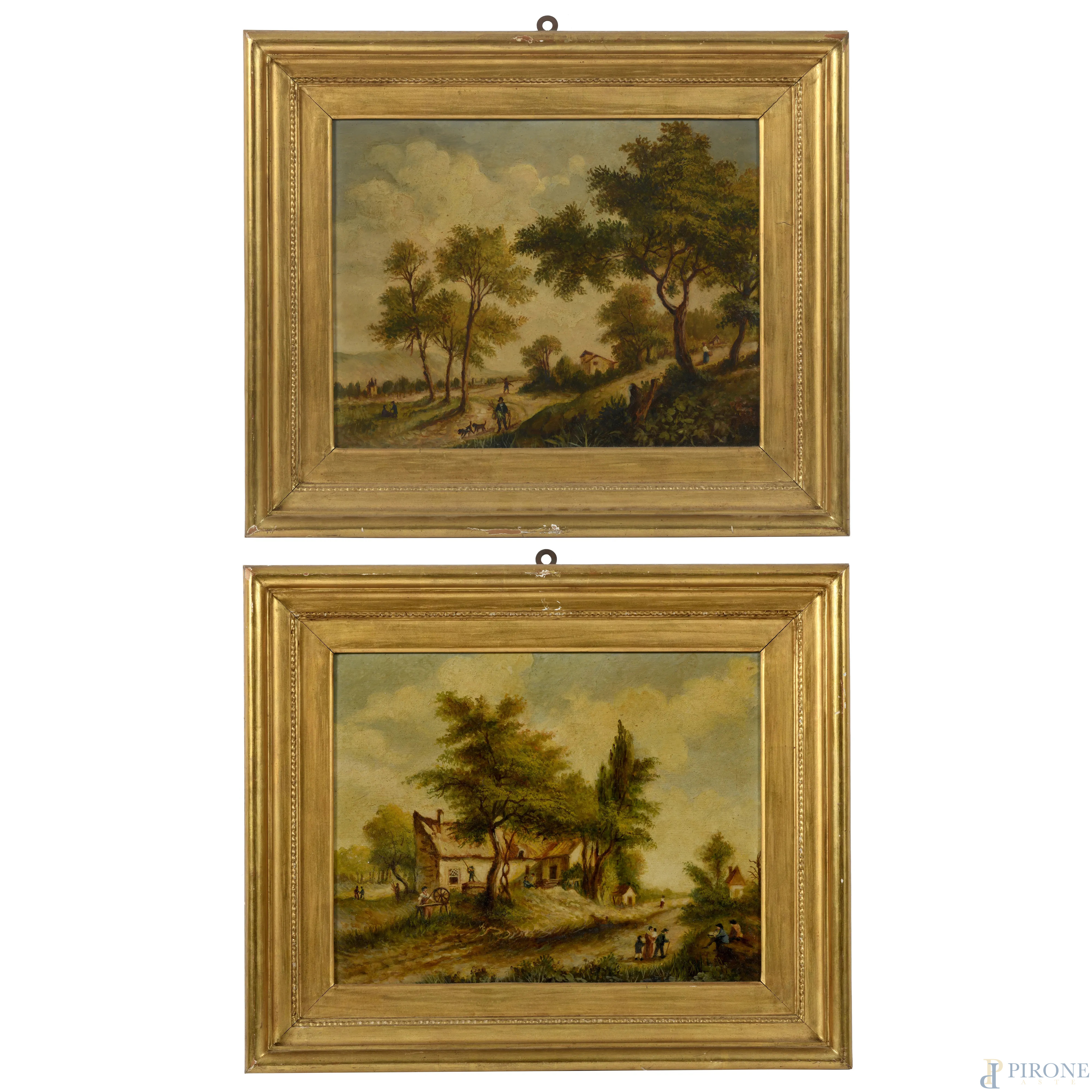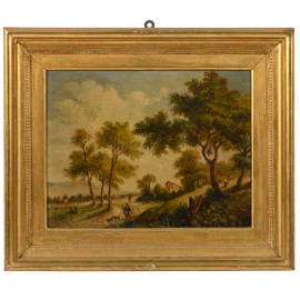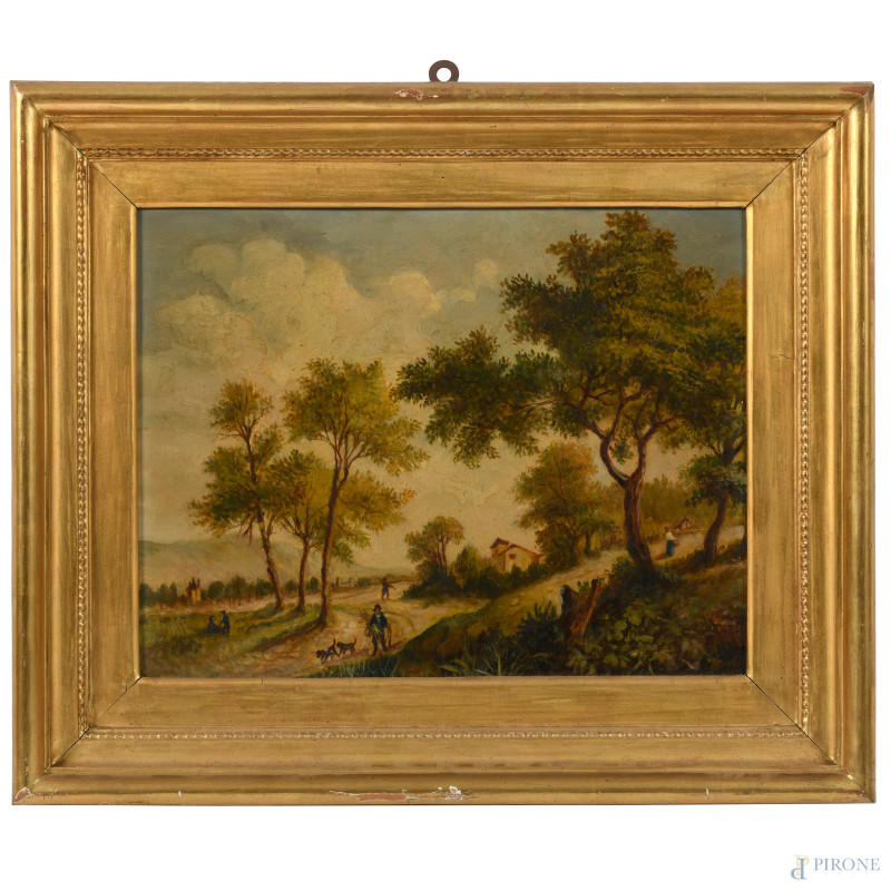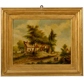 Coppia di paesaggi fiamminghi, XX secolo, olio su compensato, cm 33x42, entro cornice
