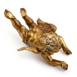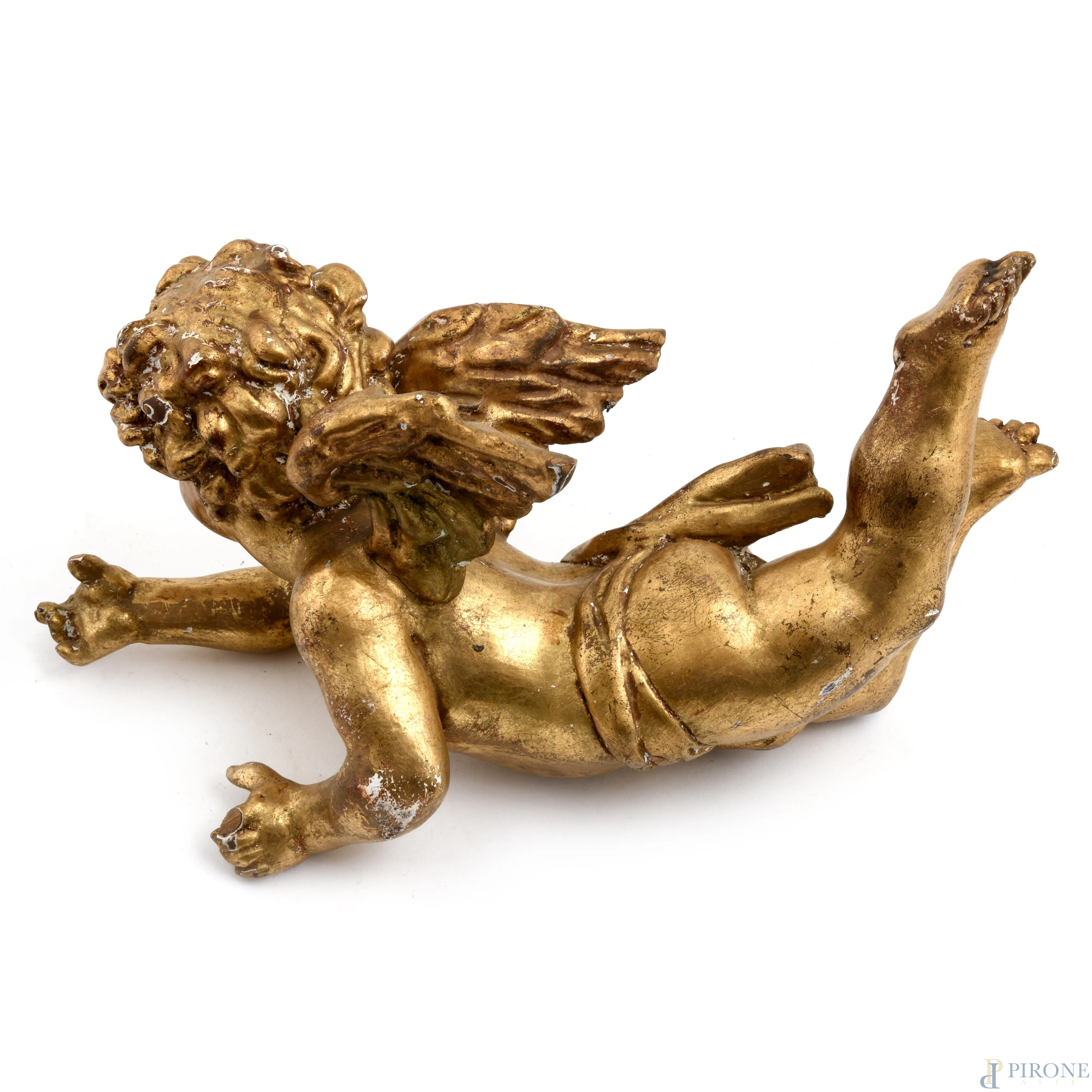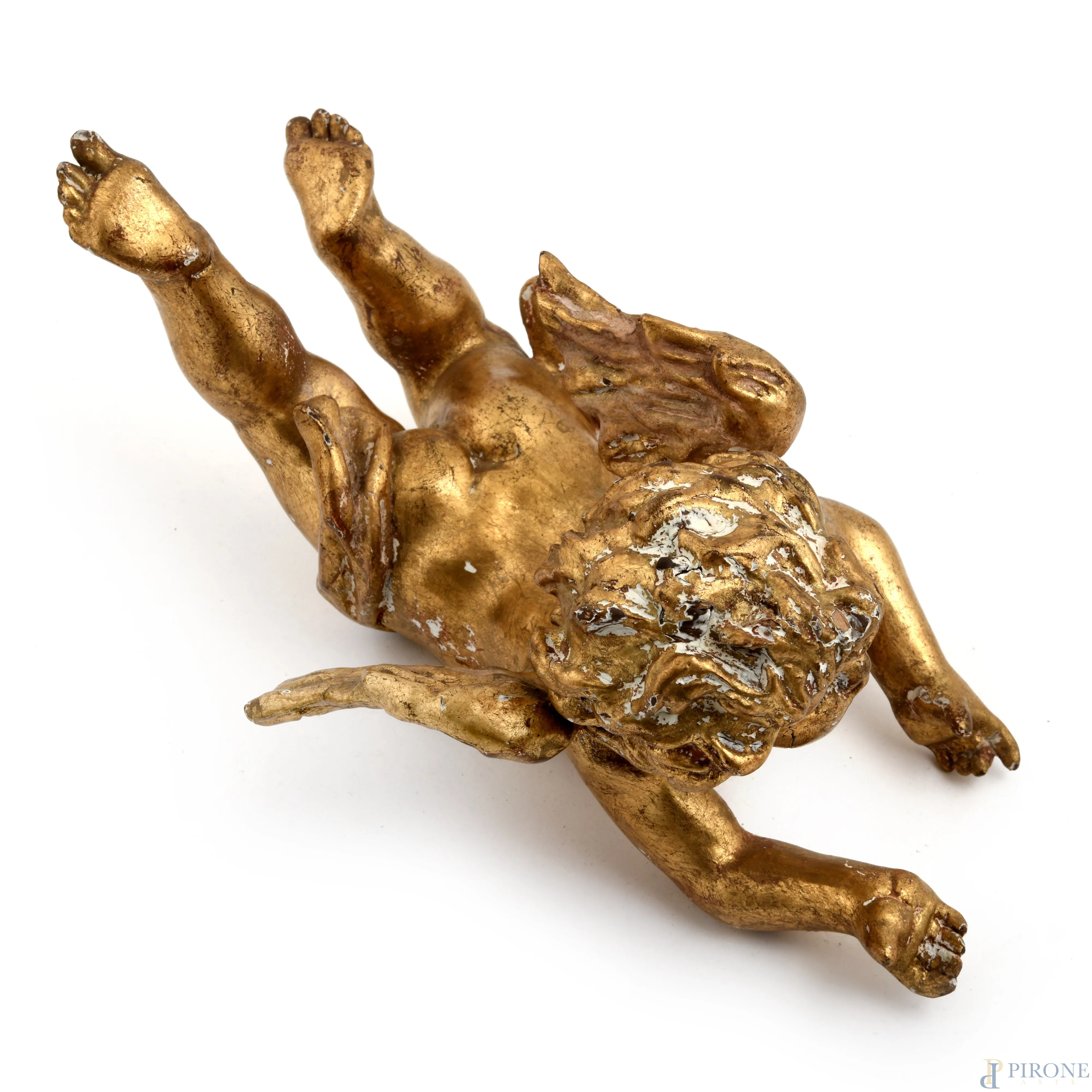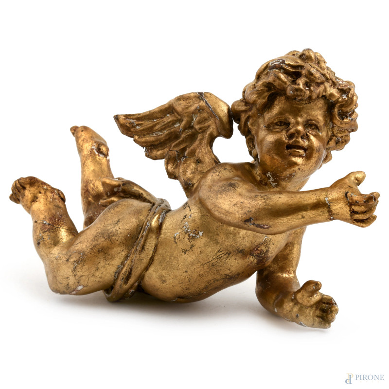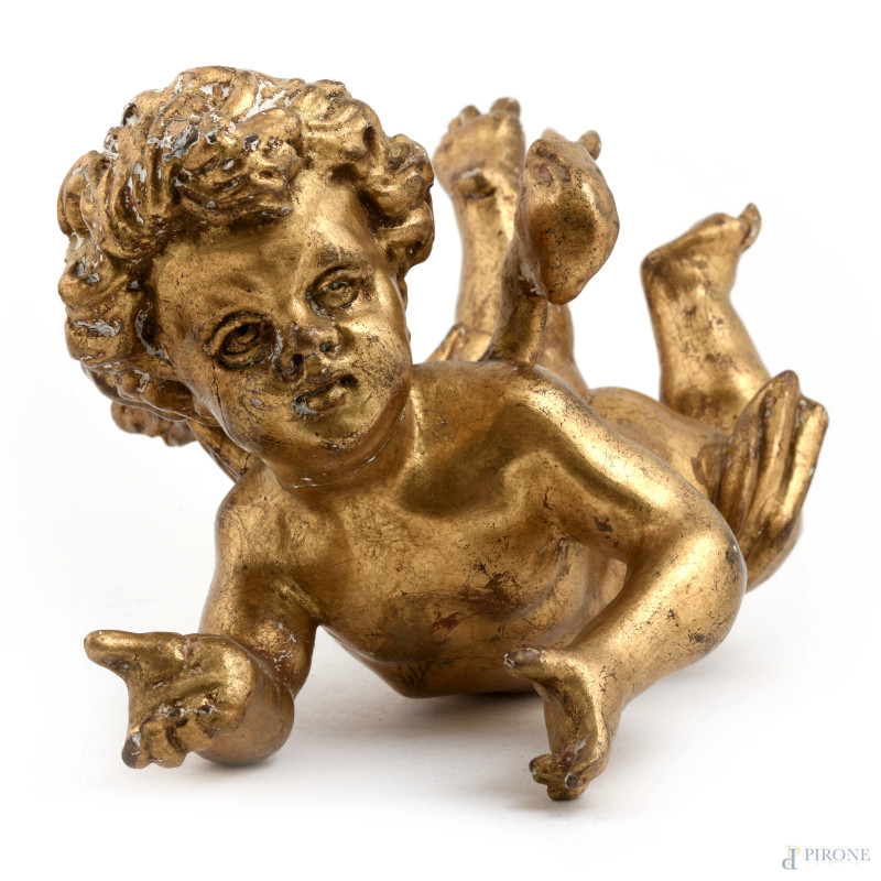 Coppia di putti in legno dorato e intagliato, XX secolo, cm 14,5x26x16, (scalfiture, rotture, mancanze, restauri, cadute di doratura, difetti)