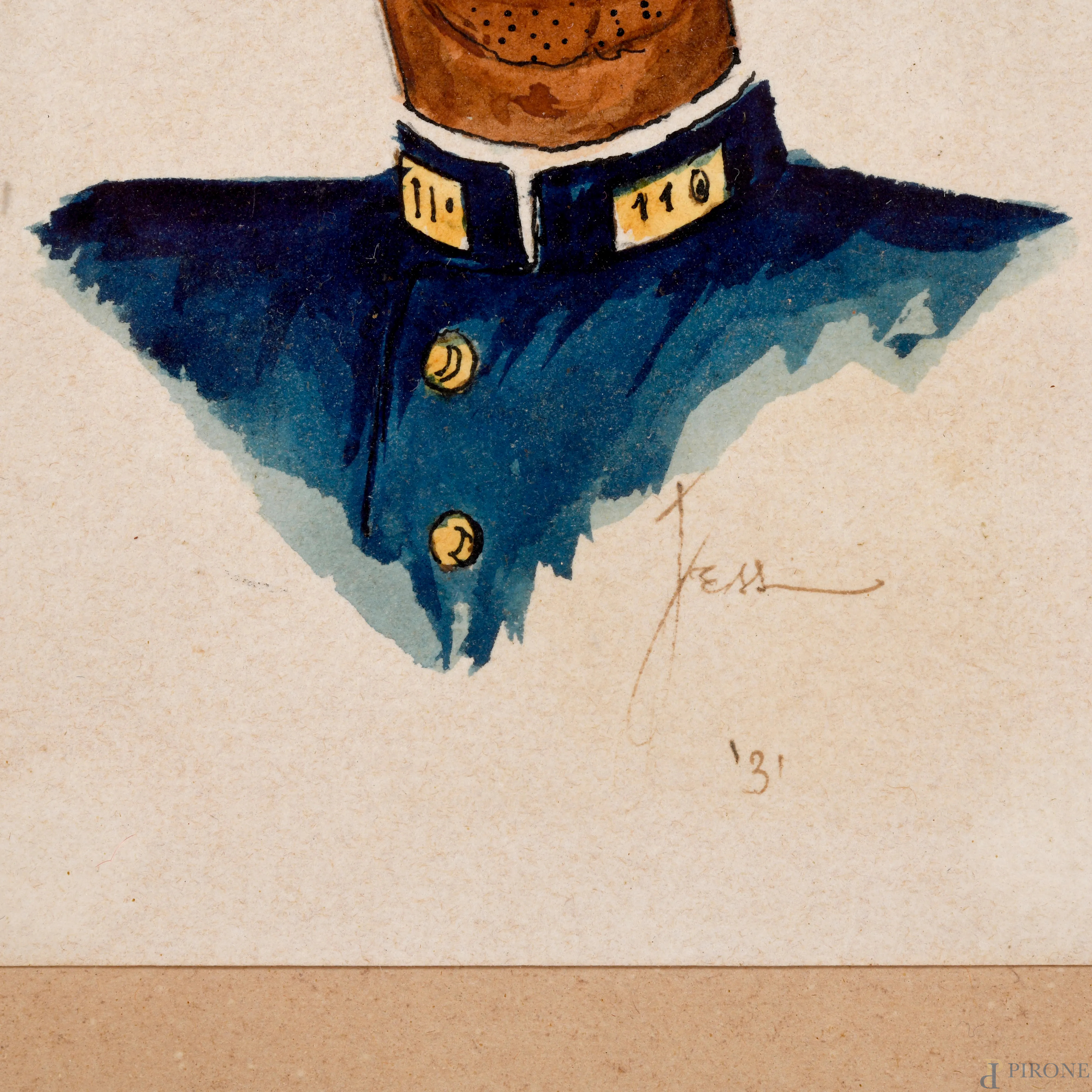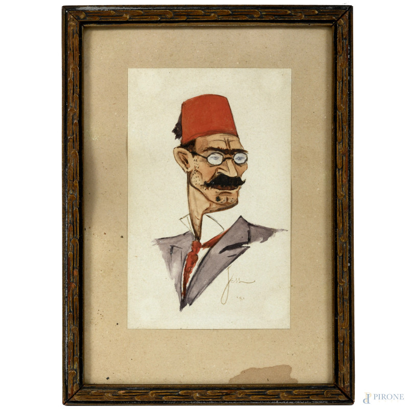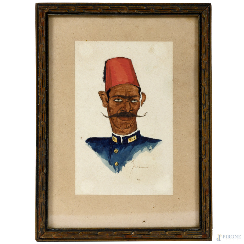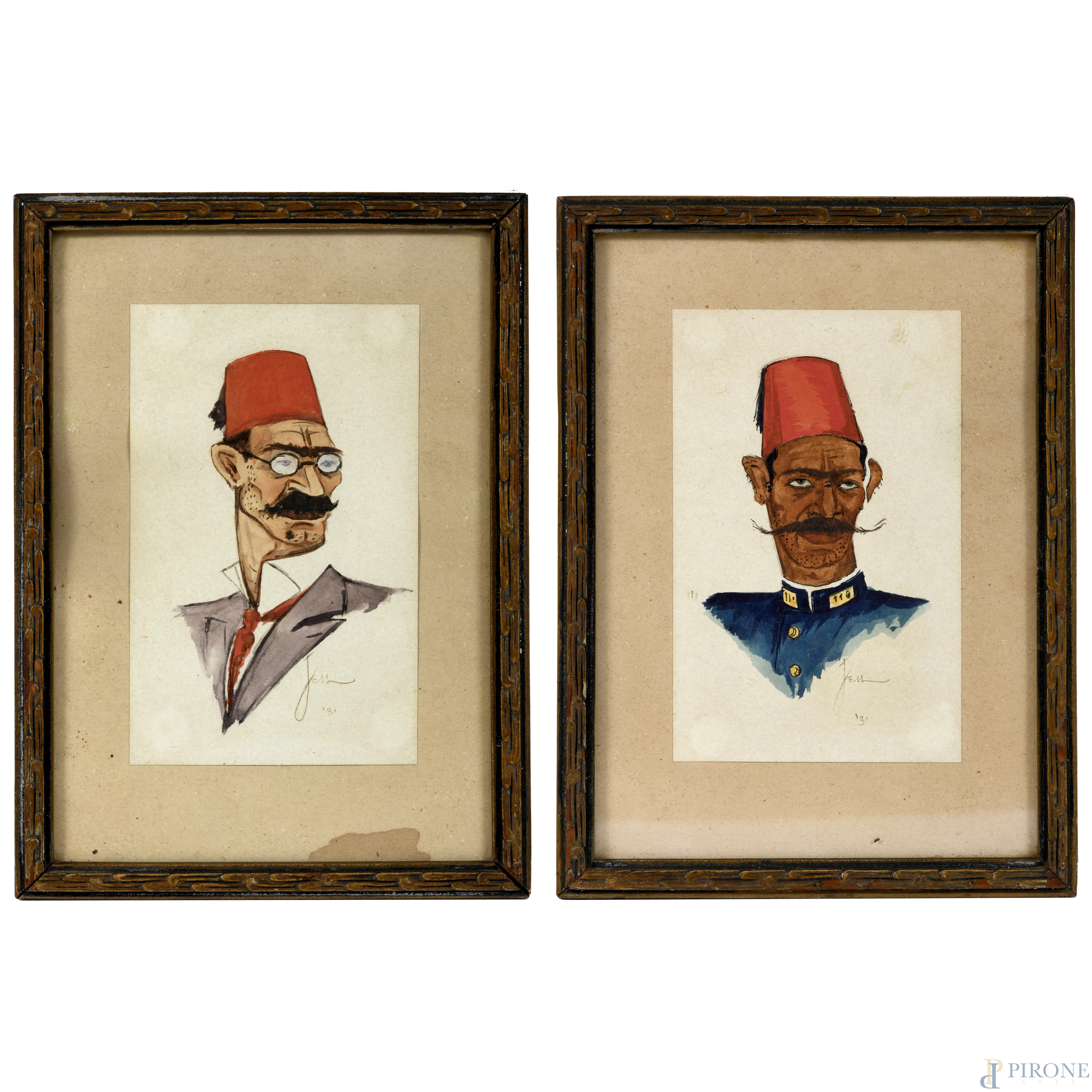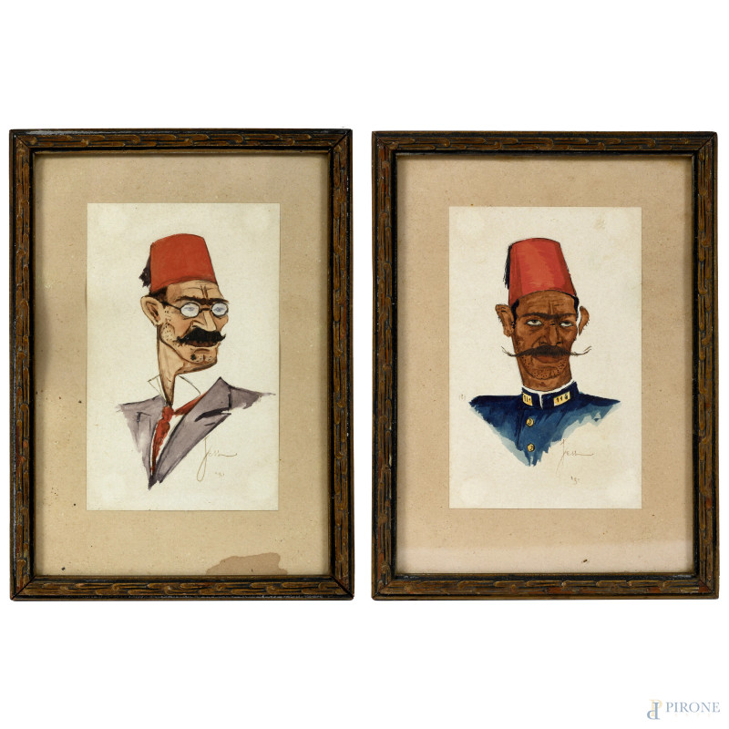 Coppia di ritratti raffiguranti turchi, tecnica mista su carta, cm 13,5x8,5, firmati in basso, entro cornice, (ondulazioni, lievi segni di umidità)