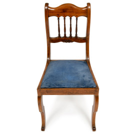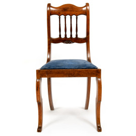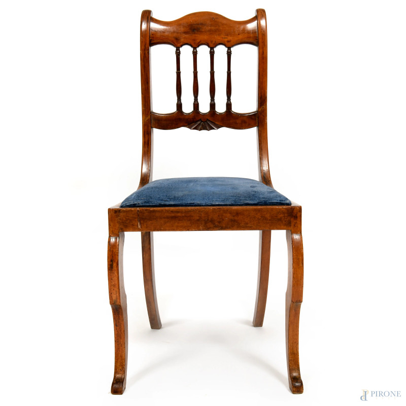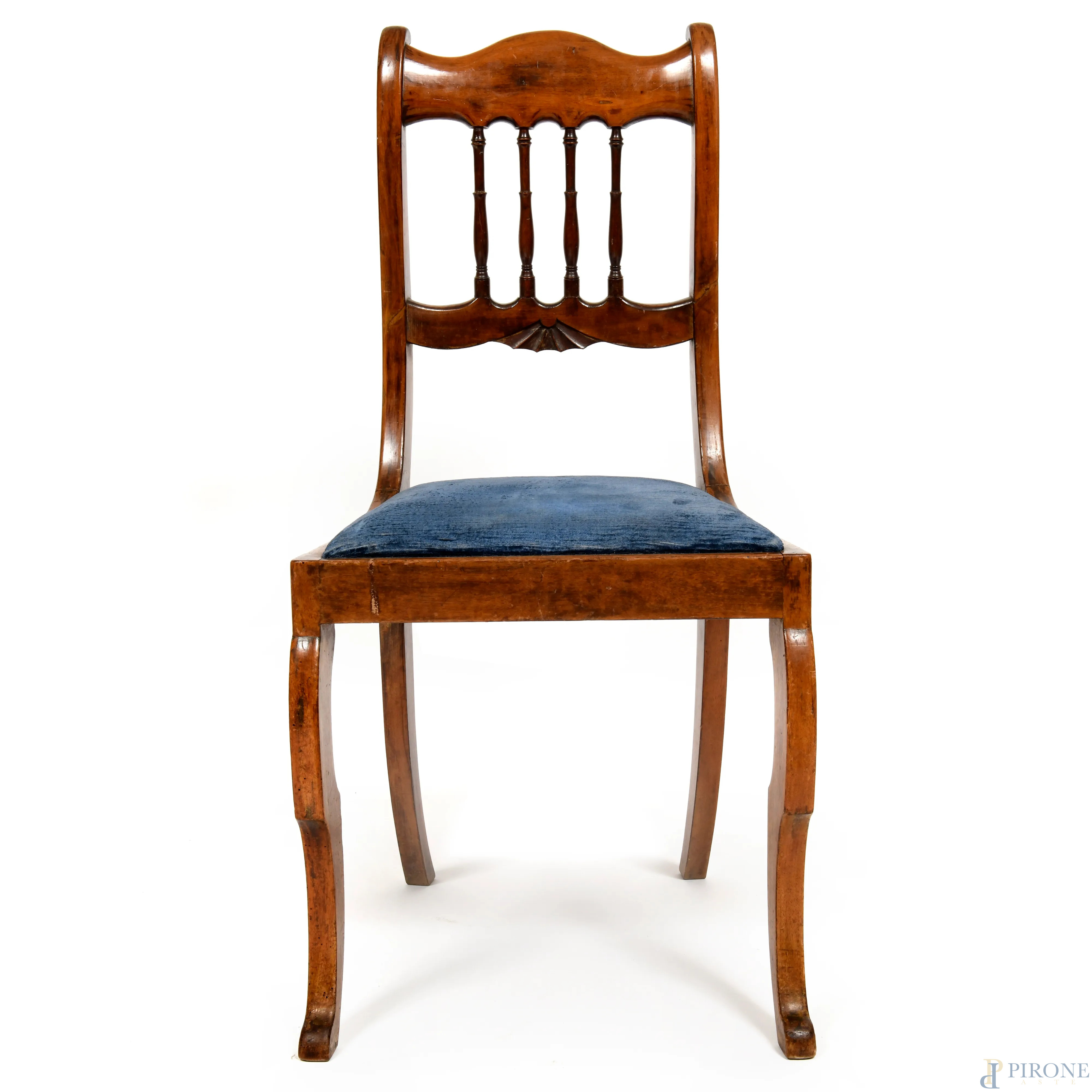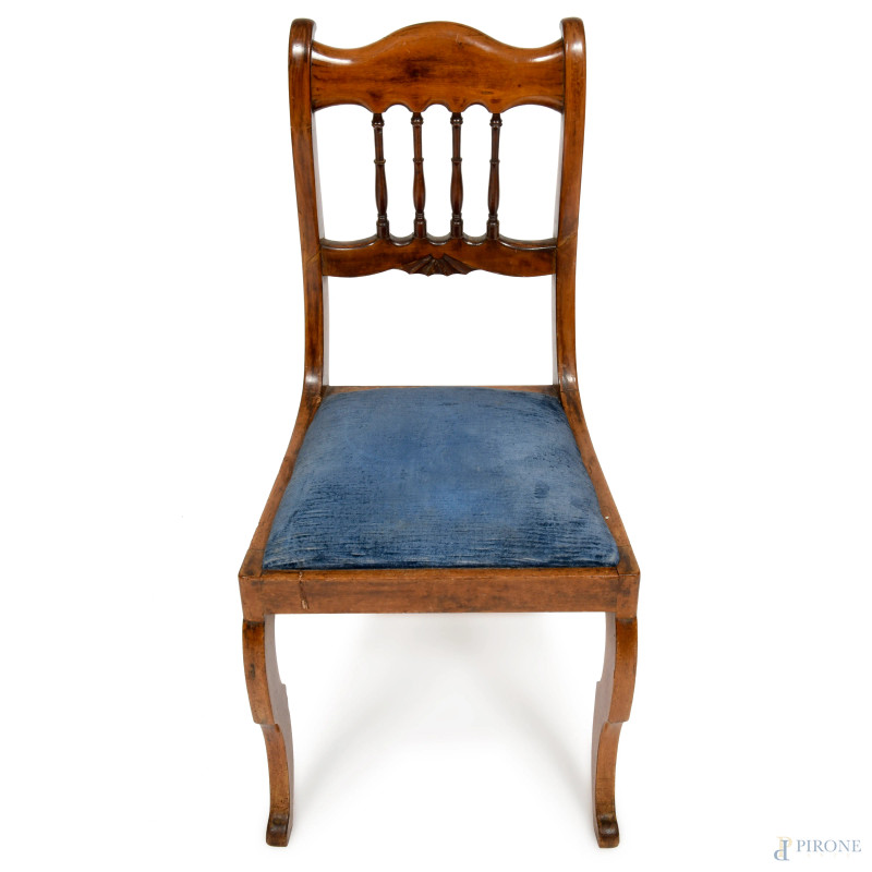 Coppia di sedie in noce con schienale sagomato intagliato e gambe mosse, sedute in vimini rivestite in velluto blu, XX secolo, cm 88,5x43,5x49, (segni di usura, fori di tarlo)