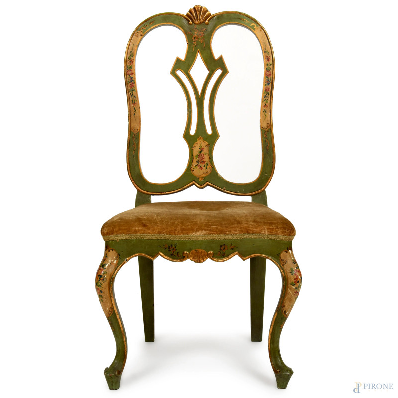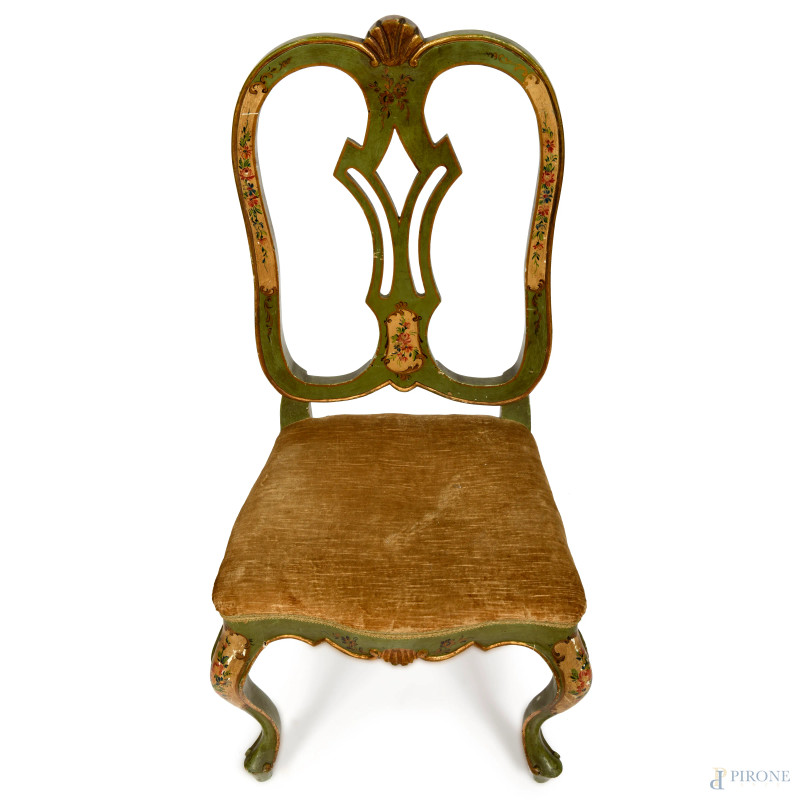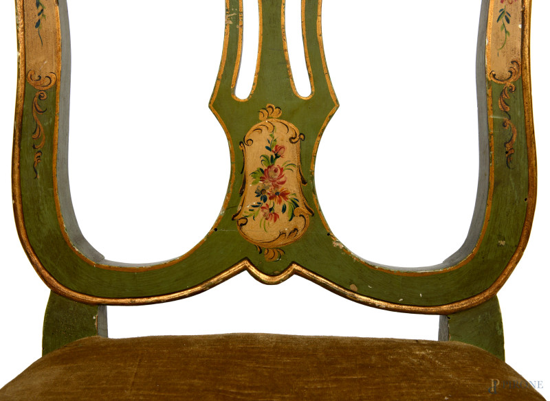 Coppia di sedie laccate verde-oro e dipinte a decori floreali, con schienale sagomato intagliato e sedute in tessuto, XX secolo, cm 93x46x46, segni di usura, cadute di colore, scalfiture, restauri, fori di tarlo)