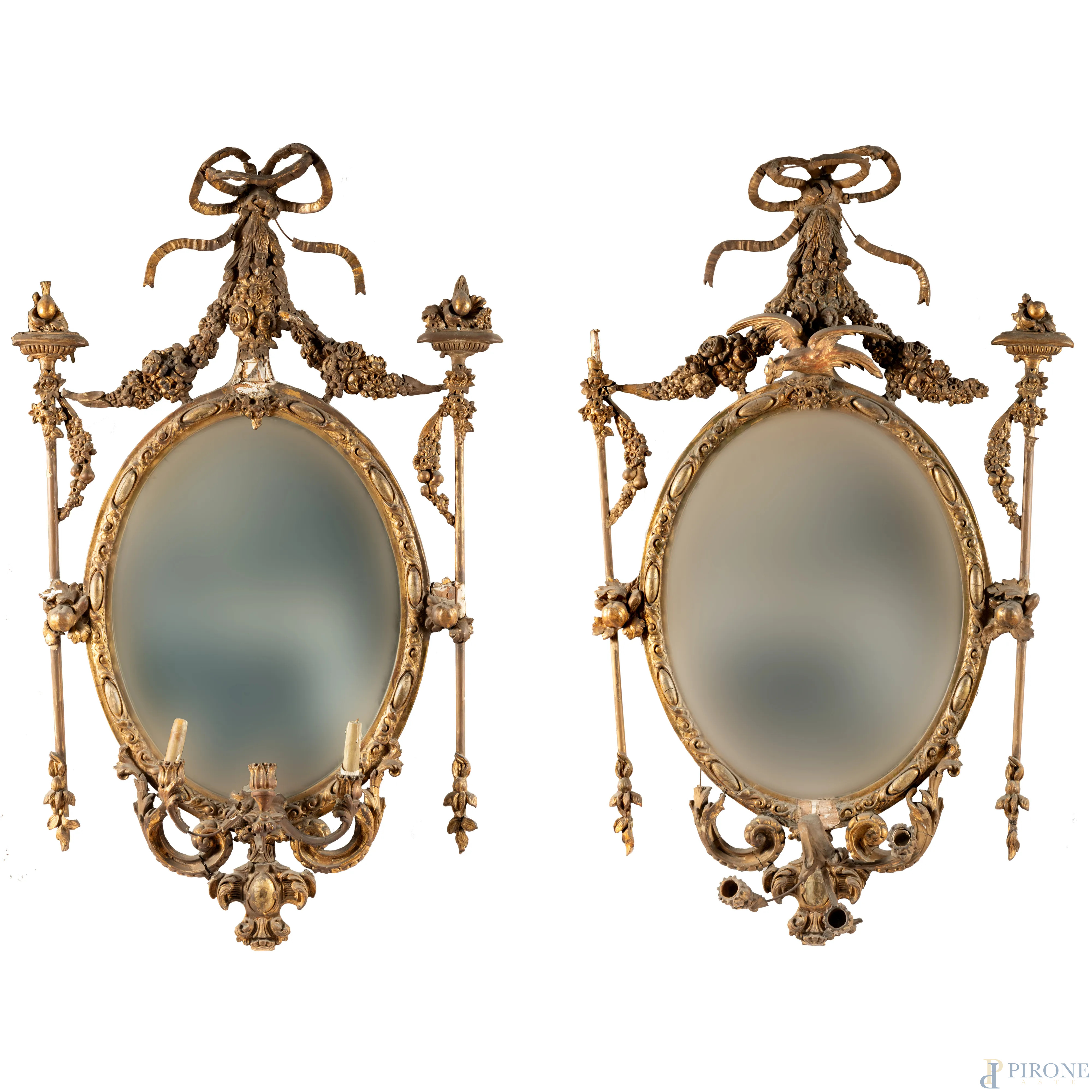 Coppia di specchiere ovali in legno e stucco dorato, XIX secolo, cm 116x62 (rotture, mancanze, difetti)
