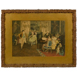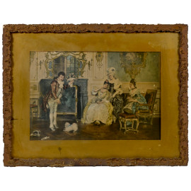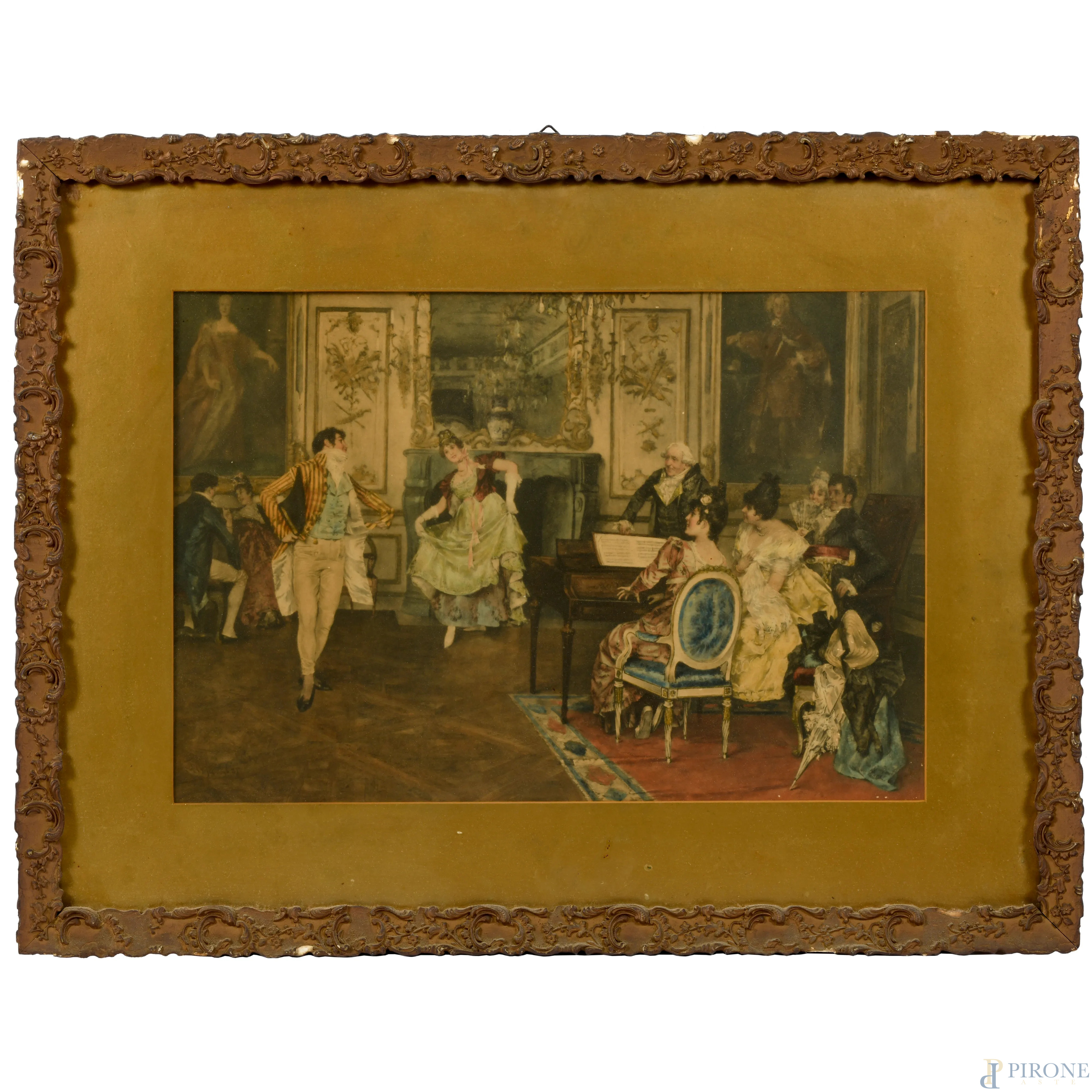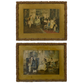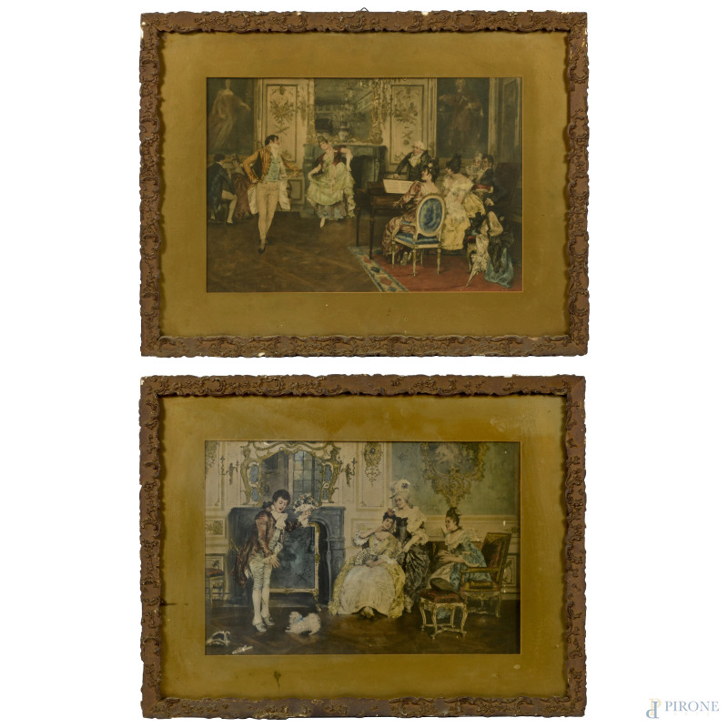 Coppia di stampe a colori raffiguranti scene cortesi in interni, XX secolo, cm 48,5x64,5 compreso passepartout, entro cornice (difetti, gore, umidità)