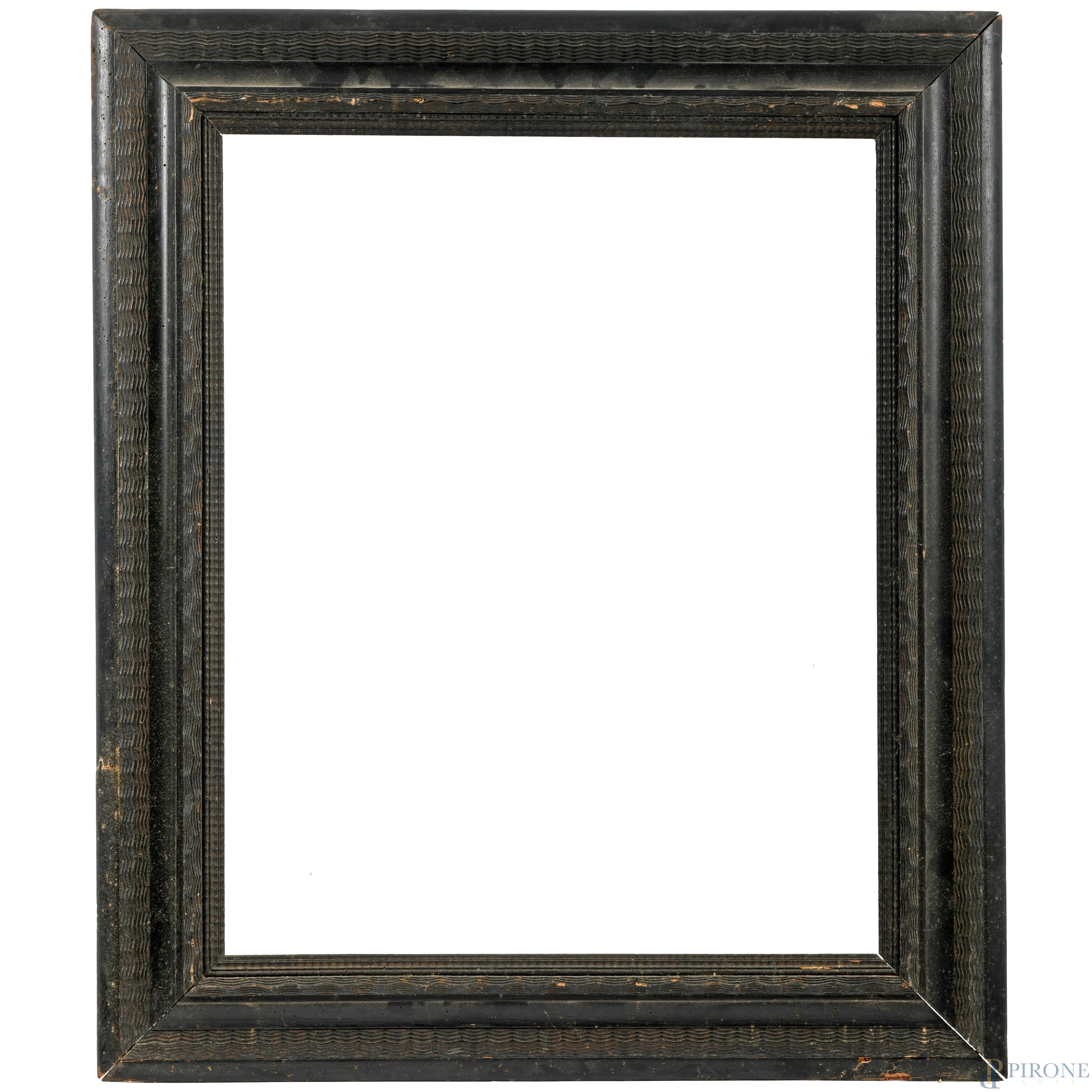Cornice guilloche a più ordini di intaglio in legno laccato, XX secolo, cm 88x74, luce cm 66x52, (difetti, tarli)
