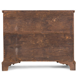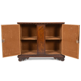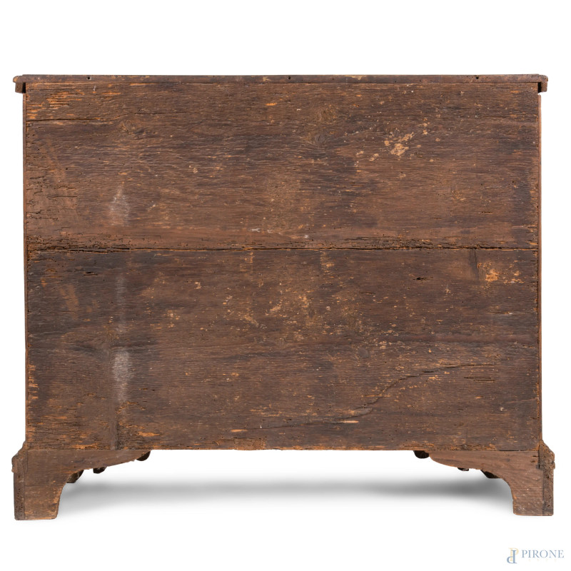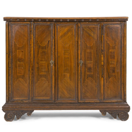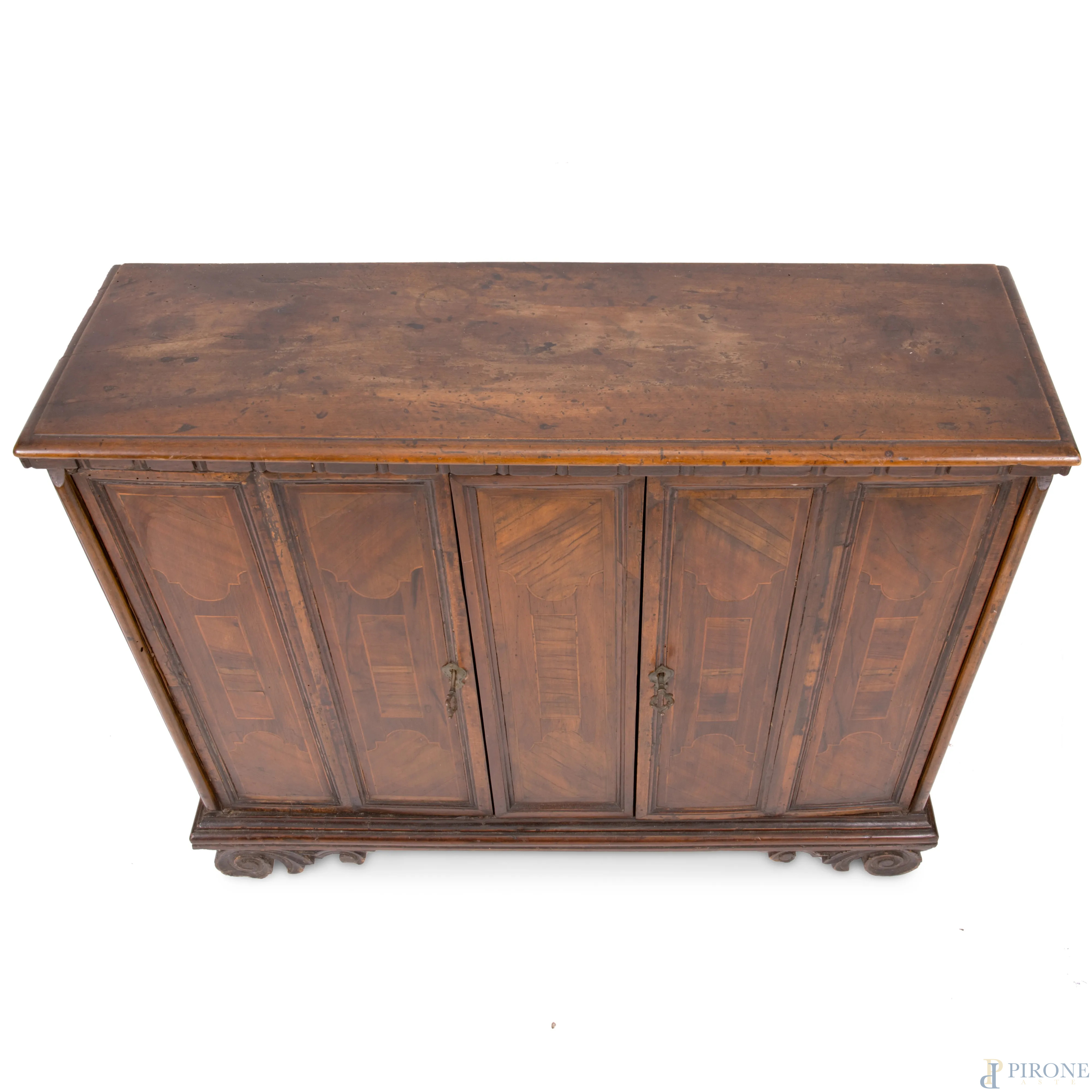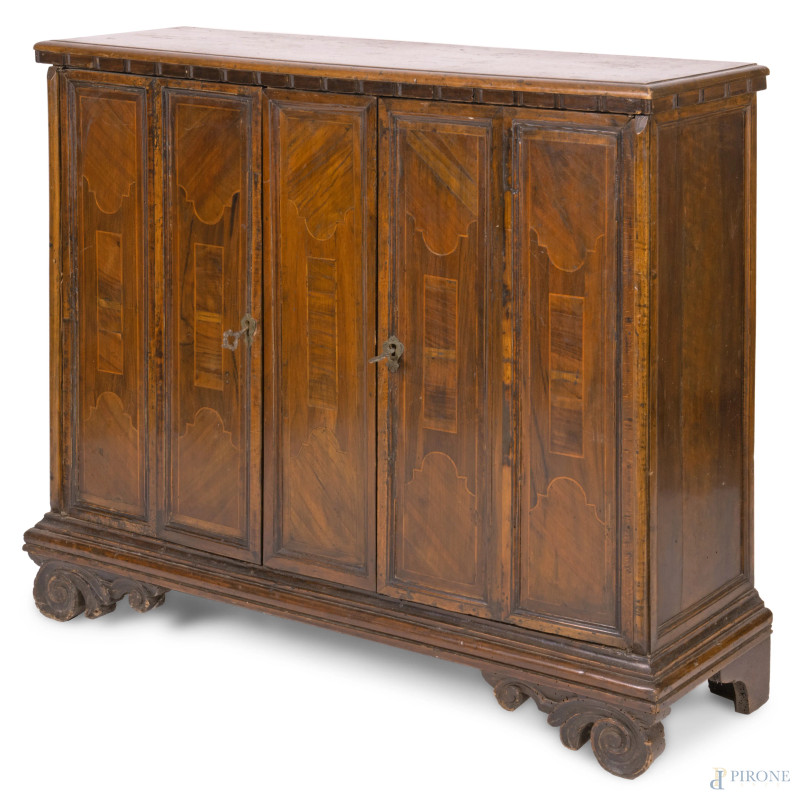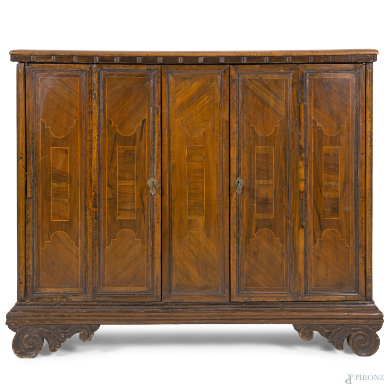 Credenza in noce a due sportelli in noce con modanature e intarsi al fronte, XVIII-XIX secolo, cm 89,5x105,5x30, (segni di usura, graffi, scalfiture, fori di tarlo, parti sostituite)