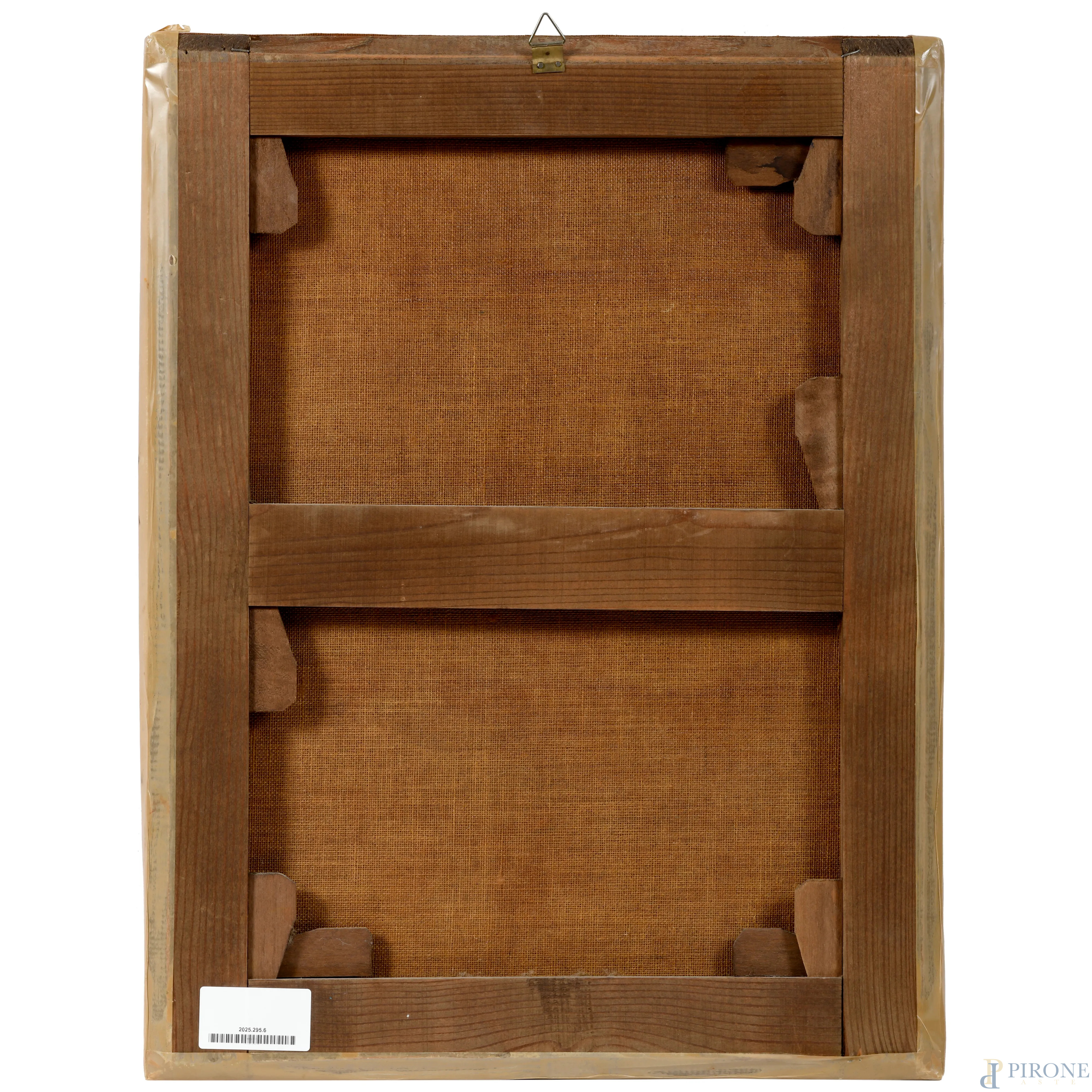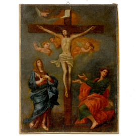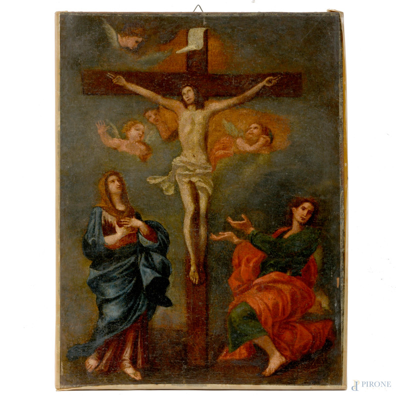 Crocifissione, XVIII-XIX secolo, olio su tela, cm 54x41, entro cornice (craquelure, sollevamenti di colore, cadute)