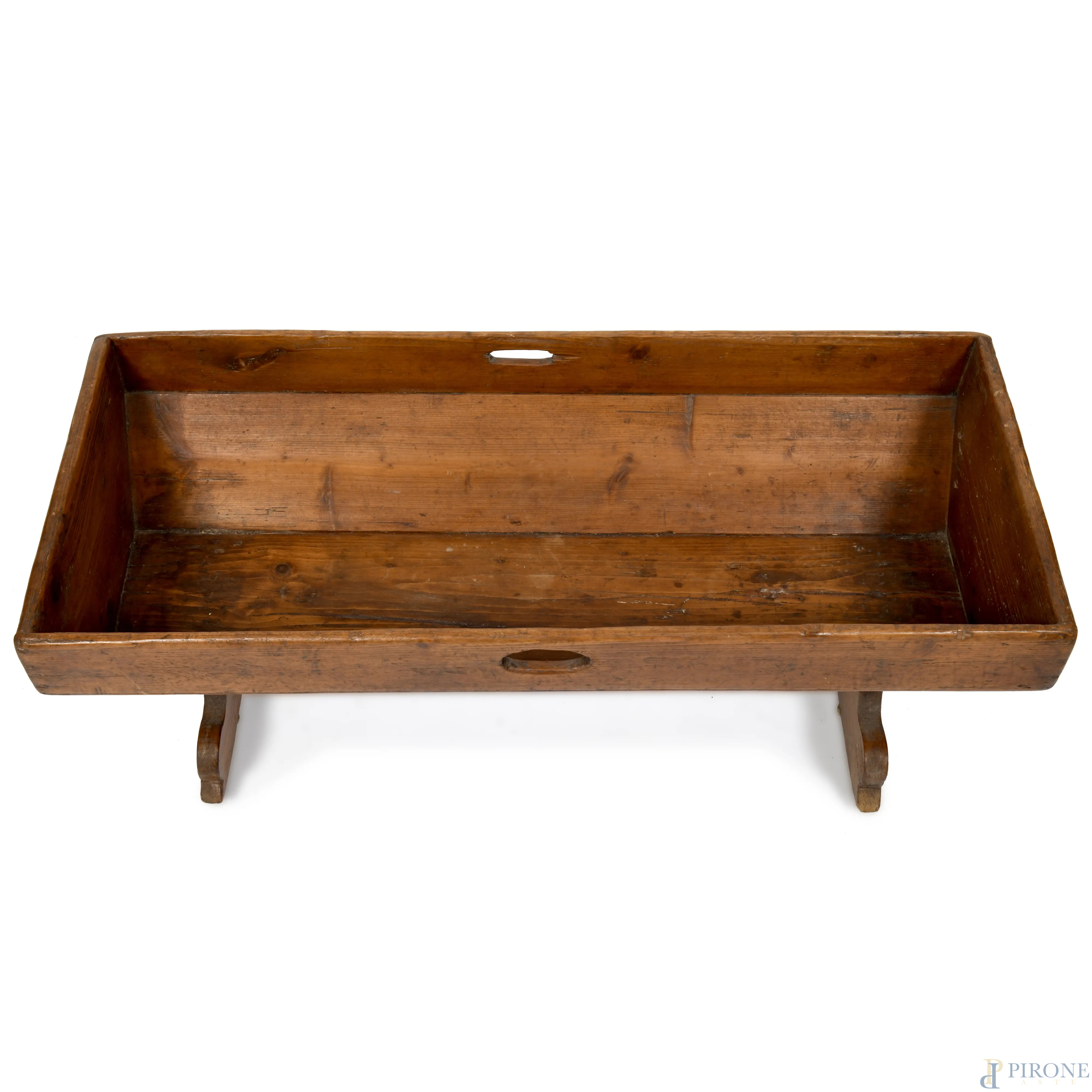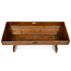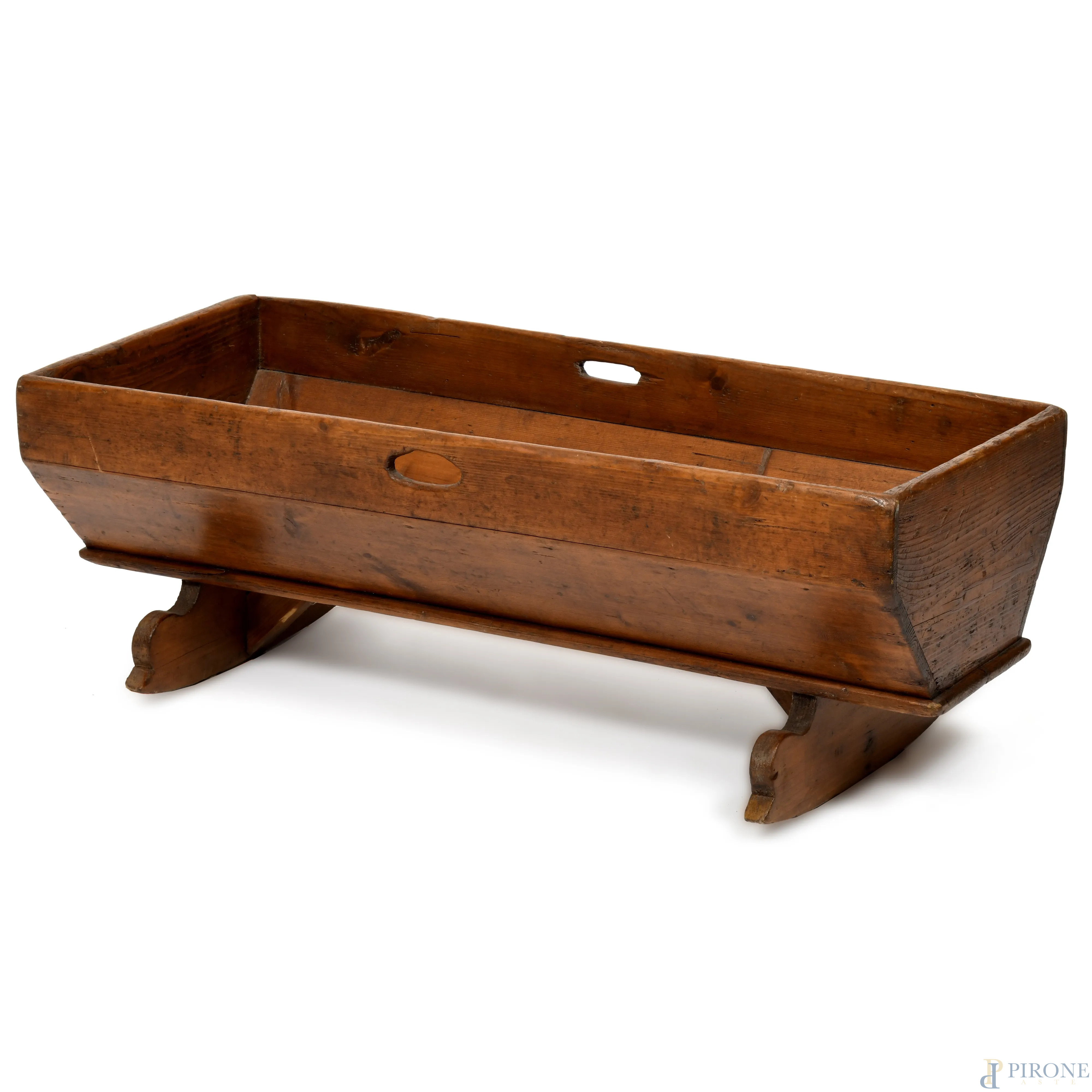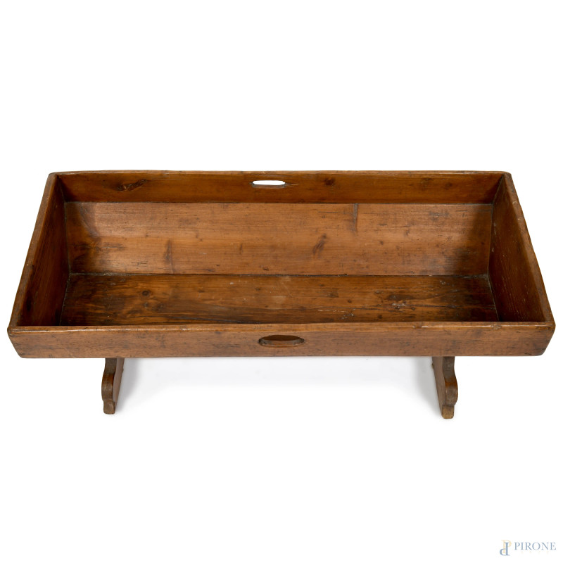 Culla in noce, XX secolo, cm 32x90,5x38, segni di usura del tempo, scalfiture, fori di tarlo)