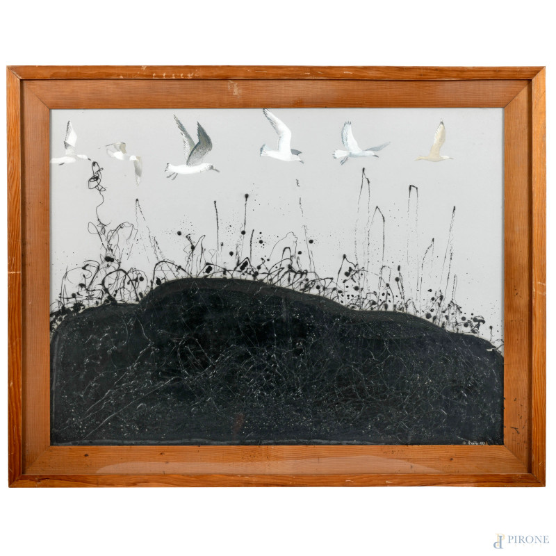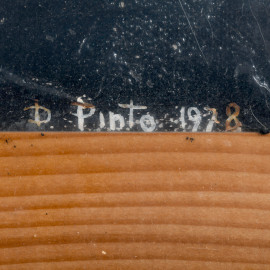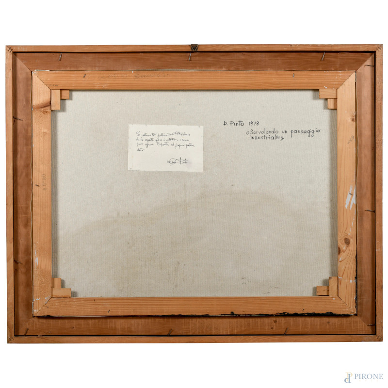 Dino Pinto (XX secolo), Sorvolando un paesaggio industriale, olio su tela, cm 47x70, entro cornice