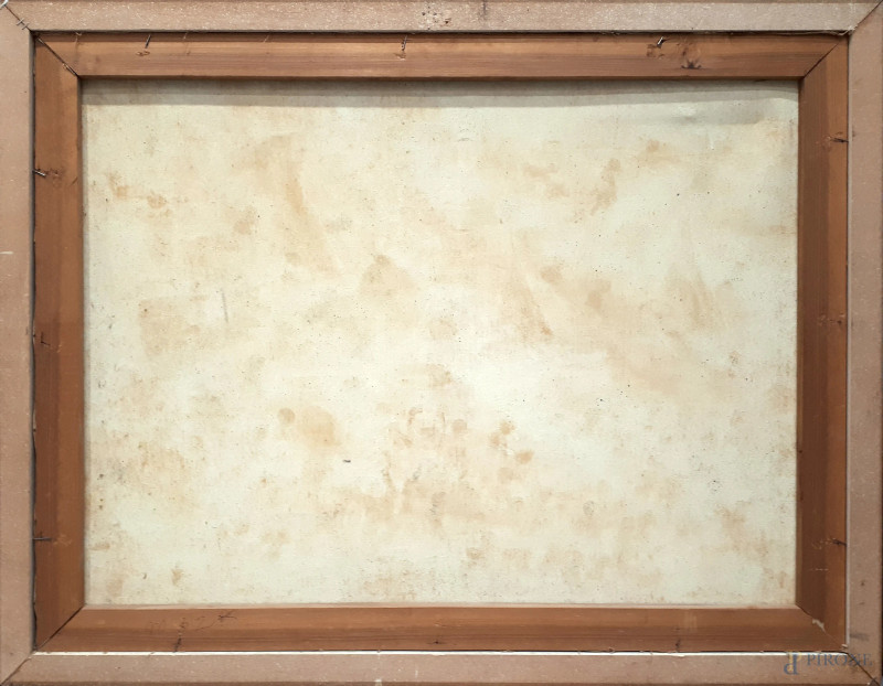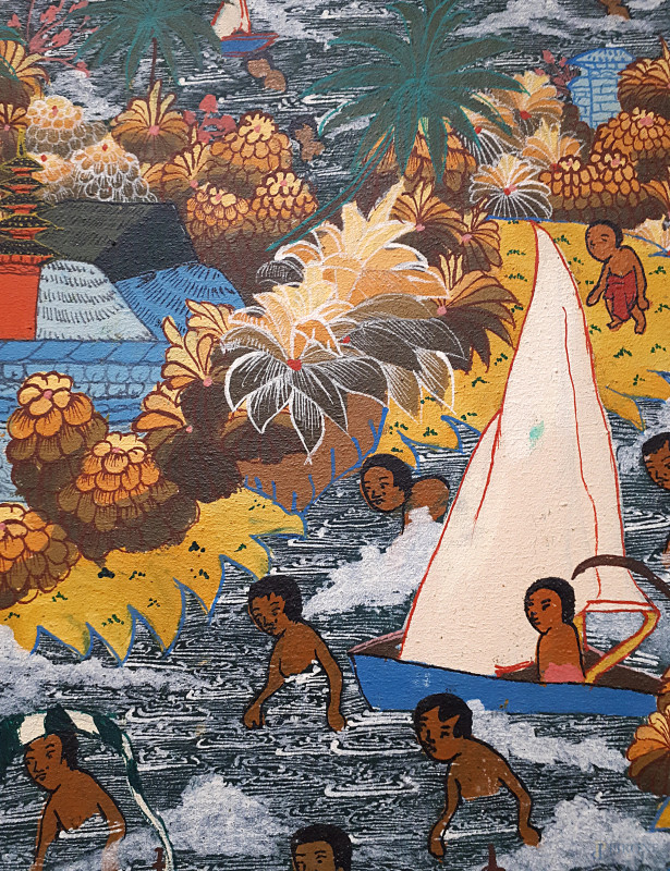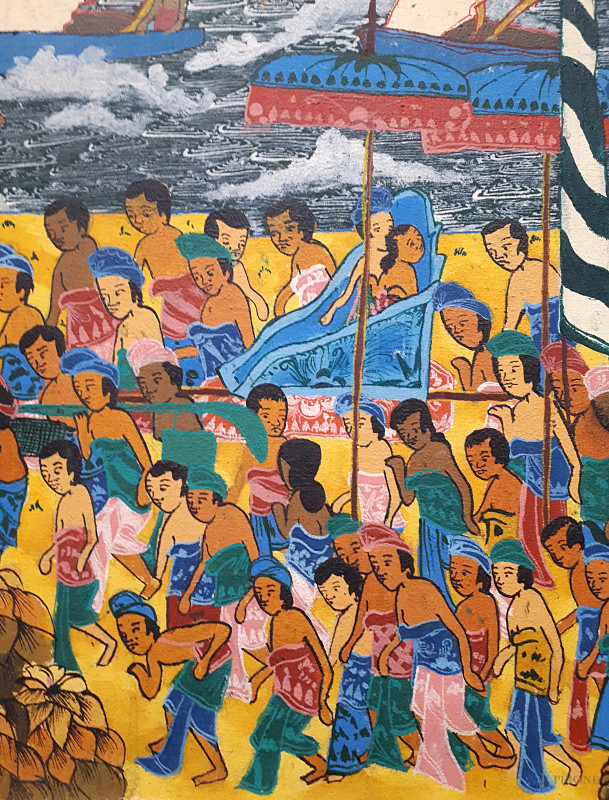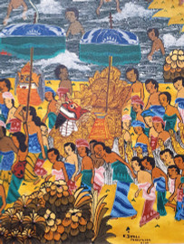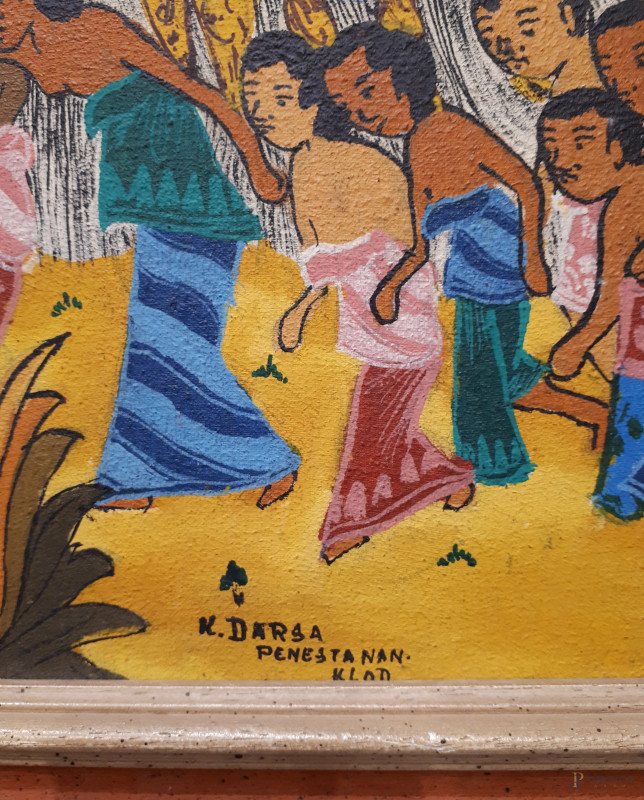 Dipinto ad olio su tela su tela raffigurante dignitari in processione nella spiaggia sulla laguna, scuola “Balinese della prima metà del XX sec. nello stile “Ubud”, cm 70x90, firmato e titolato, con cornice