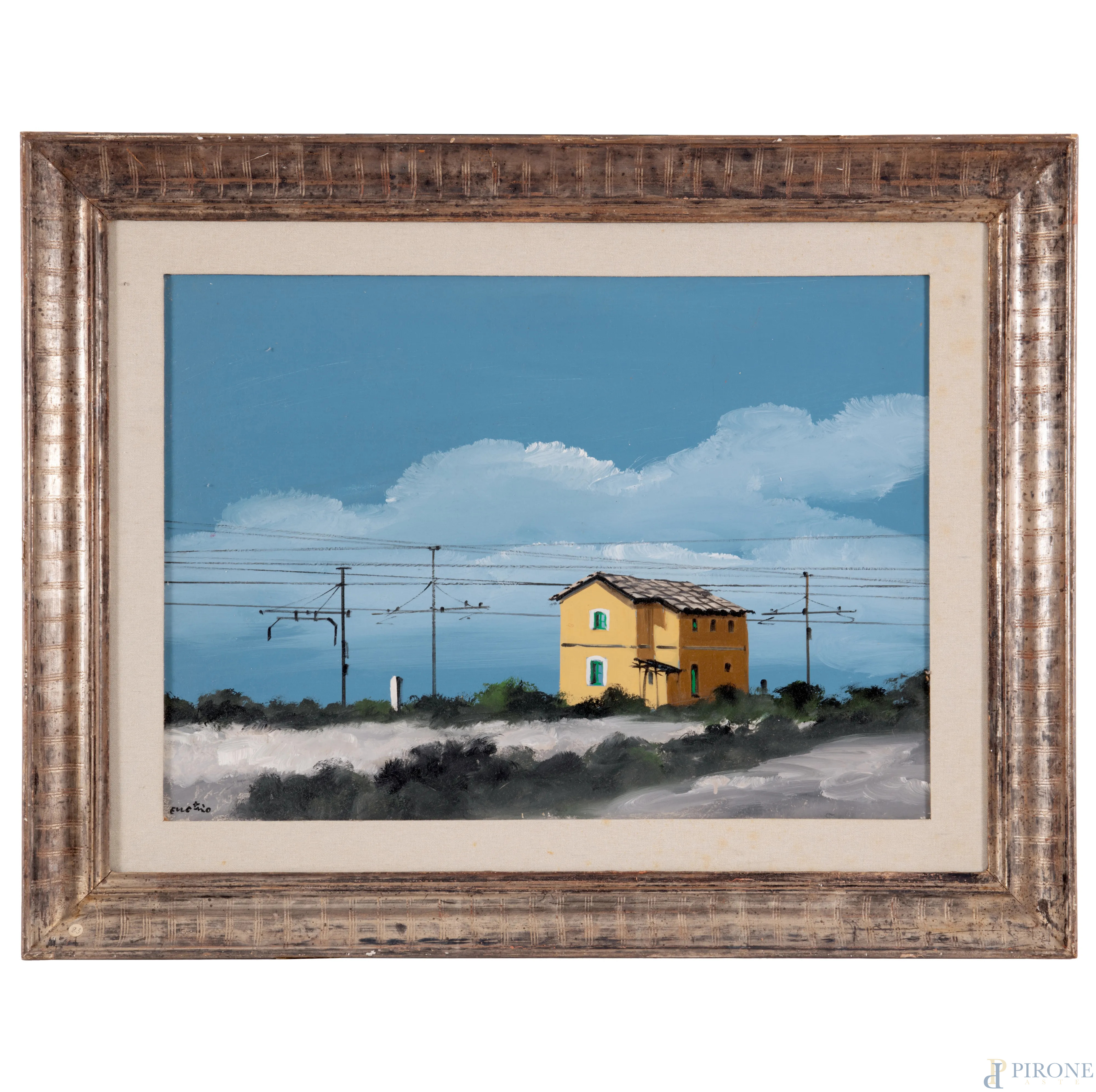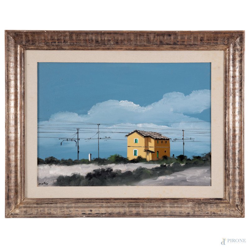 Enotrio Pugliese ( 1920-1989), Casello ferroviario, olio su compensato, cm 50x70, firmato in basso, entro cornice