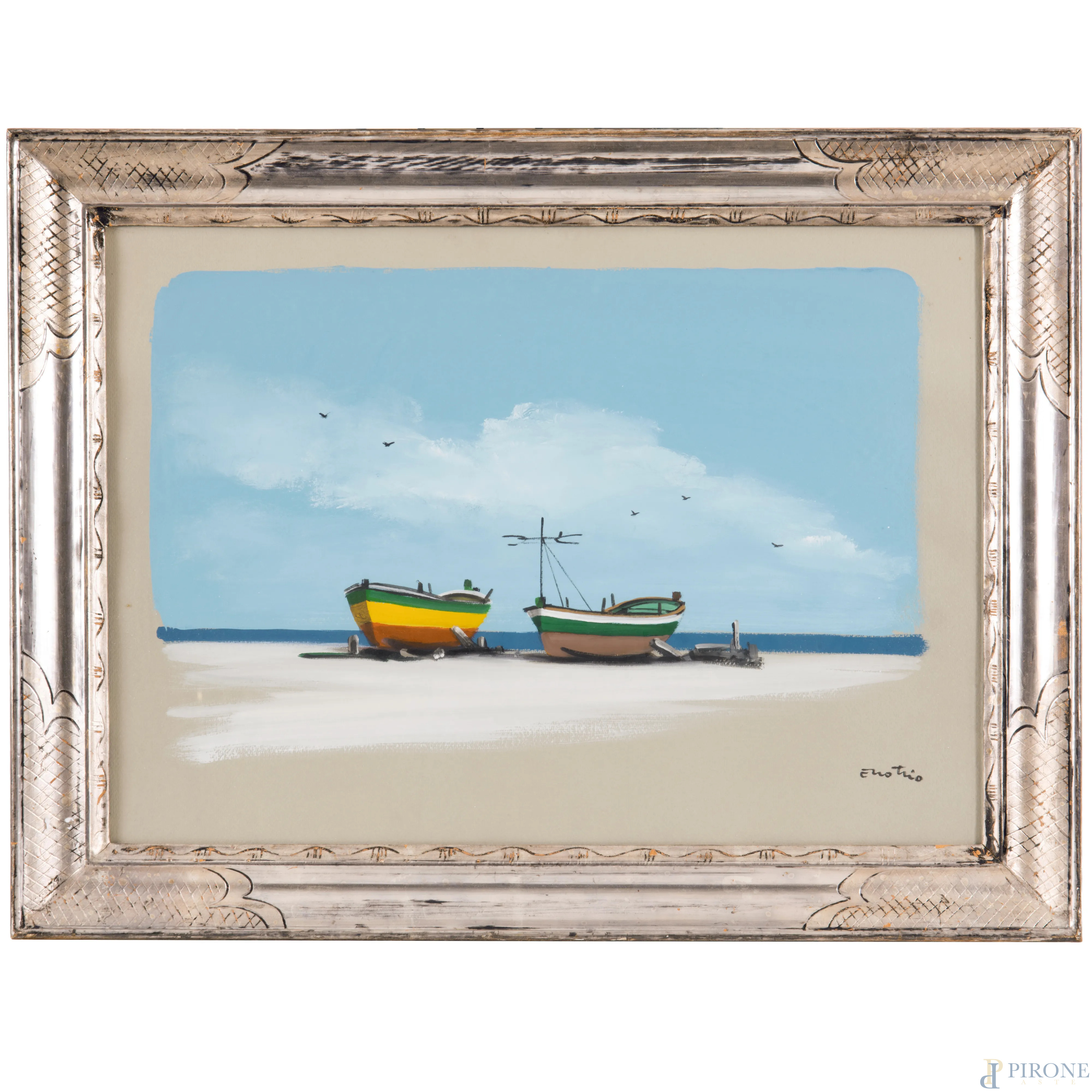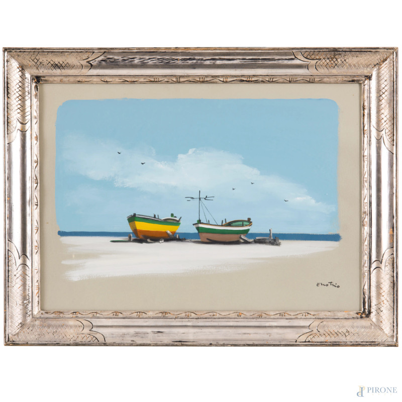 Enotrio Pugliese ( 1920-1989), Marina con barche, tempera su cartone, cm 50x70, firmato in basso, entro cornice