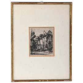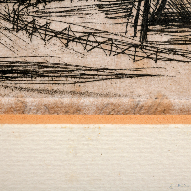 Enrico Castelli (1909-1980), Scorcio di facciata, acquaforte, cm 41x31 compreso passepartout, firmato in basso a destra, entro cornice