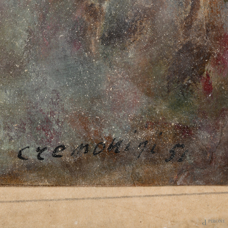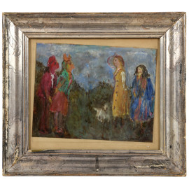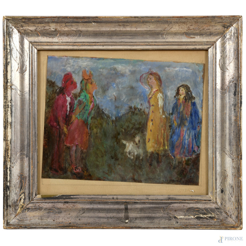 Figure in costume, XX secolo, tecnica mista su carta applicata su cartoncino, cm 27,5x35, firmato e datato "51" in basso a destra, entro cornice (ondulazioni della carta, umidità, piccoli strappi, mancanze ai margini)