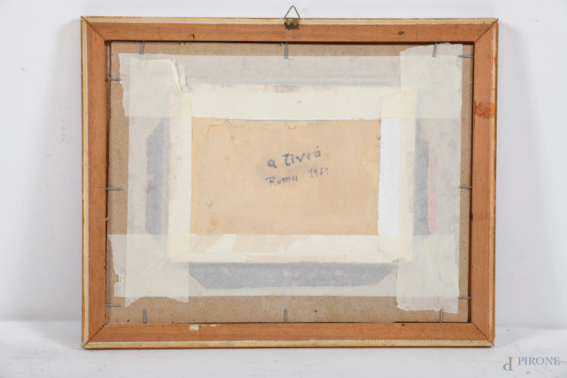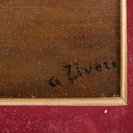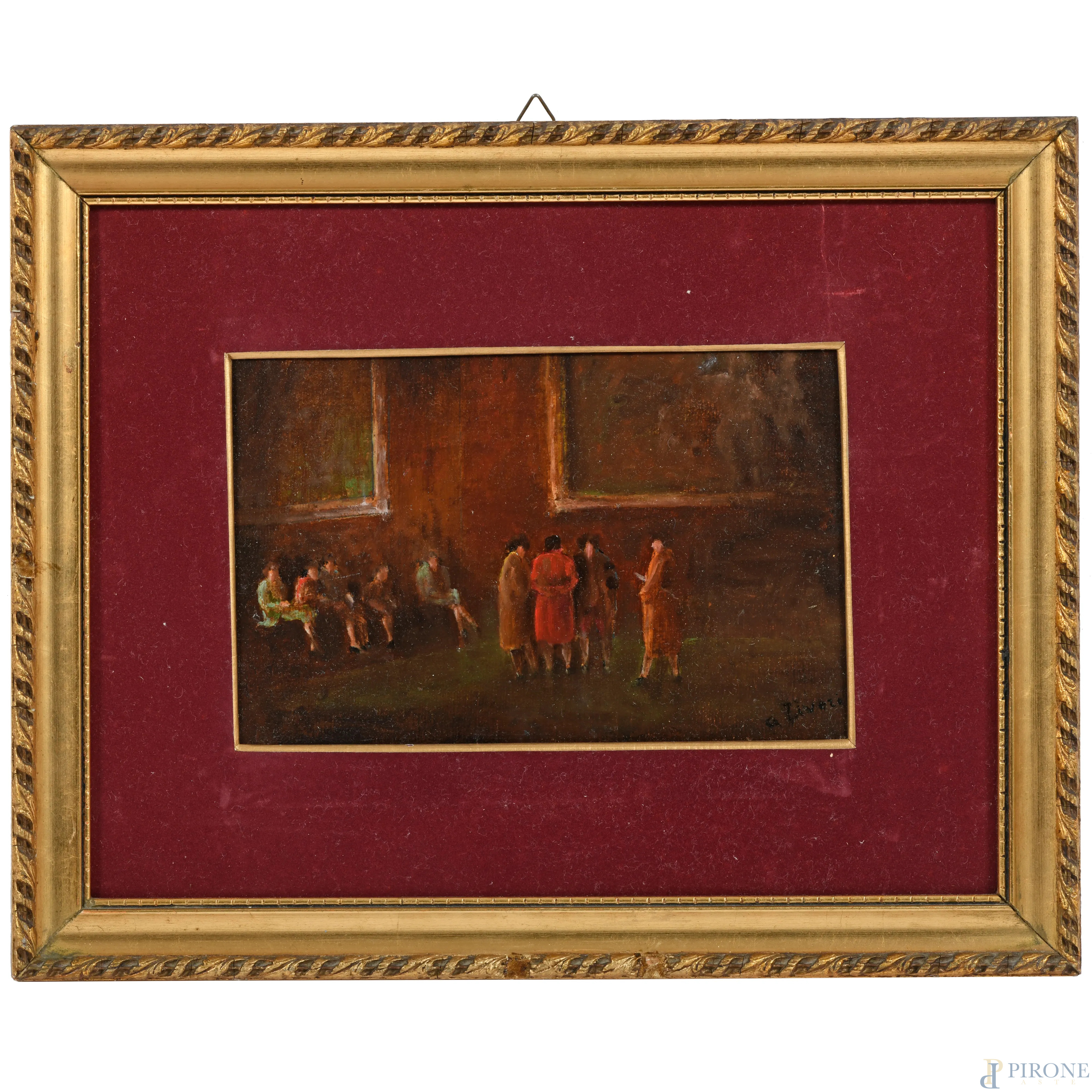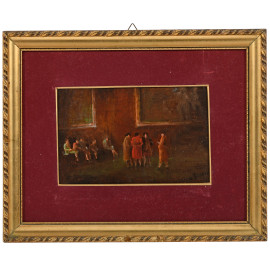 Figure in interno, XX secolo, olio su carta applicata su cartoncino, cm 12,5x19, firmato in basso a destra, entro cornice