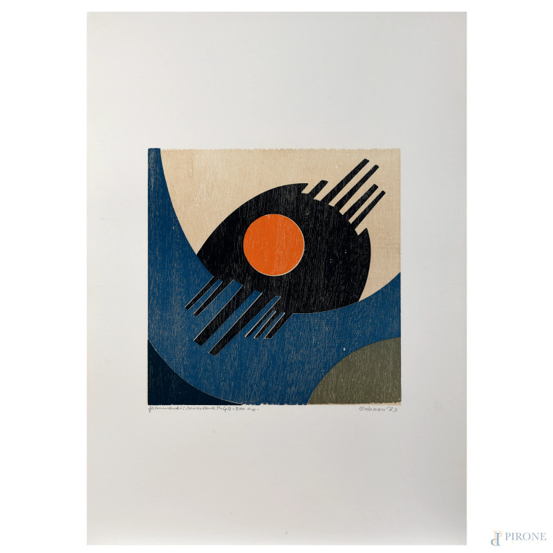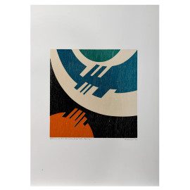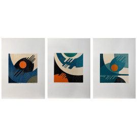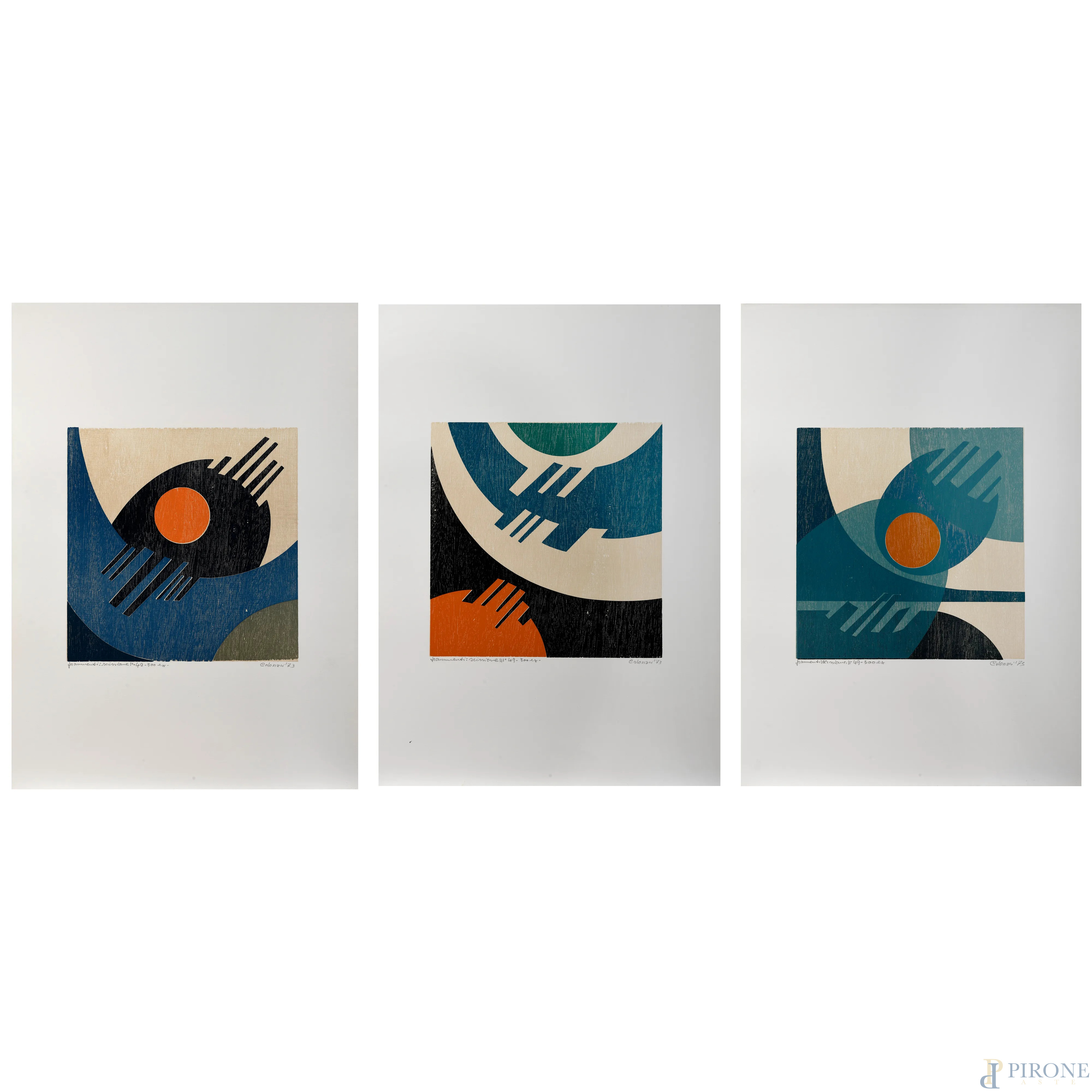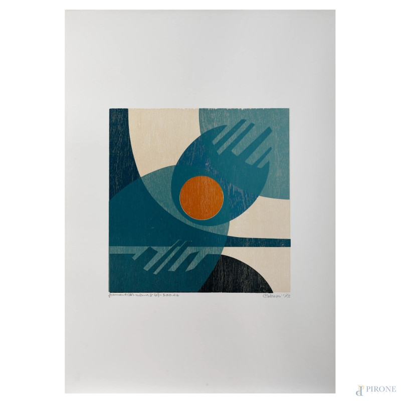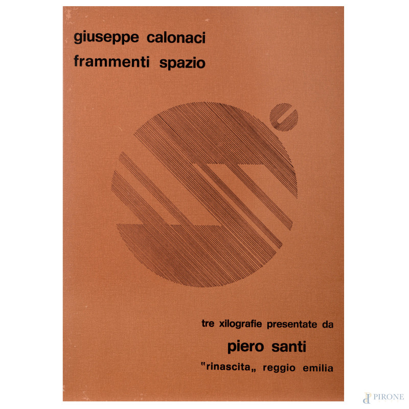 Giuseppe Calonaci (1931), Frammenti Spazio. Tre xilografie presentate da Piero Santi, "Rinascita Reggio Emilia", es. 40/300, cm 70x49, firmate e datate "73", (cartella contenente solo le tre xilografie)