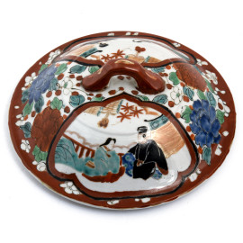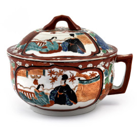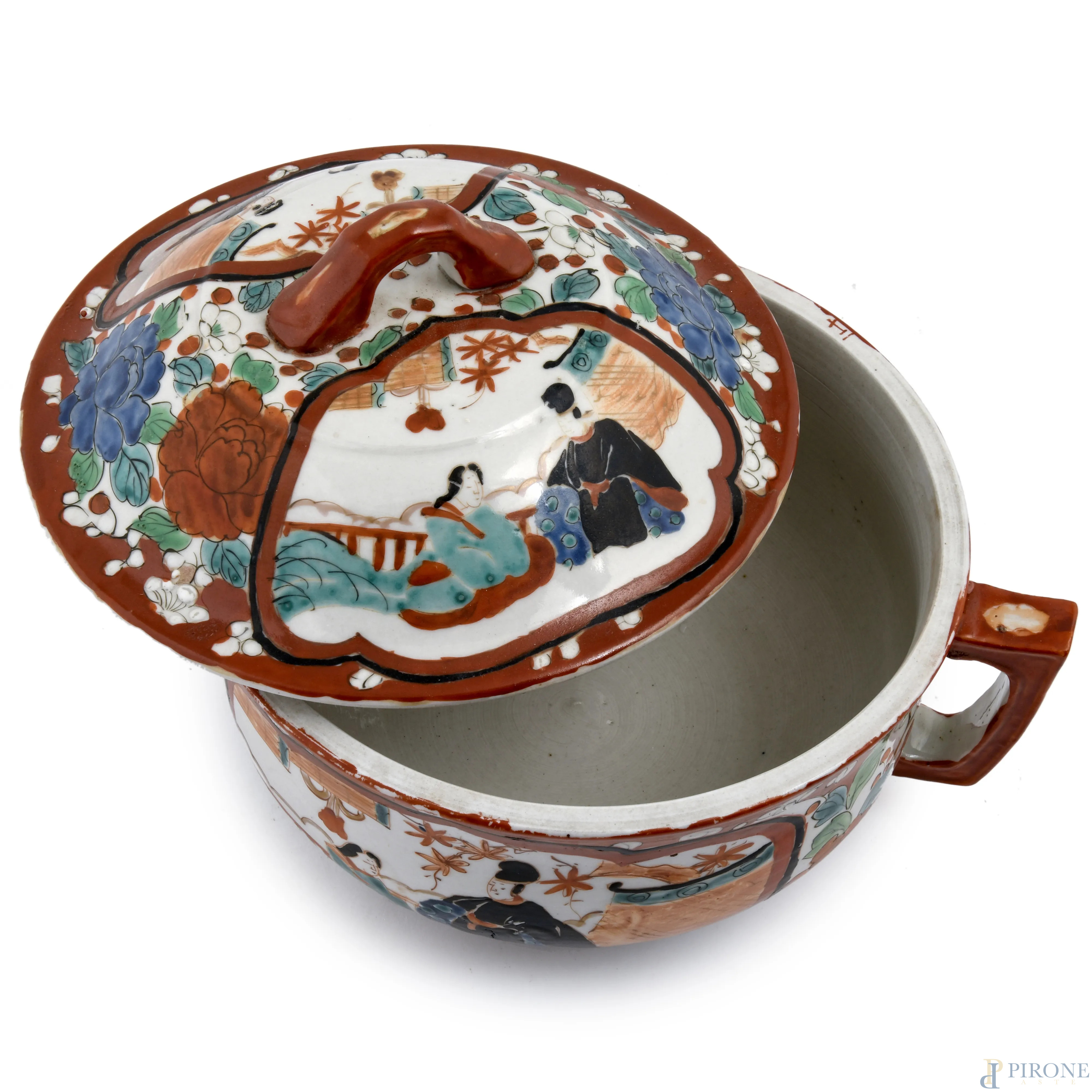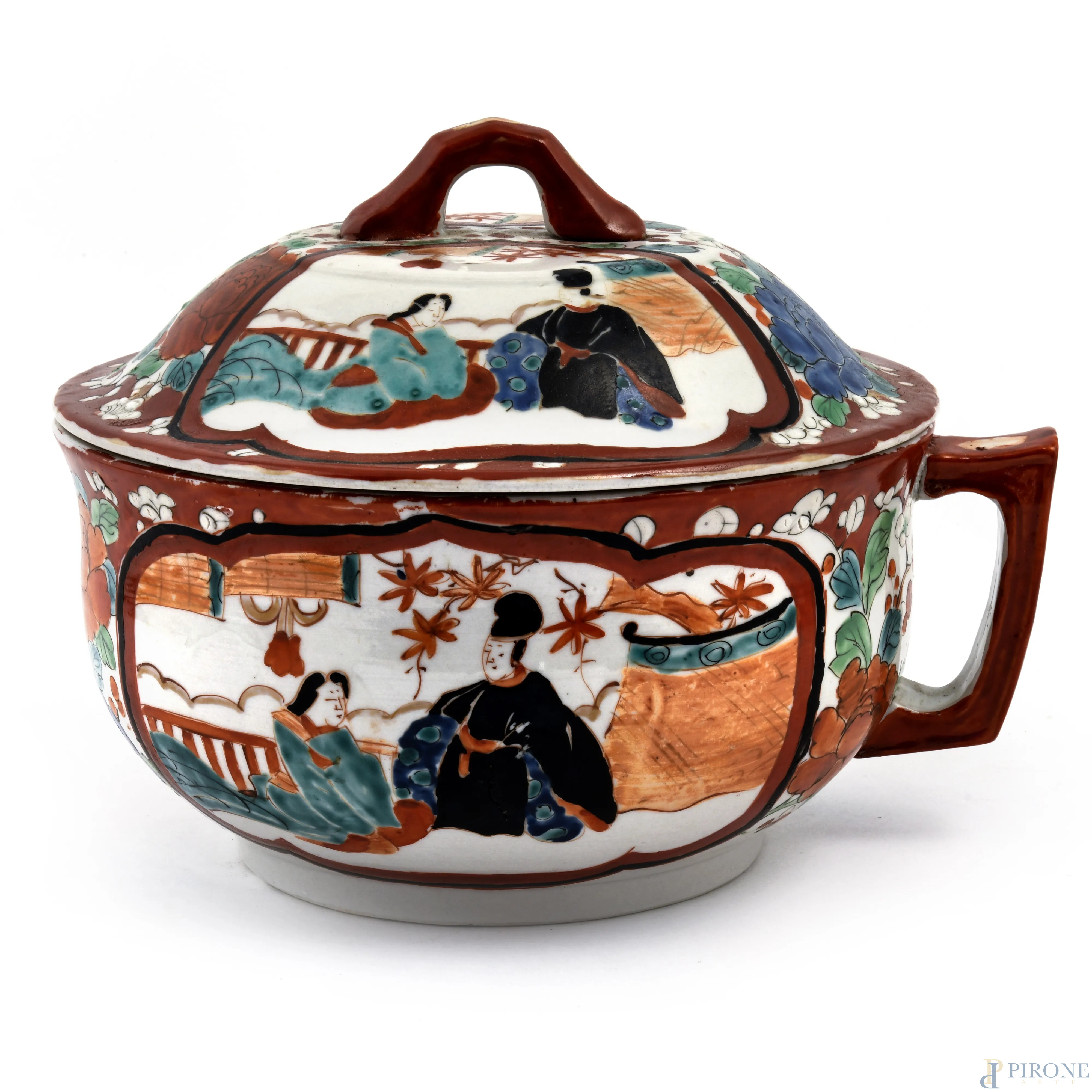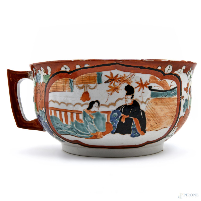 Grande zuppiera monoansata in ceramica decorata in policromia con scene di genere orientali e fiori, XX secolo, cm 17,5x22, (difetti, cadute di smalto, felature, sbeccature)