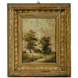 Il sentiero nel villaggio, XIX-XX secolo, olio su tavoletta, cm 20x15, entro cornice, (piccole cadute di colore)
