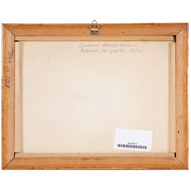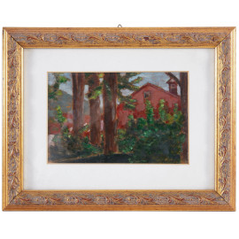 La casa rossa nel bosco, XX secolo, olio su cartone, cm 18x24, entro cornice, (cartone ondulato e imbarcato)