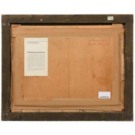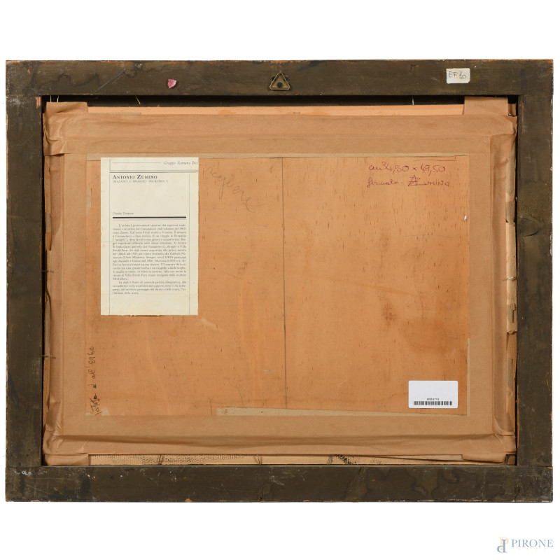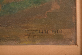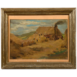 La raccolta del fieno, XX secolo, olio su compensato, cm 34,5x49,5, firmato in basso a destra, entro cornice, (lievi difetti)