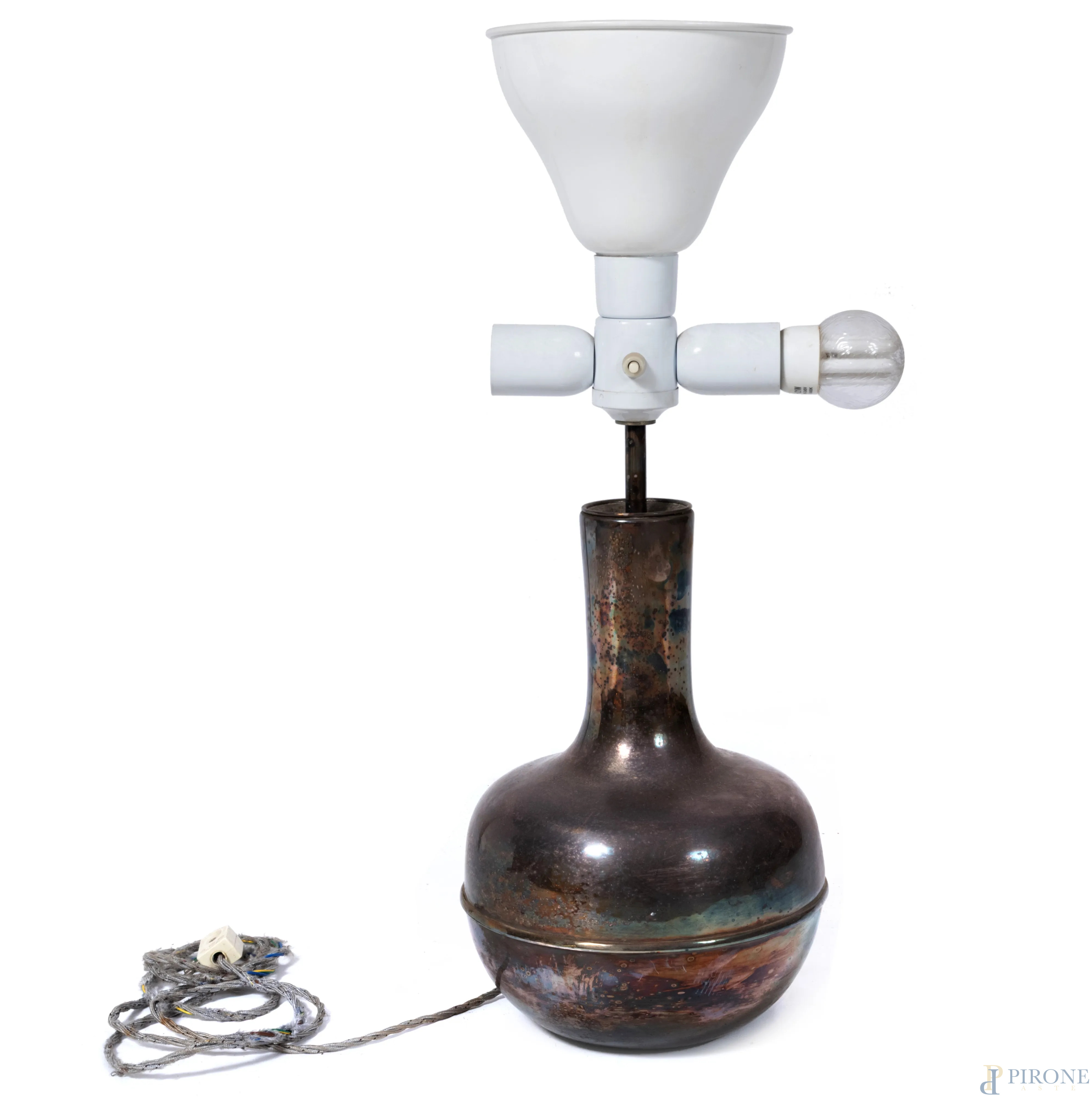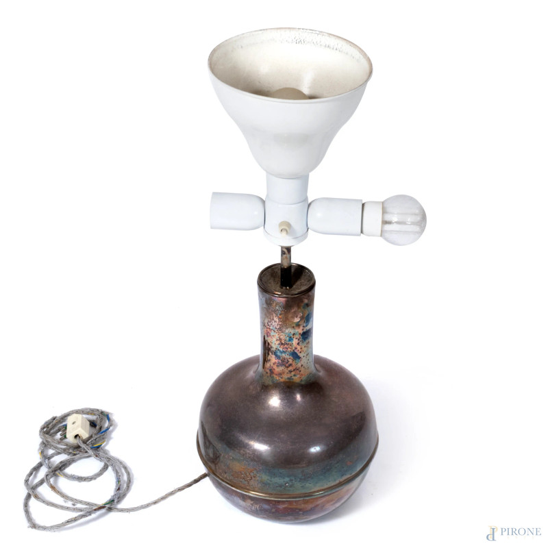 Lampada a tre luci con base in metallo argentato, XX secolo, altezza cm 62, (segni di usura, graffi, da revisionare)
