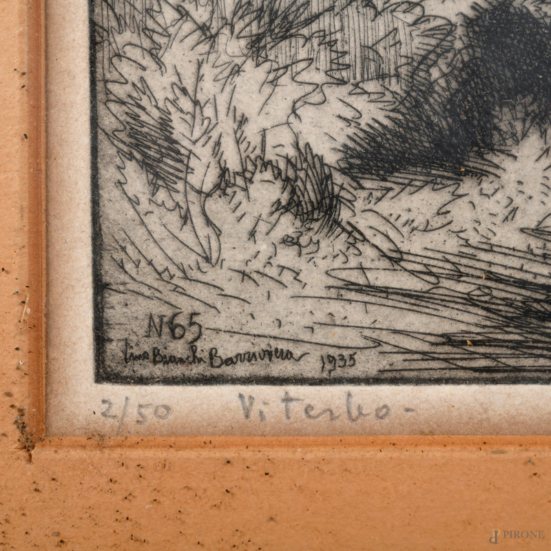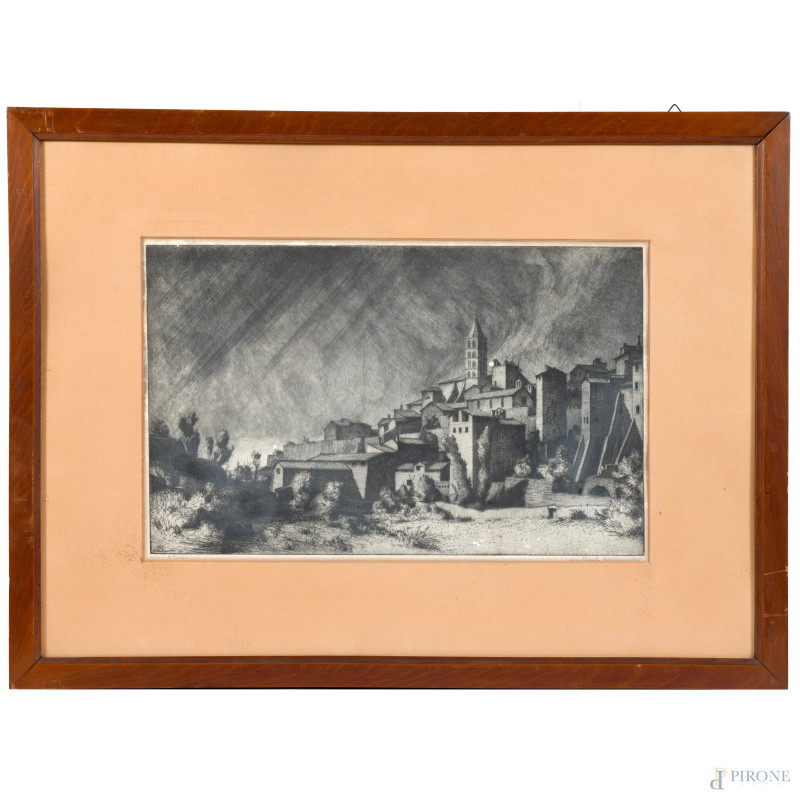 Lino Bianchi Barriviera (1906), Veduta di paese con chiesa, XX secolo, stampa, cm 30x46, entro cornice e passepartout