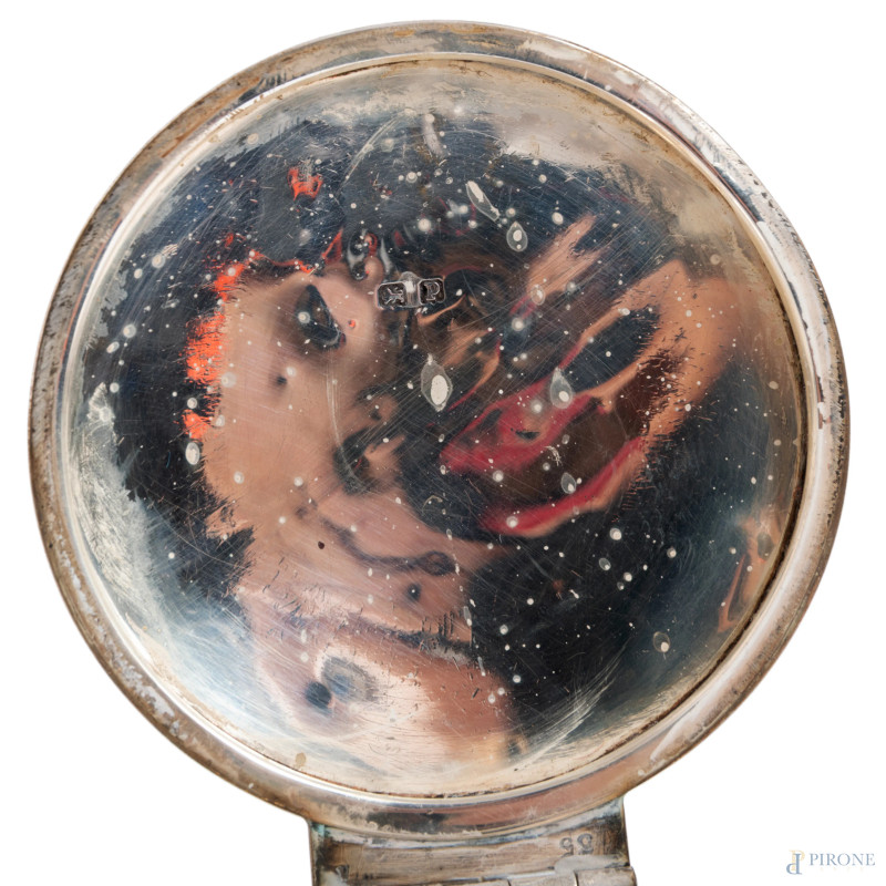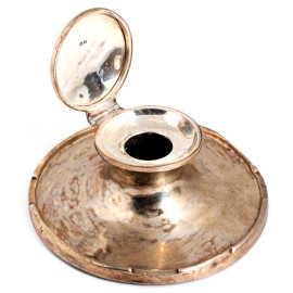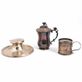 Lotto composto da calamaio, portatazzina e versatoio in argento, altezza massima cm 10,5 , peso lordo gr 750
