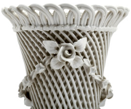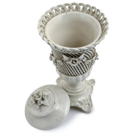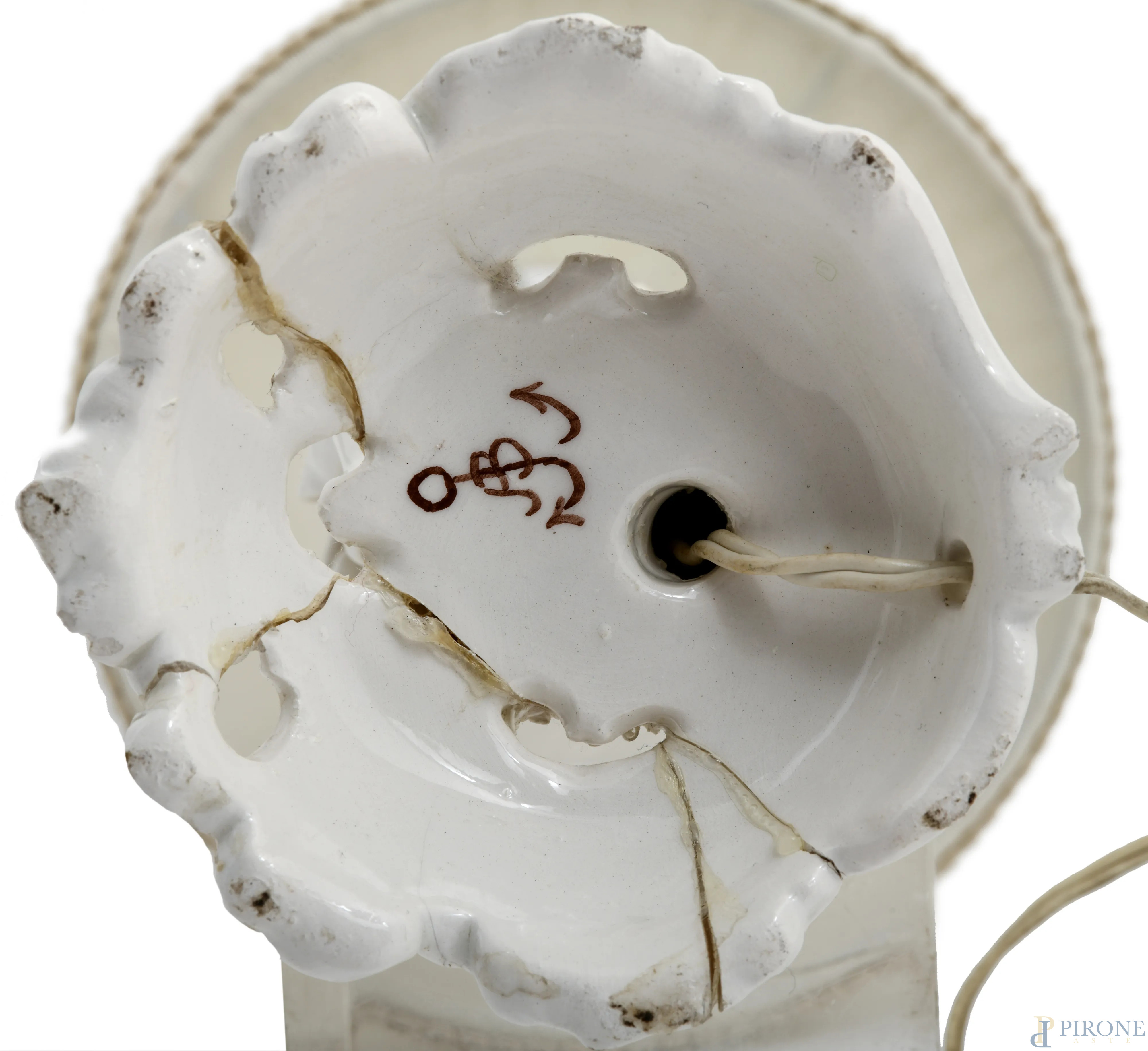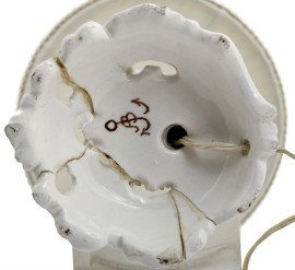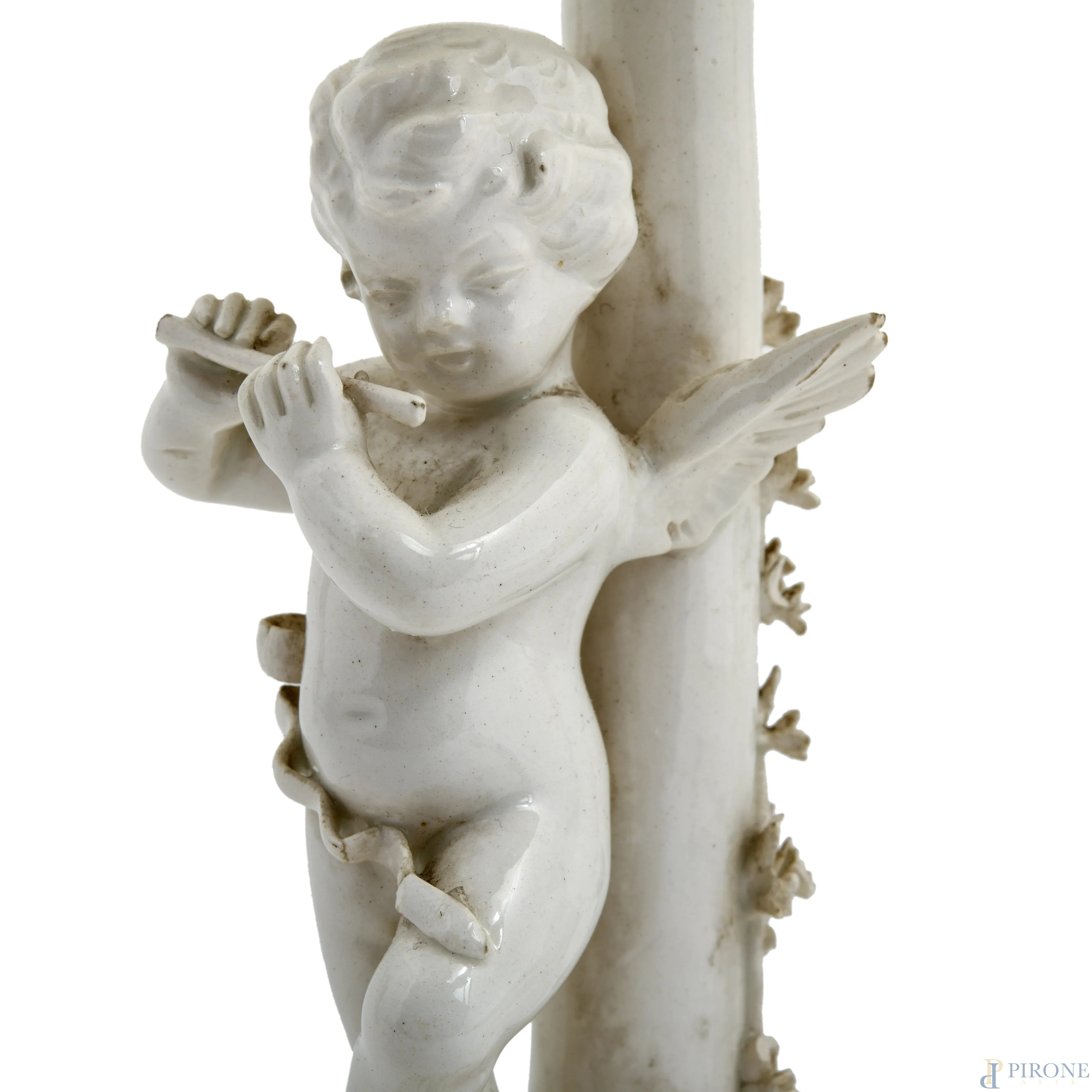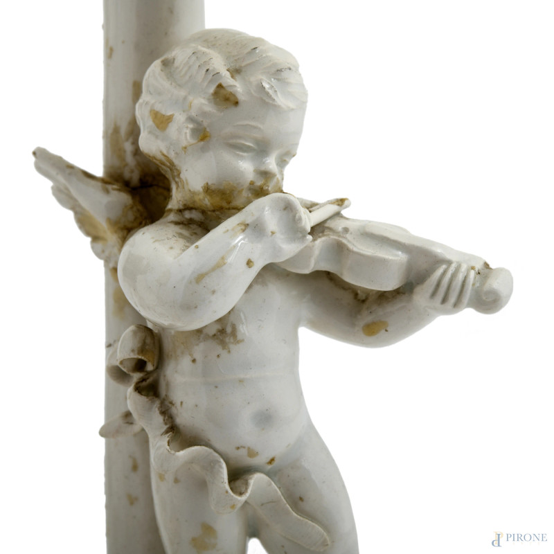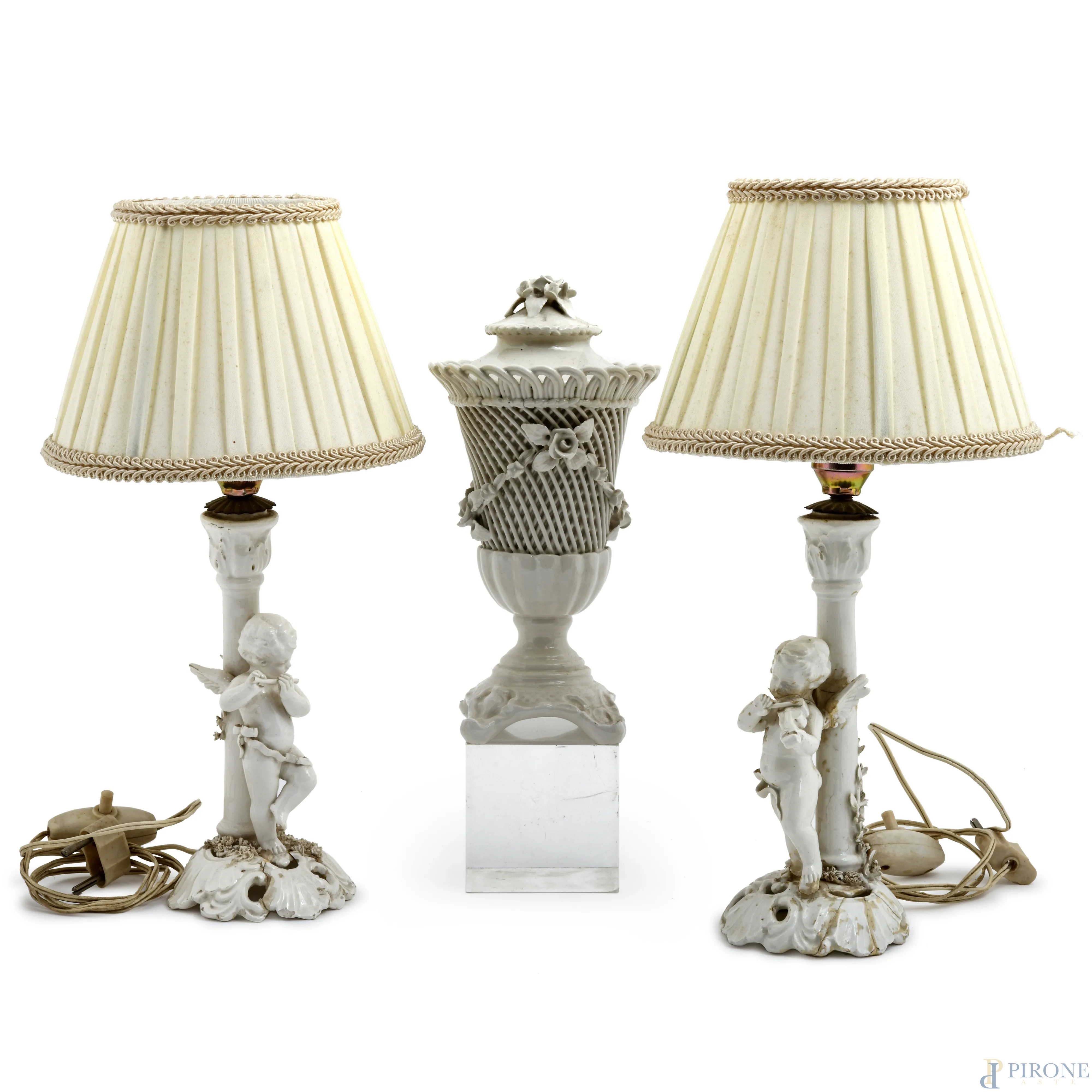 Lotto composto da due lampade in porcellana a foggia di putti musicanti con paralume in tessuto bianco e un porta bonbon in porcellana con decori floreali a rilievo, XX secolo, altezza massima cm 31,5 (difetti, rotture, restauri)