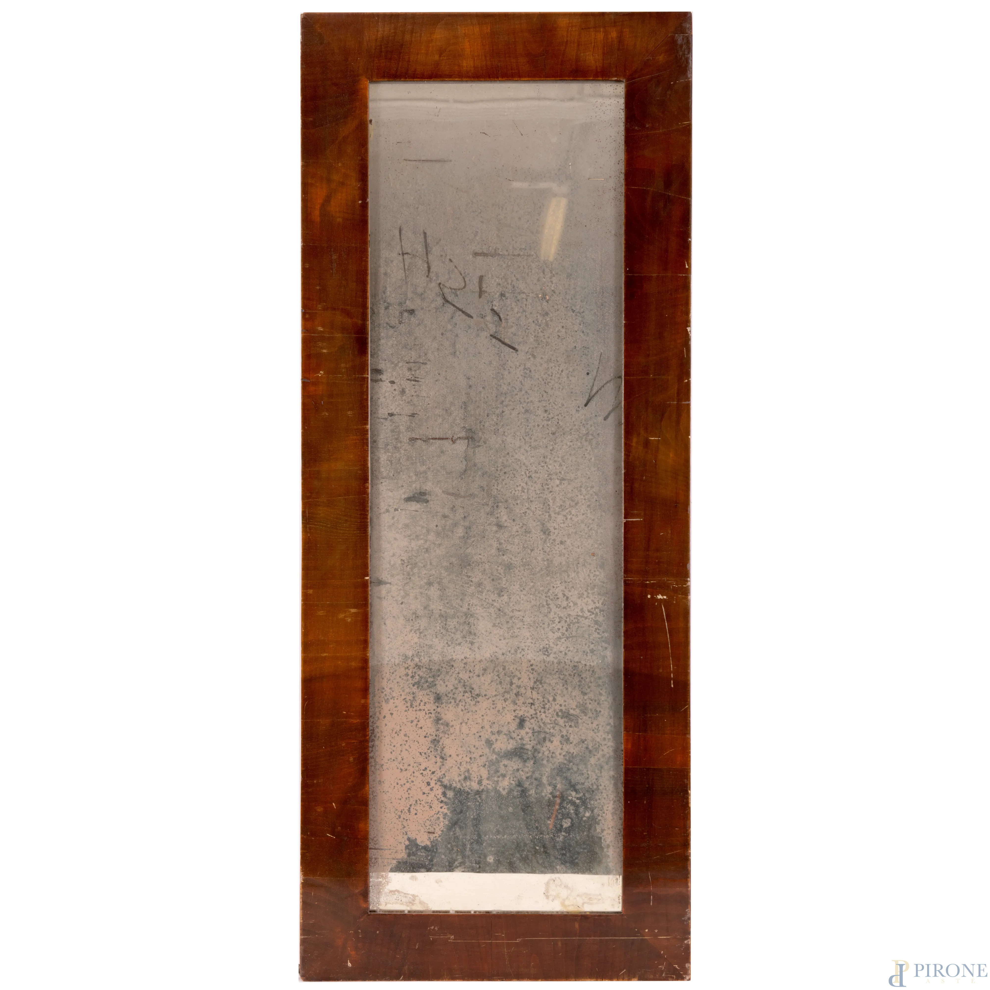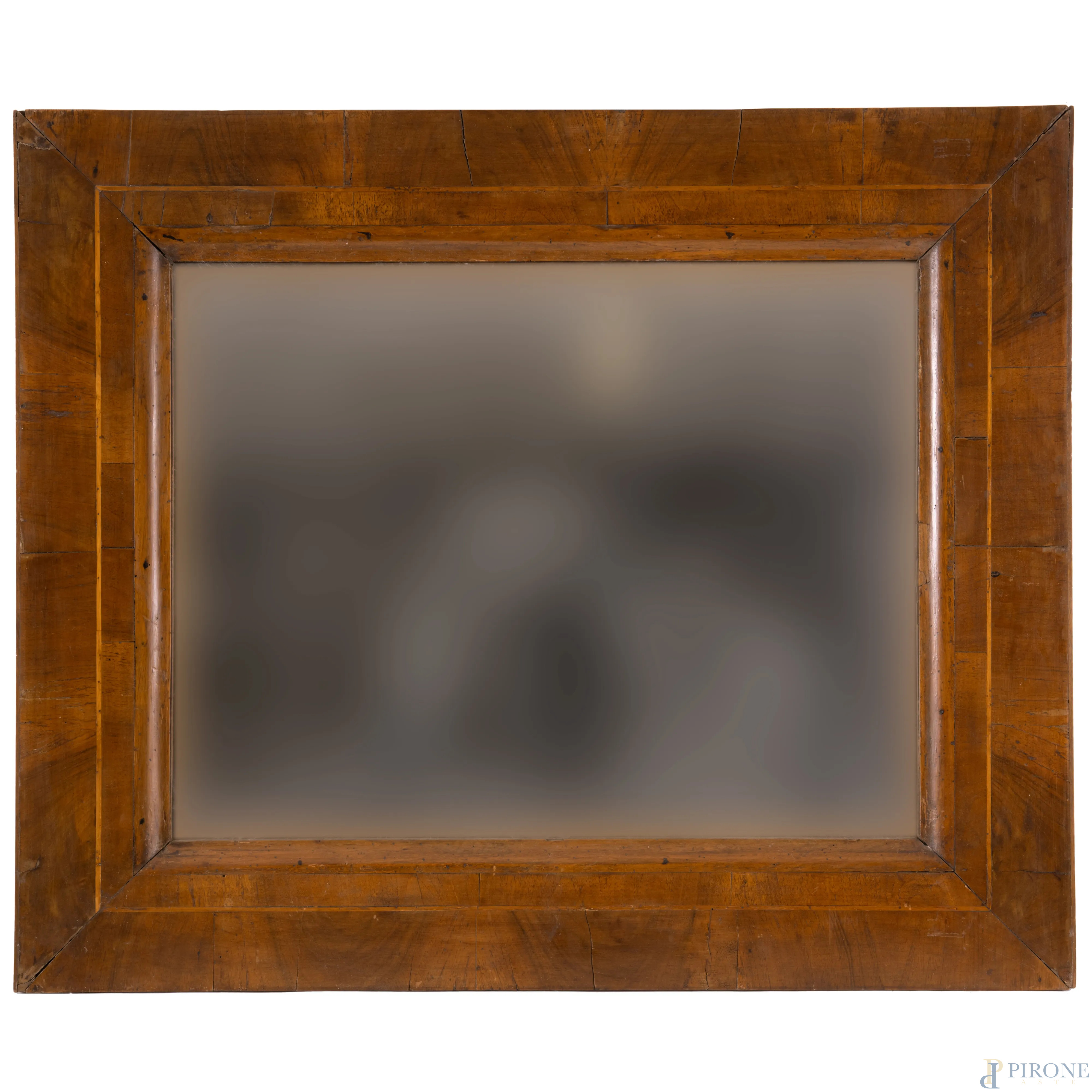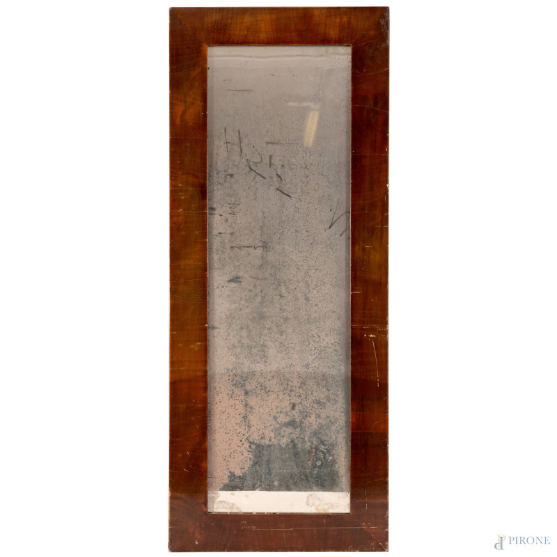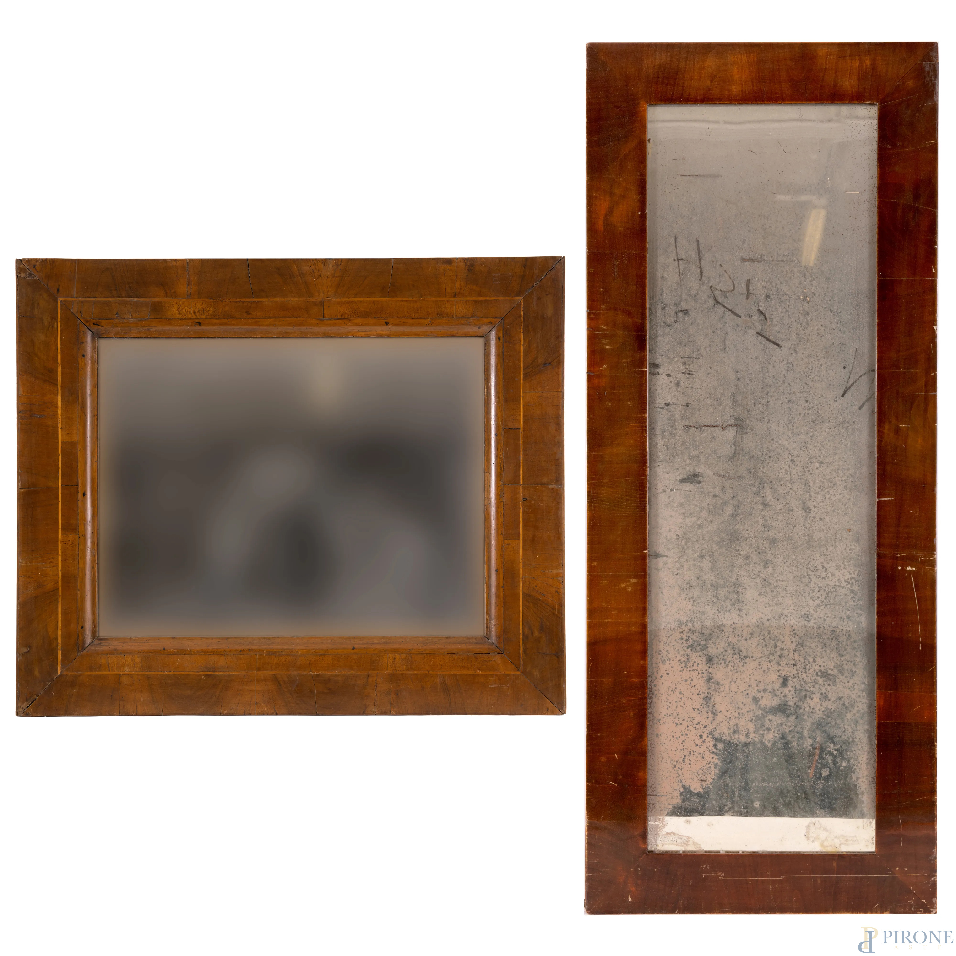 Lotto composto da due specchiere in legno impiallacciato, XX secolo, misure masime cm 82,5x69 (scalfiture, difetti, rotture, mancanze)