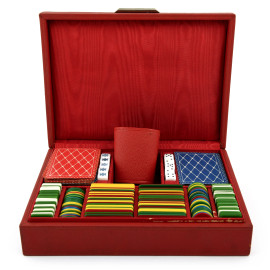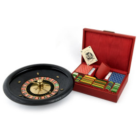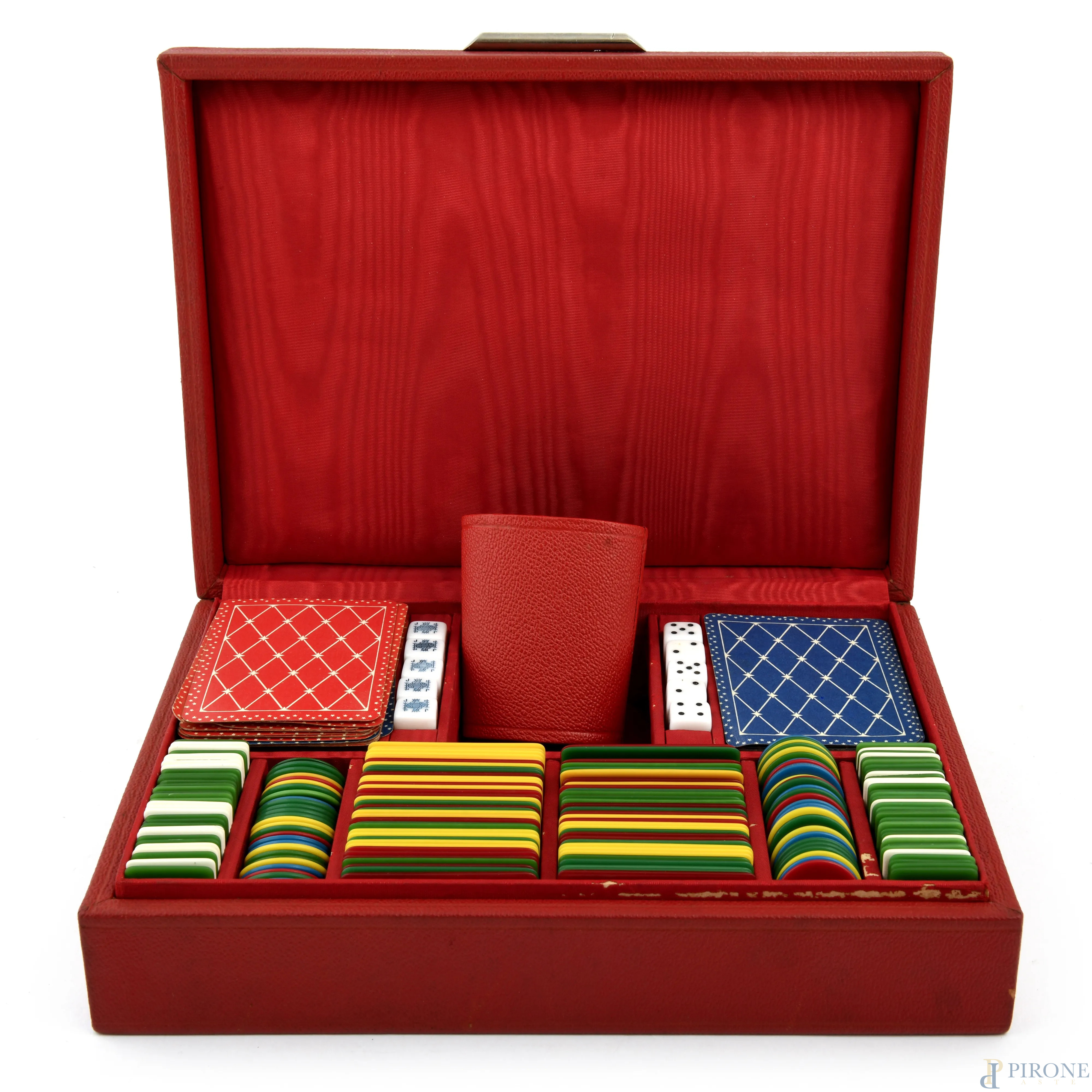Lotto composto da scatola da gioco con fiches, carte da poker e dadi e una roulette da viaggio in plastica e metallo, XX secolo, diametro roulette 30, (segni di usura)