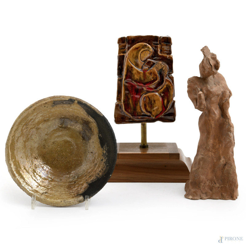 Lotto di 3 oggetti in terracotta, XX secolo, misure massime cm 23,5x18, (difetti)