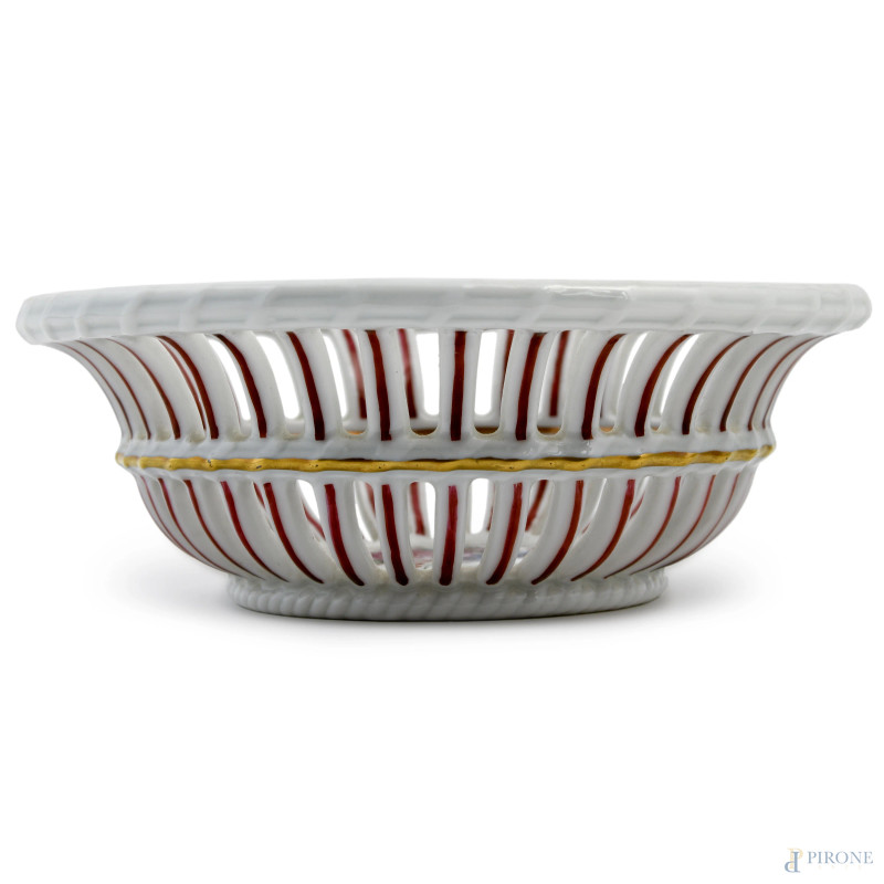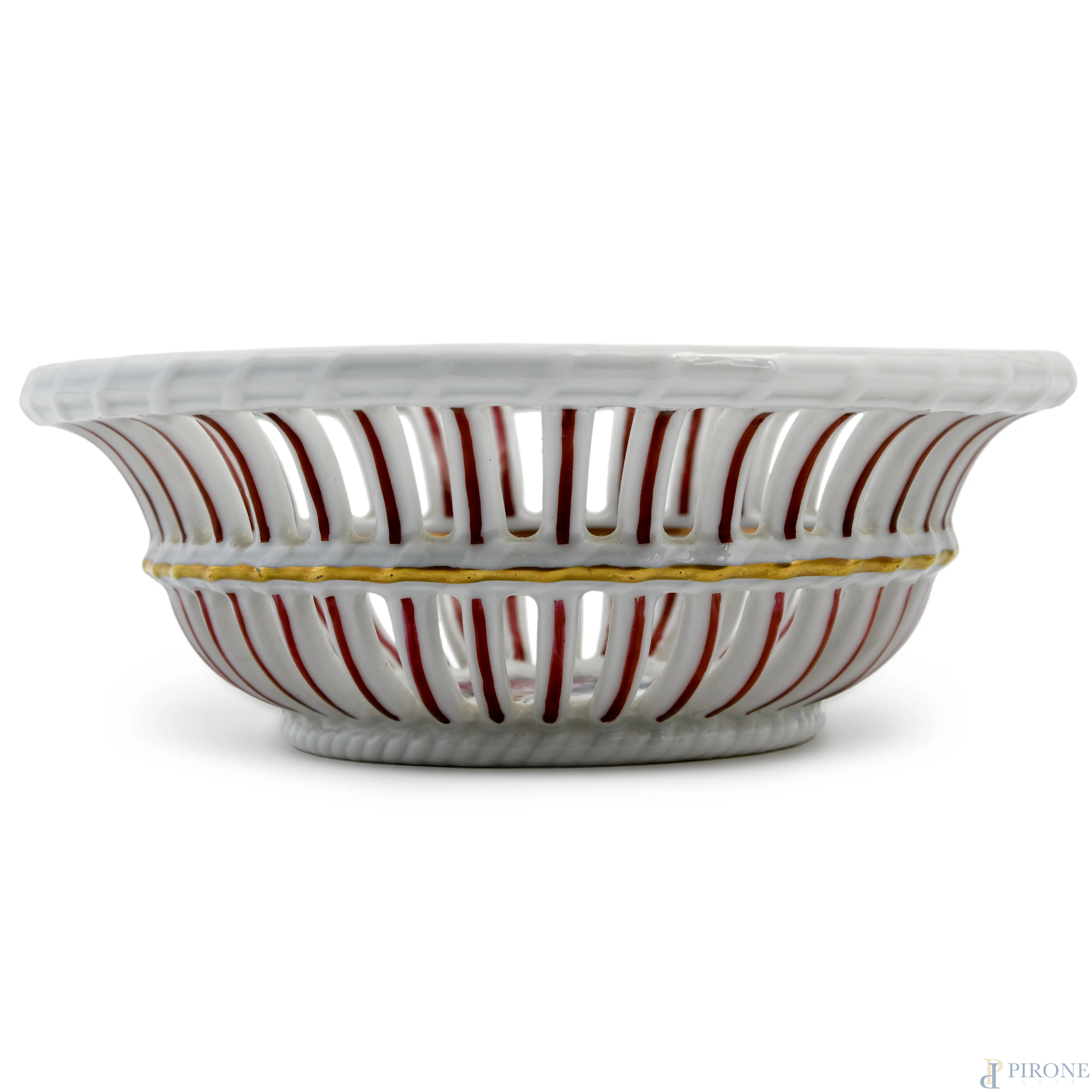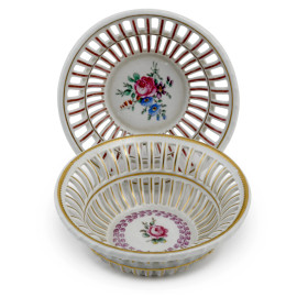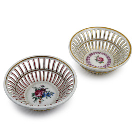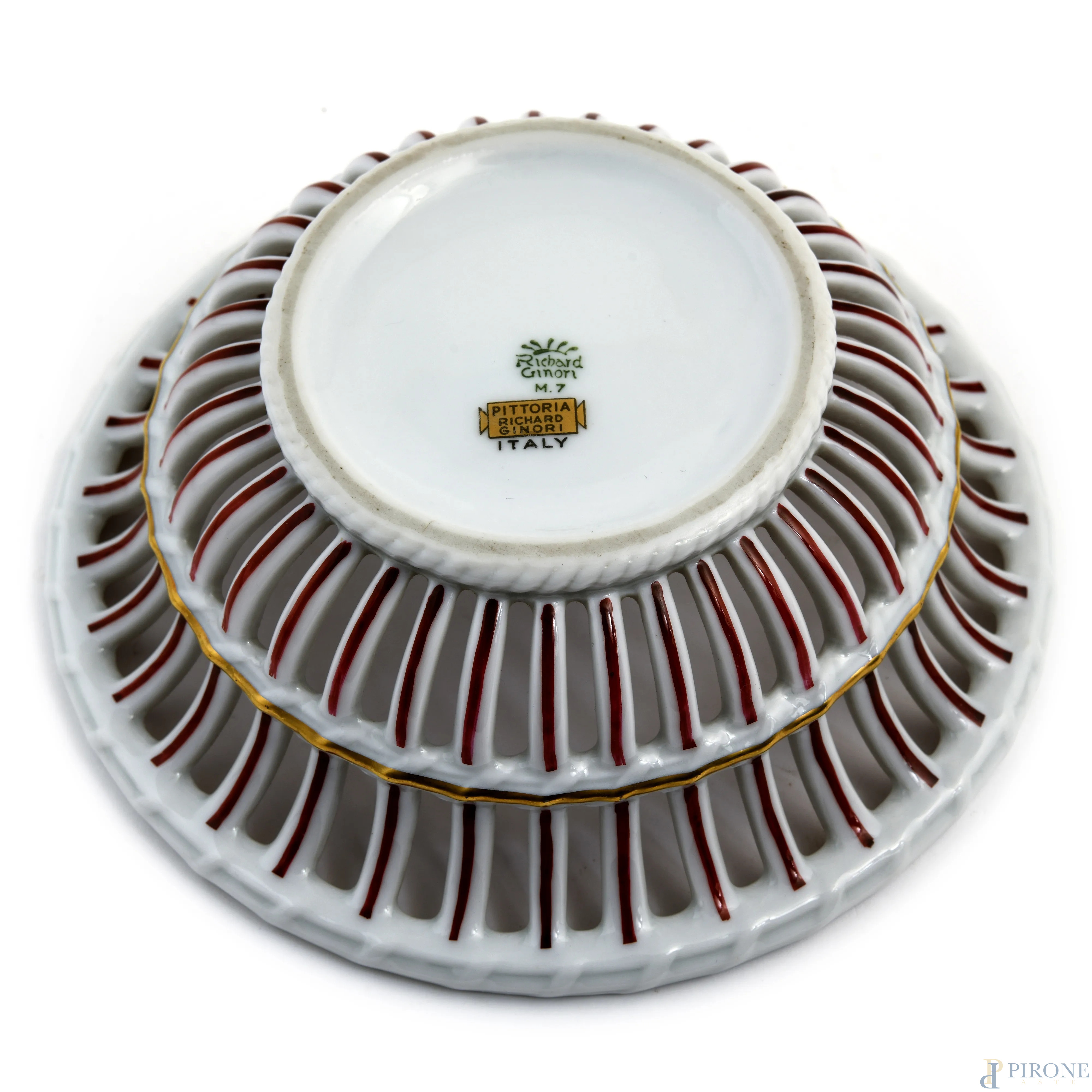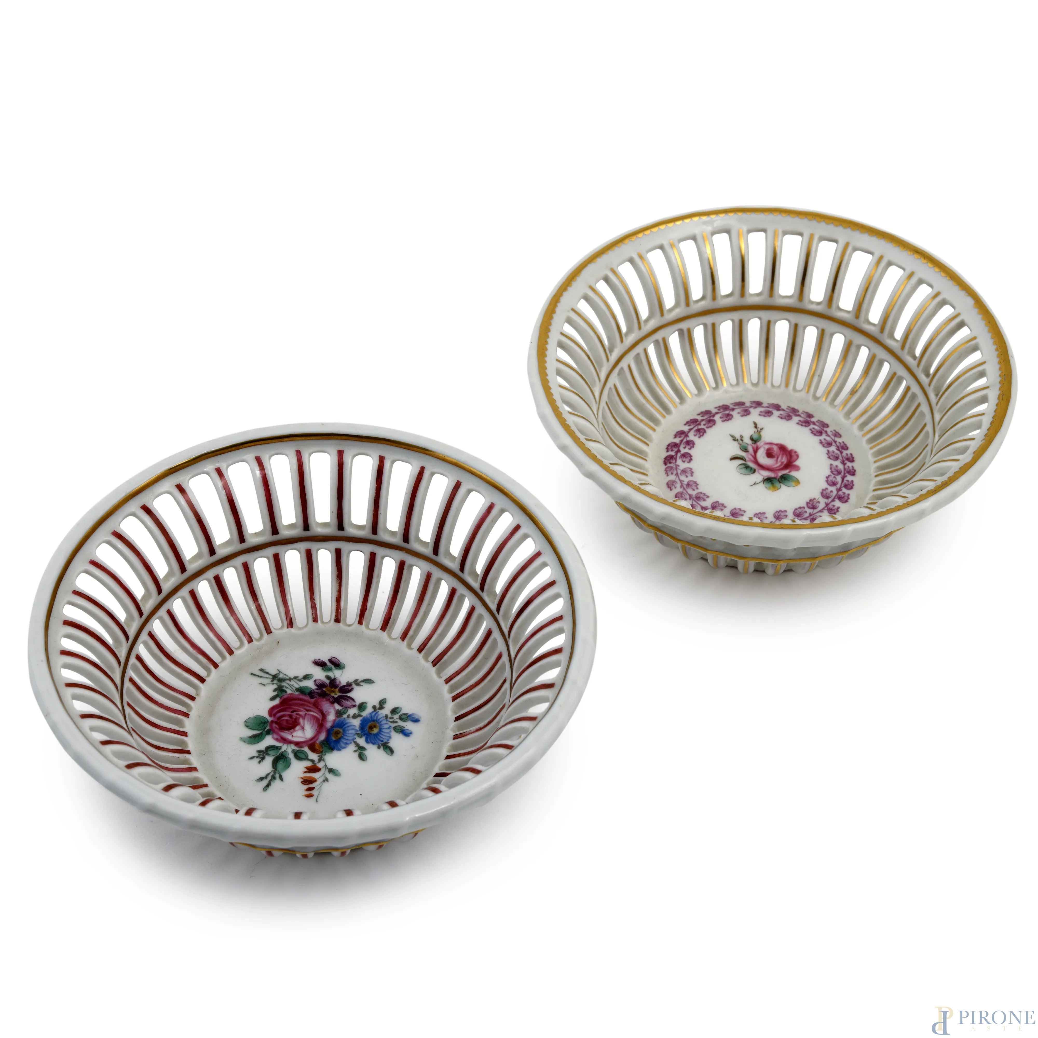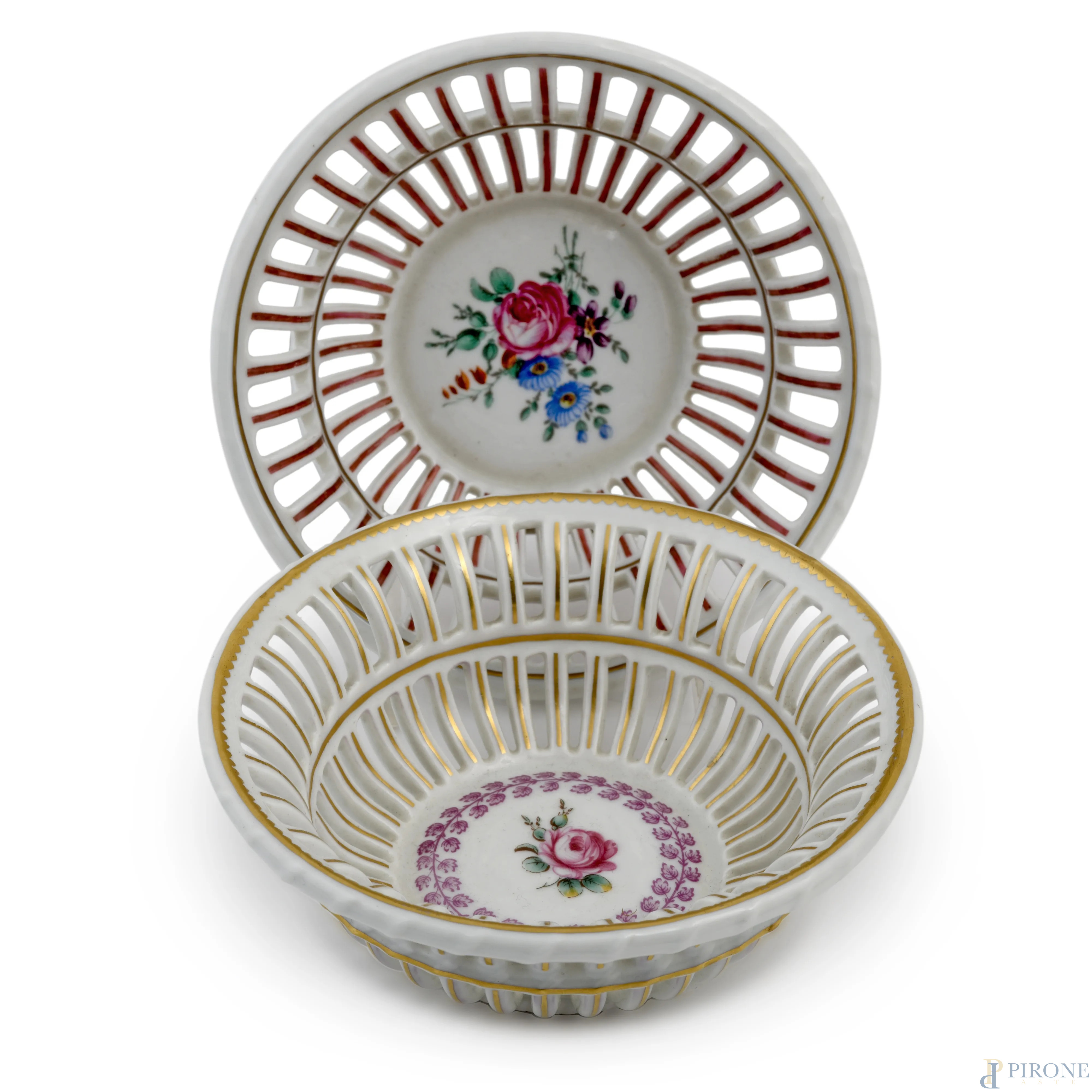 Lotto di due cestini traforati in porcellana Richard Ginori con decori floreali al cavetto, XX secolo, misure massime cm 6x15,5