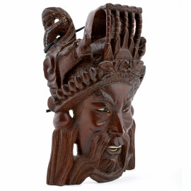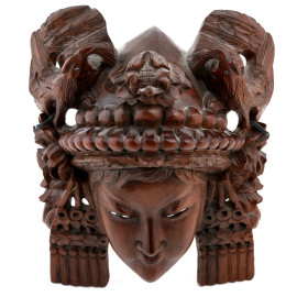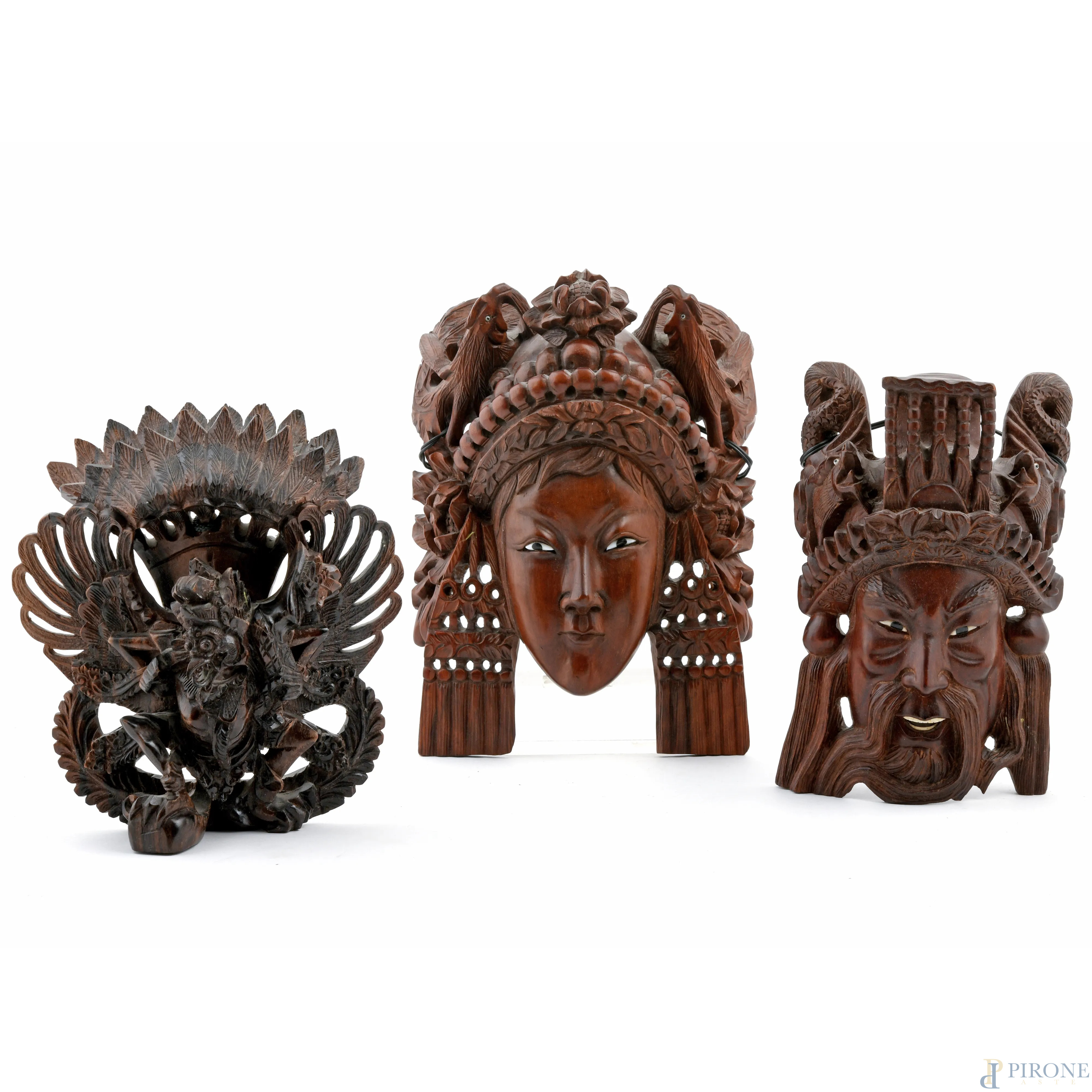 Lotto di due maschere e una scultura a rilievo in legno di teak, XX secolo, misure massime cm 25,5x19,5x11, (scalfiture, difetti, segni di usura)
