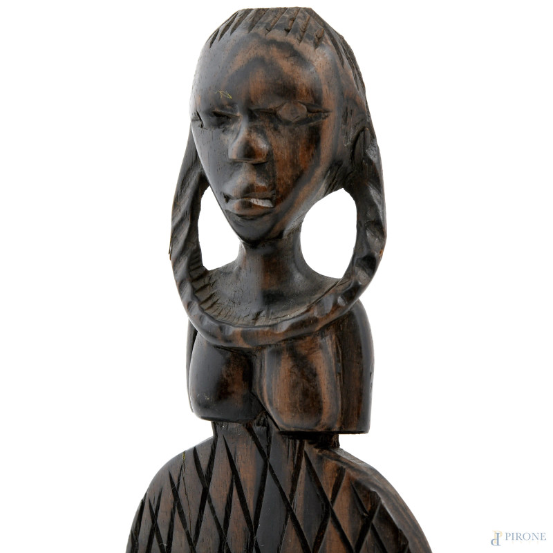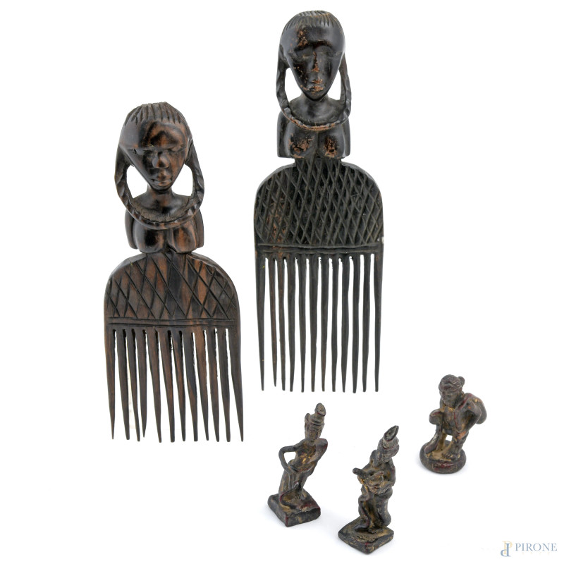 Lotto di due pettini con manico a foggia di figura femminile e tre sculture in legno africane, XX secolo, misure massime cm 25x8,5, (segni di usura del tempo)