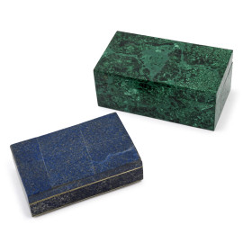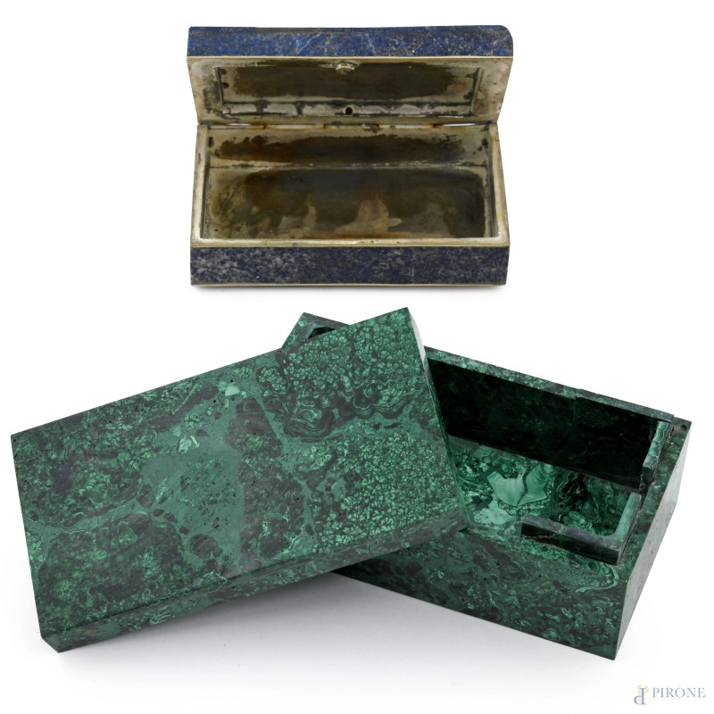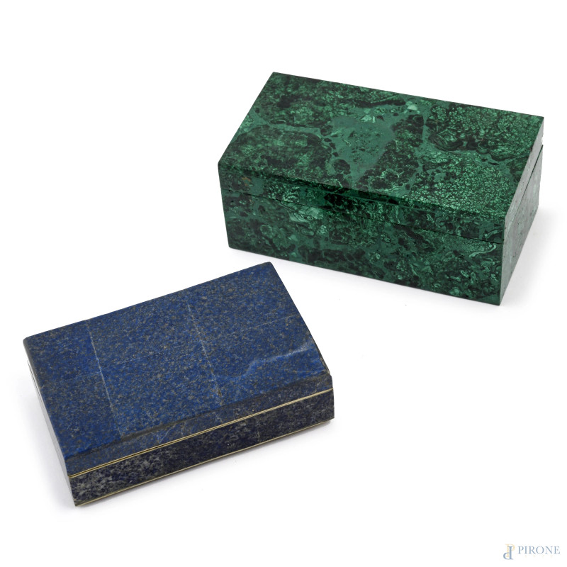 Lotto di due scatole in malachite e metallo rivestita in lapislazzulo, XX secolo, misure massime cm 6x15x8, (segni di usura)
