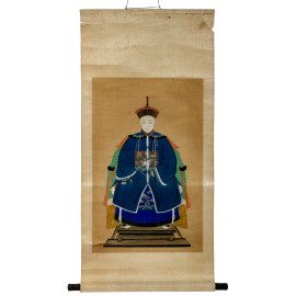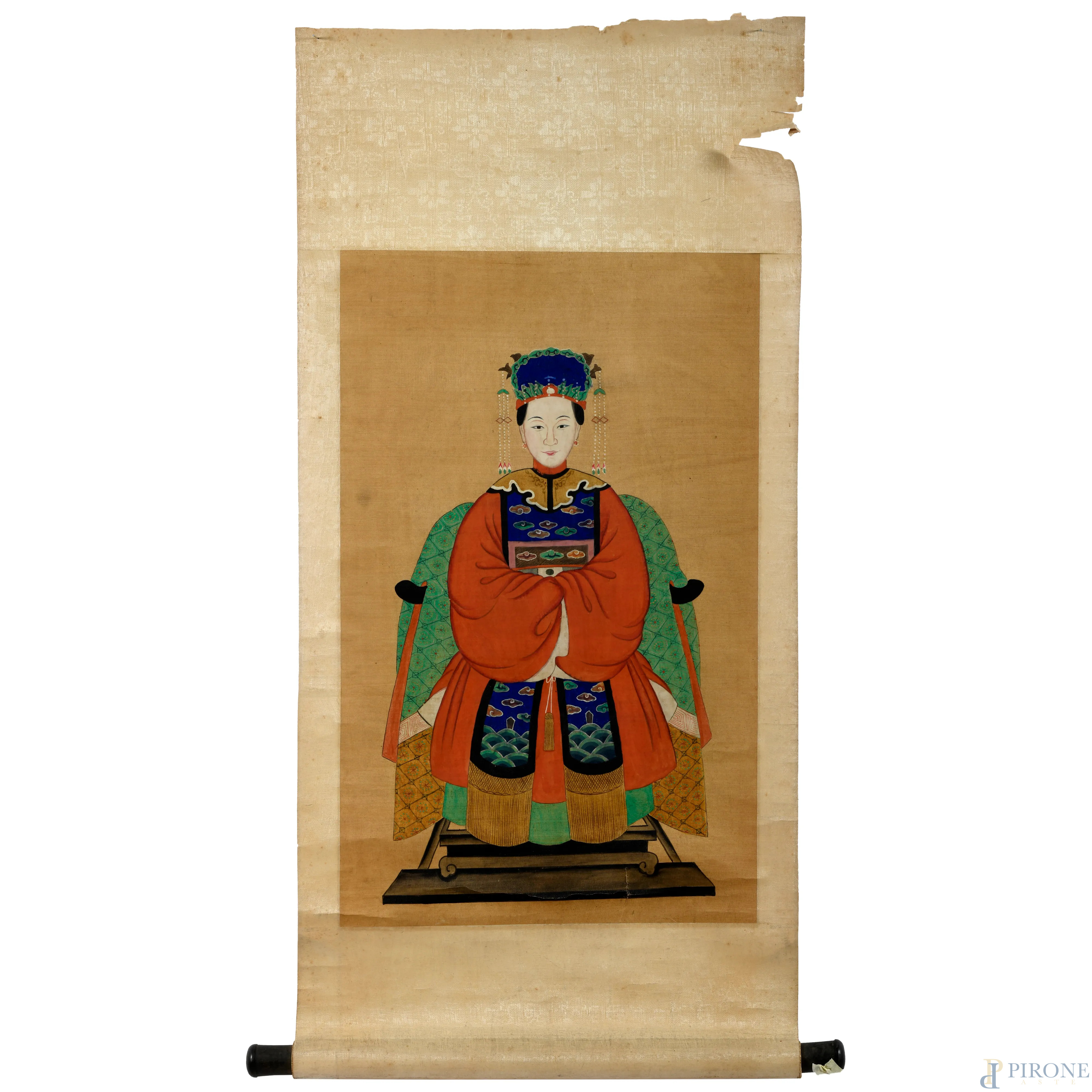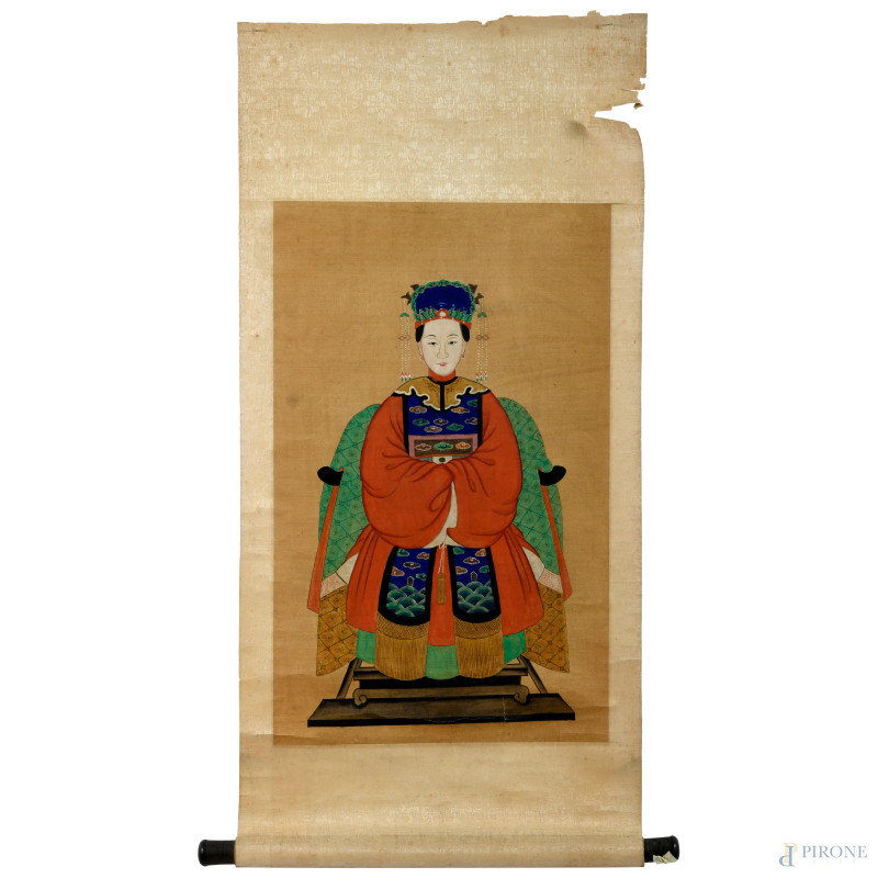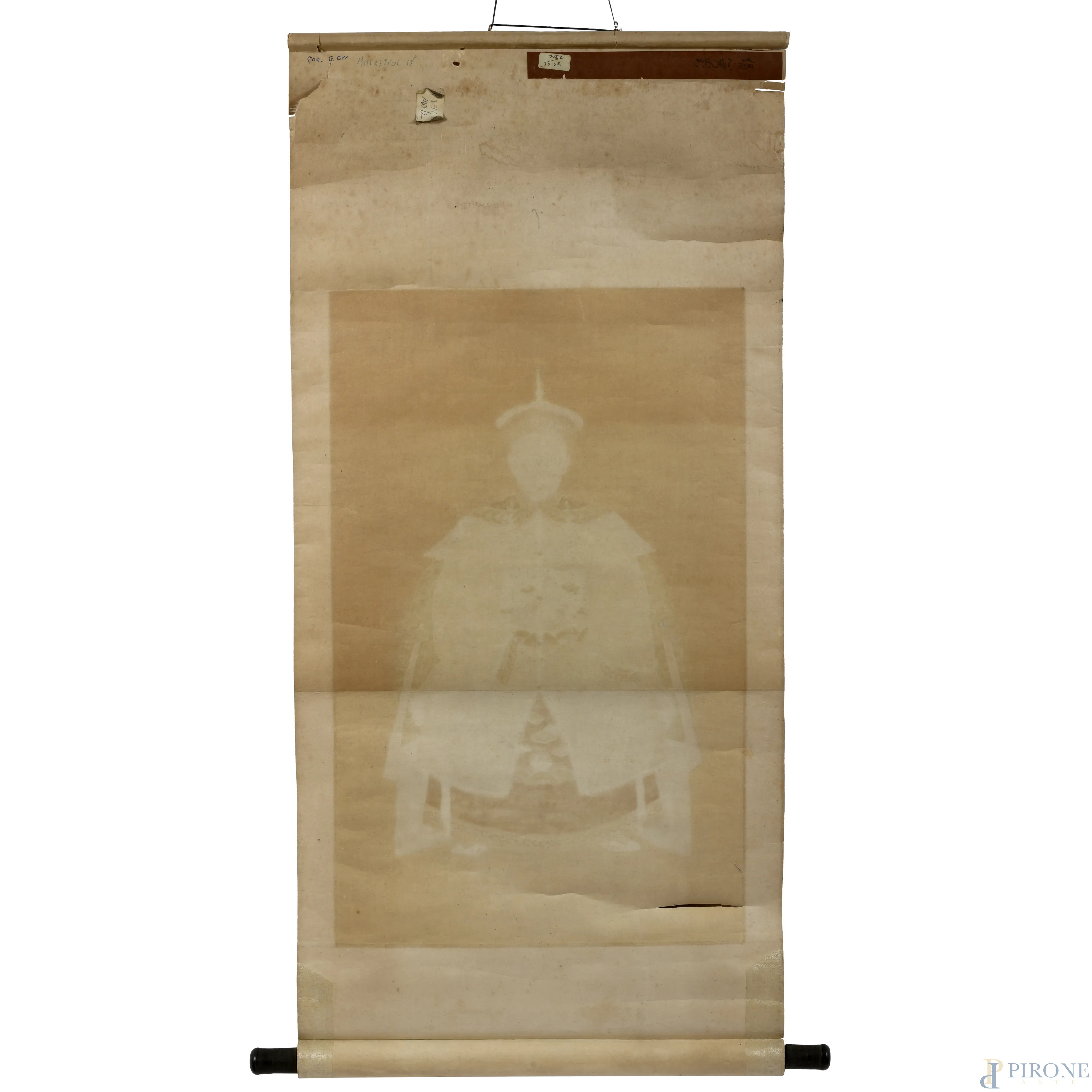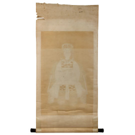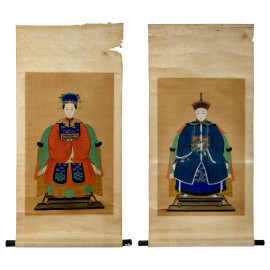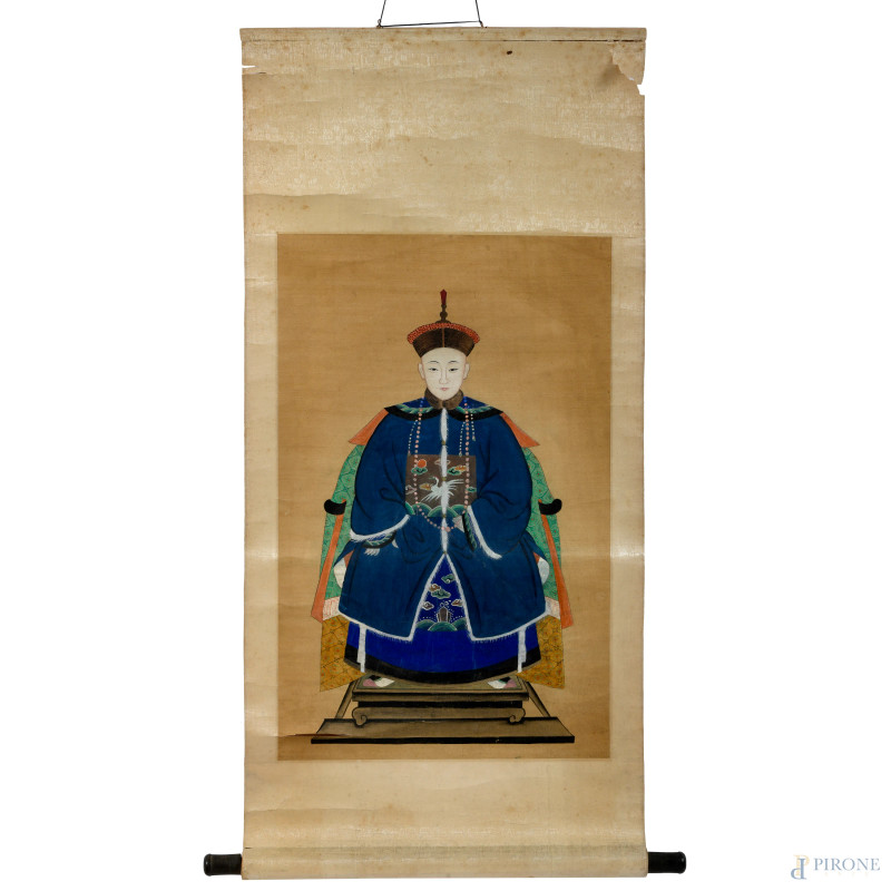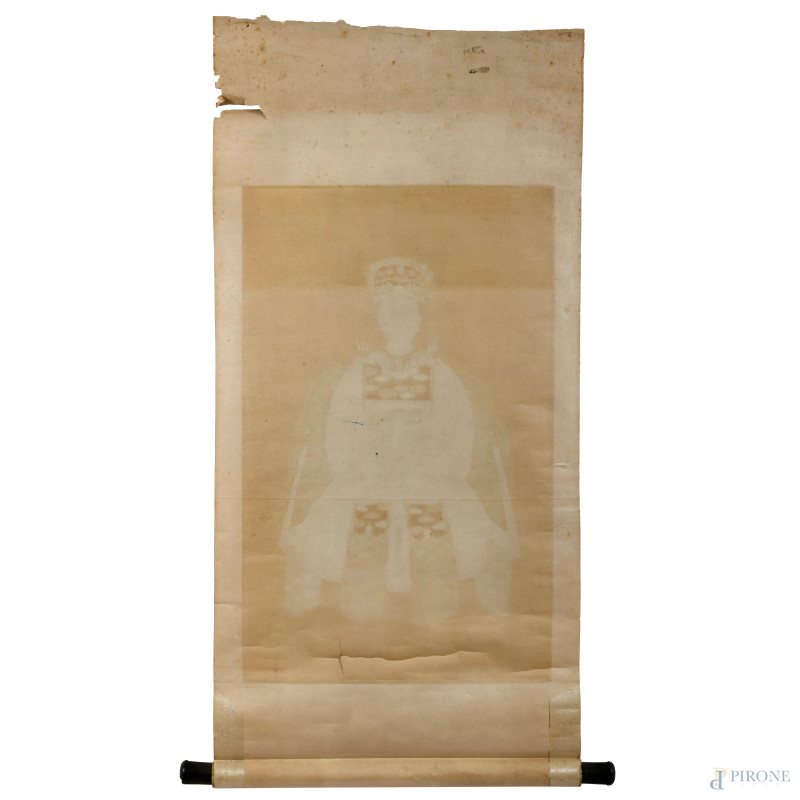 Lotto di due scroll giapponesi raffiguranti dignitari, tecnica mista su carta, misura massima cm 86x40, (rotture, difetti, segni di umidità)