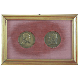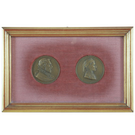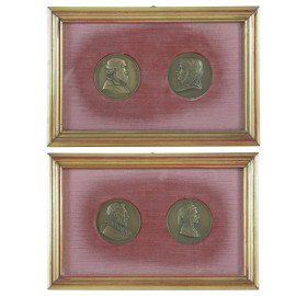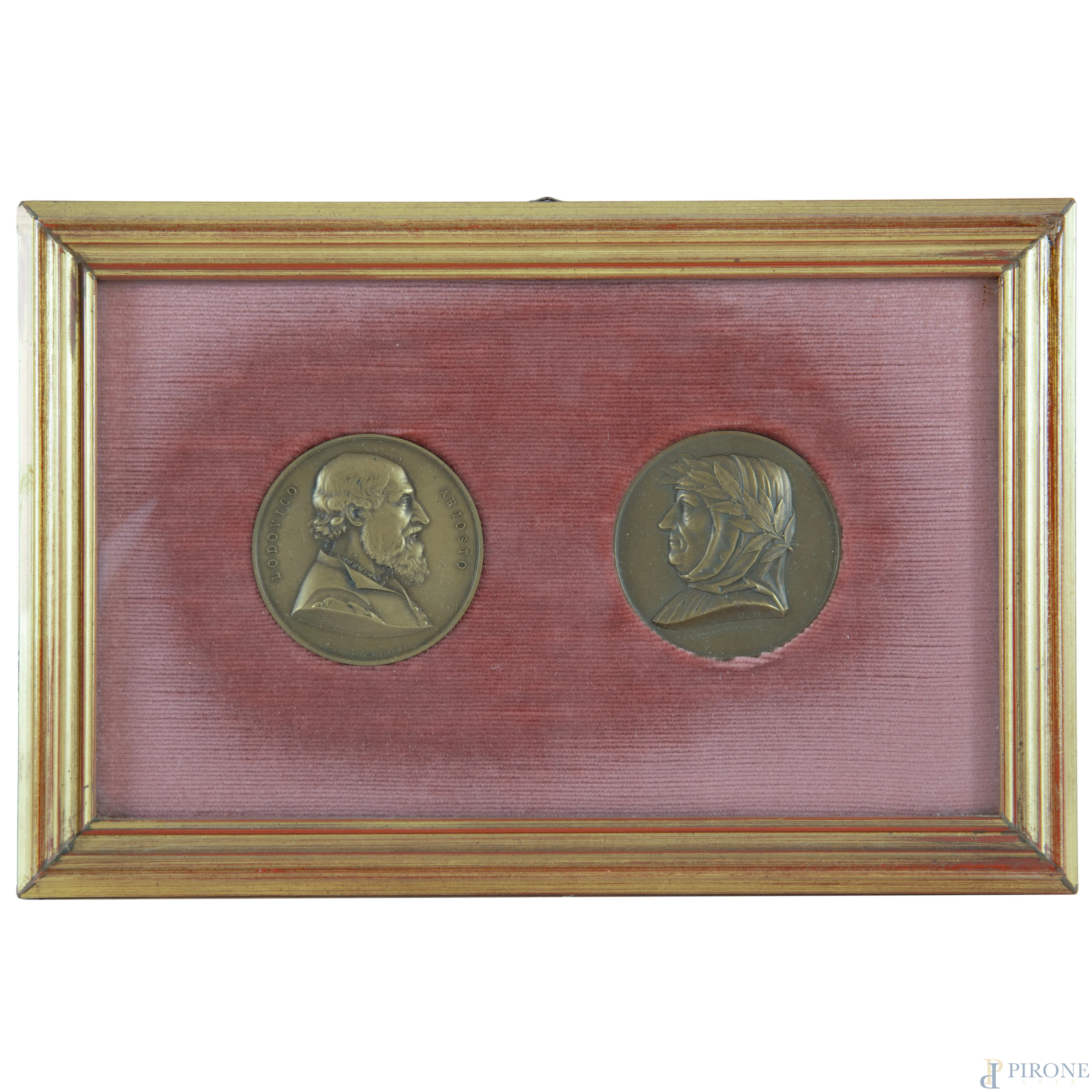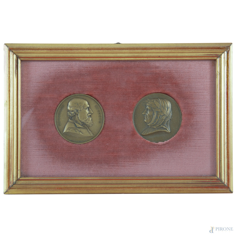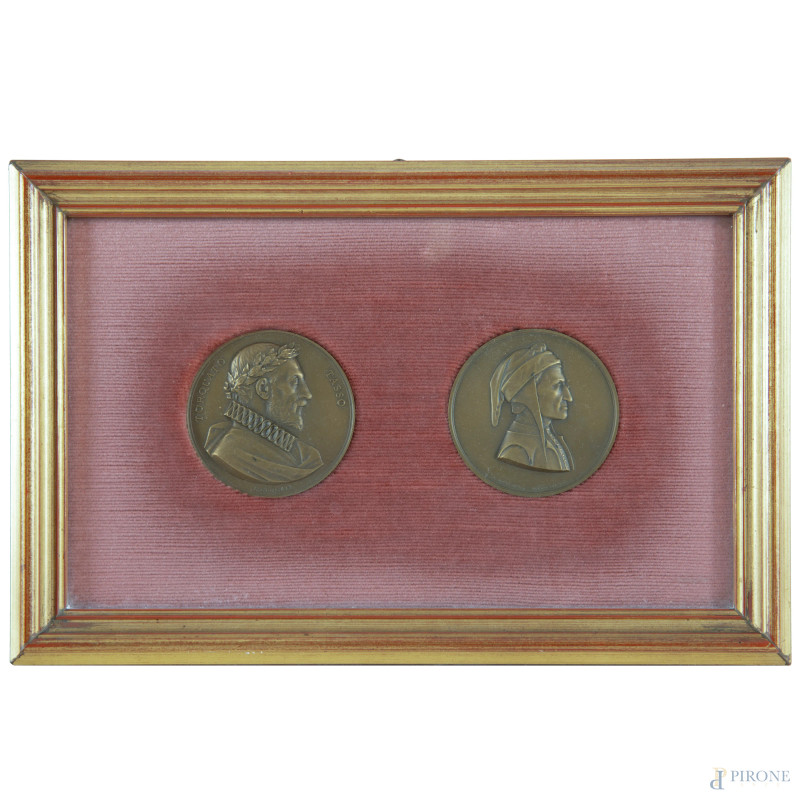 Lotto di quattro medaglie in bronzo raffiguranti letterati (diametro cm 7), a coppie entro cornice (misure massime cm 21x32, XX secolo