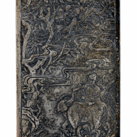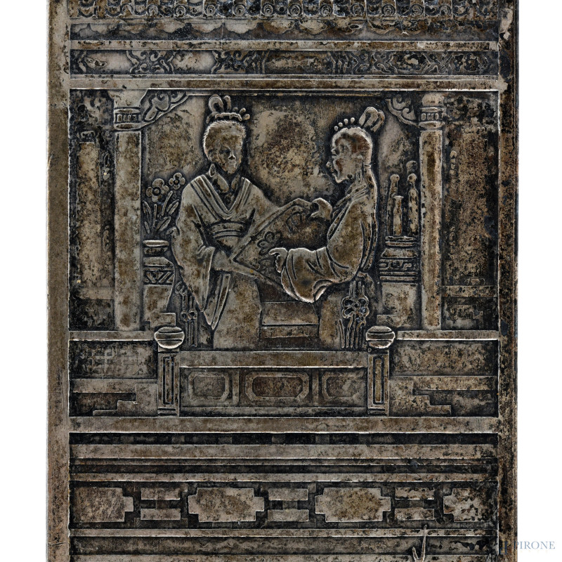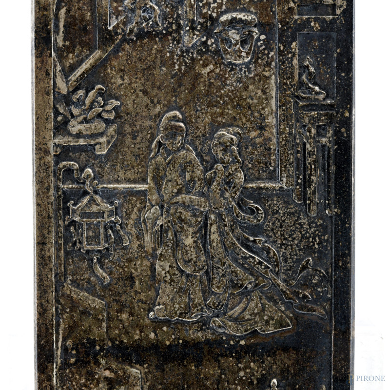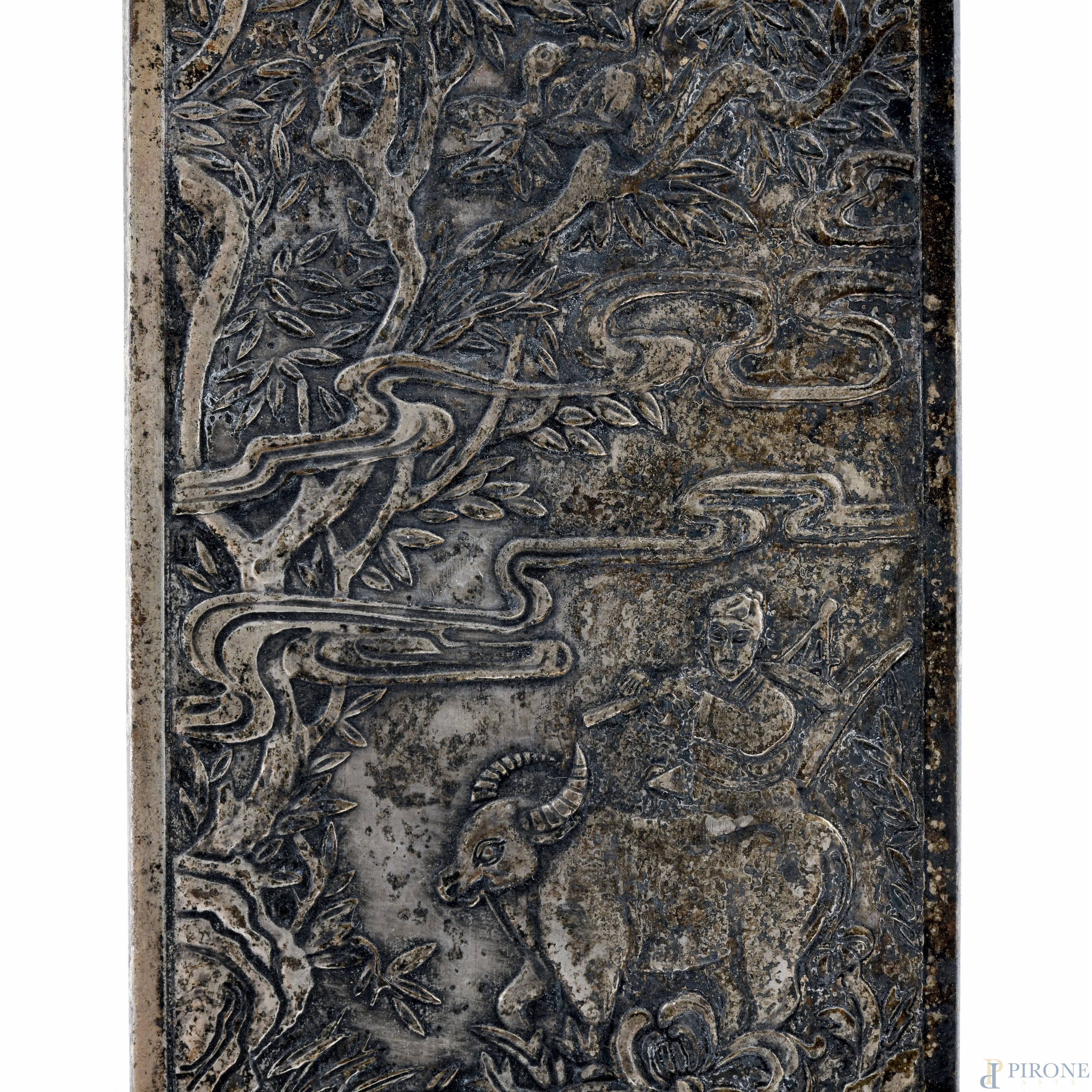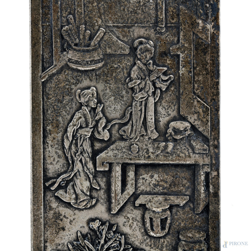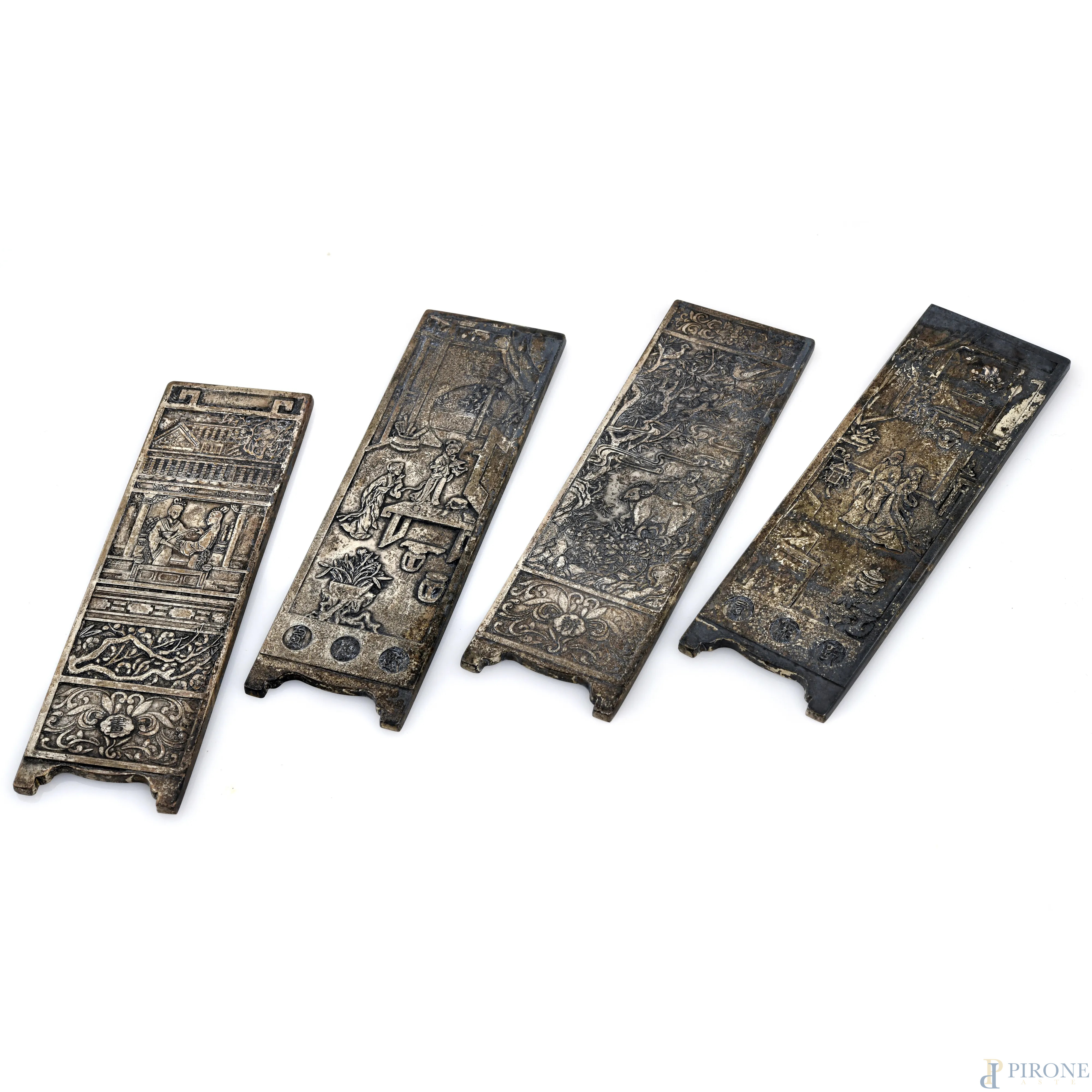 Lotto di quattro placche orientali con rilievi di scene di genere in metallo argentato, cm 16x5